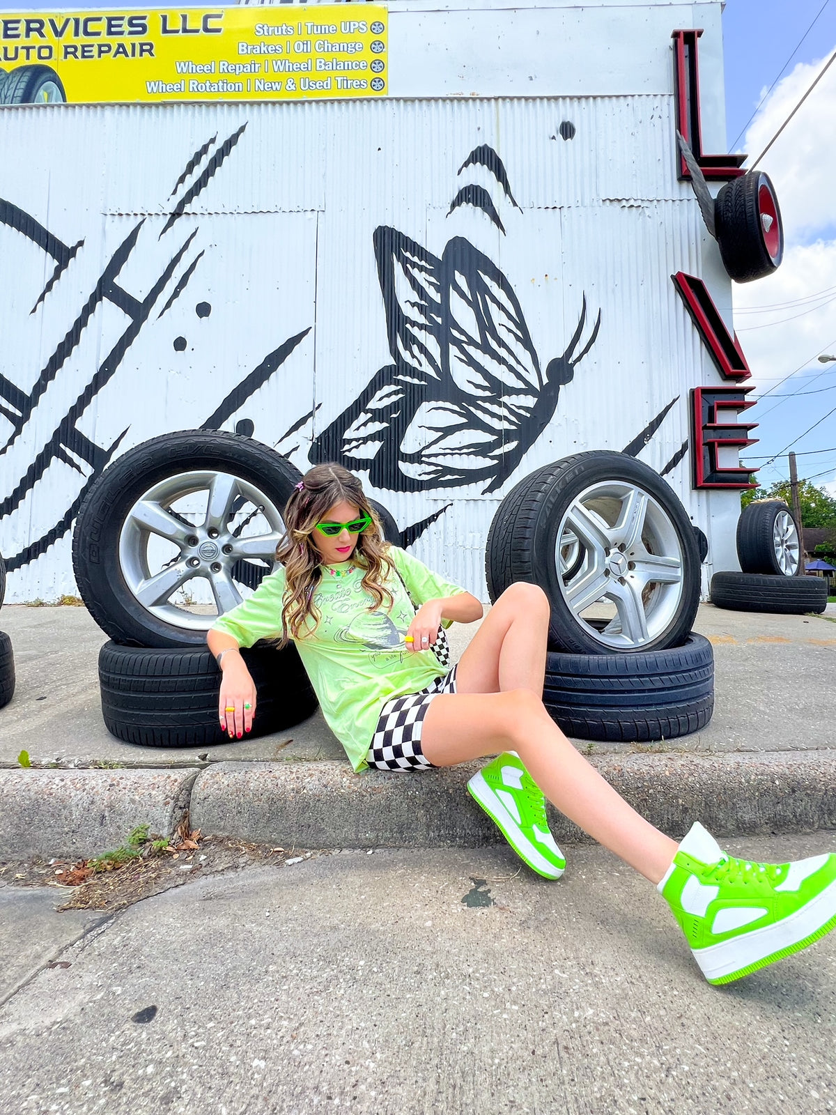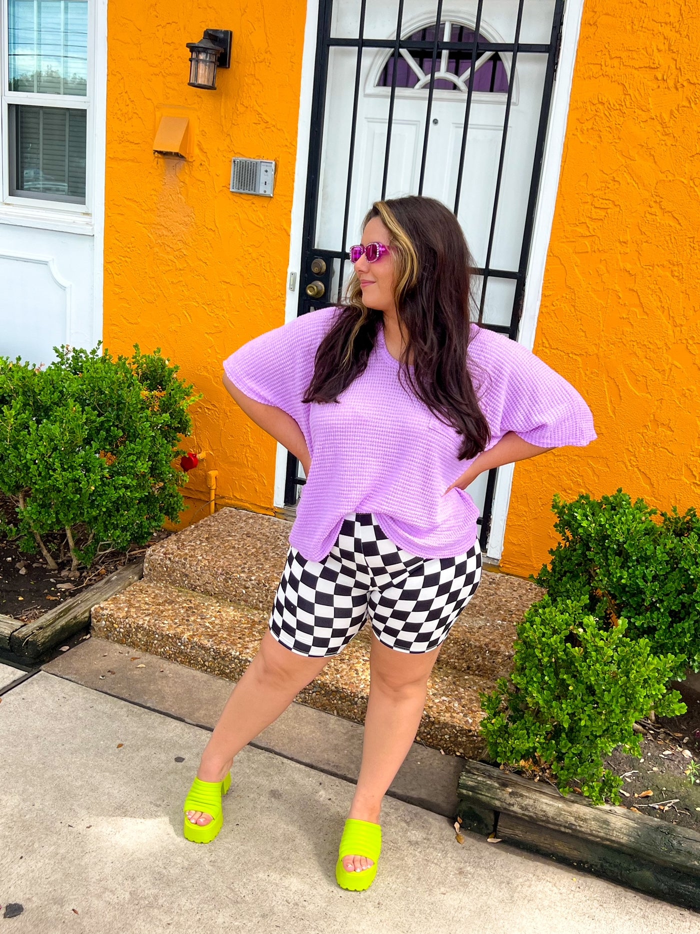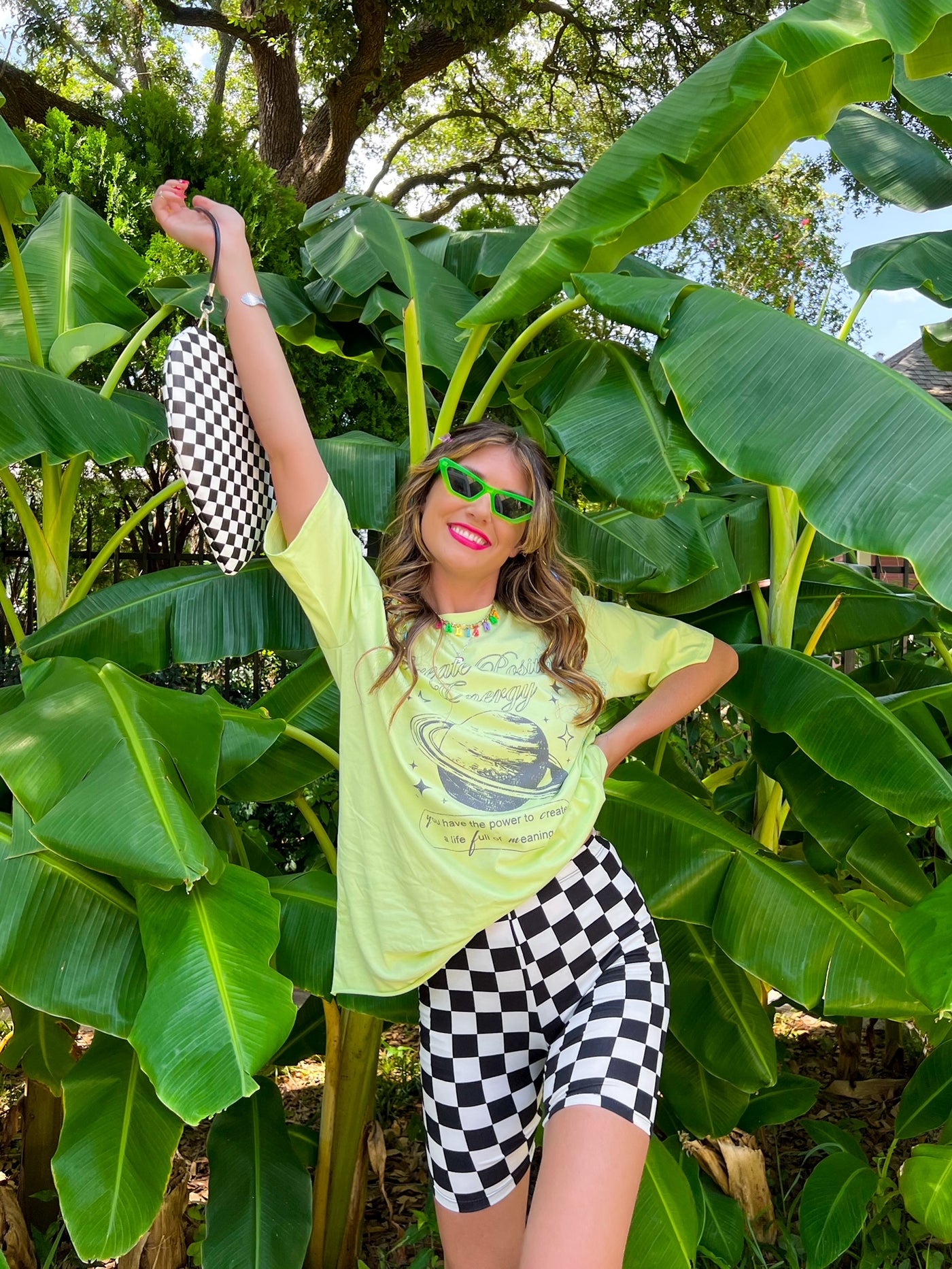 WwwWhen it is just TOO hot, you can't beat a good oversized graphic tee and some fun biker shorts! This fabric is stretchy and soft, perfect to take you on all your summer adventures. And the classic black and white checker print?! Iconic. We paired ours with the Positive Life tee in sage green.