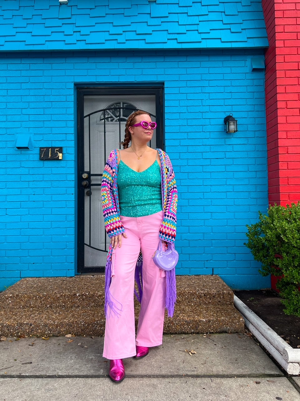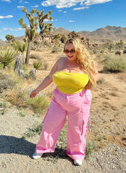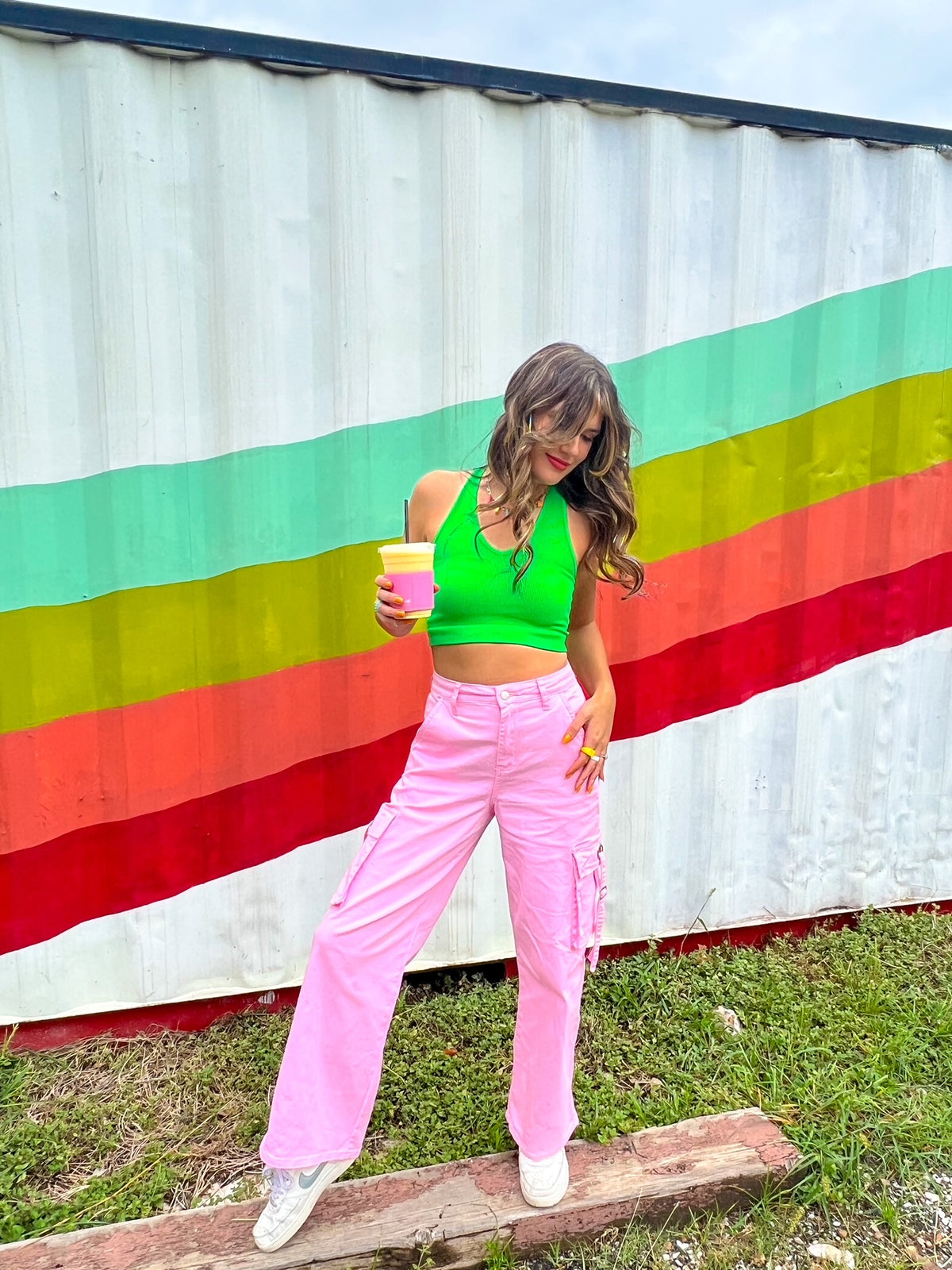 The pants that GO WITH EVERYTHING. Our Baby Pink Cargos are the perfect mix of cool-girl and girlie style. You will love these for their flattering high-waisted fit, cool pockets, and soft pink color. We paired ours with the Ombre Rainbow Mesh Top.