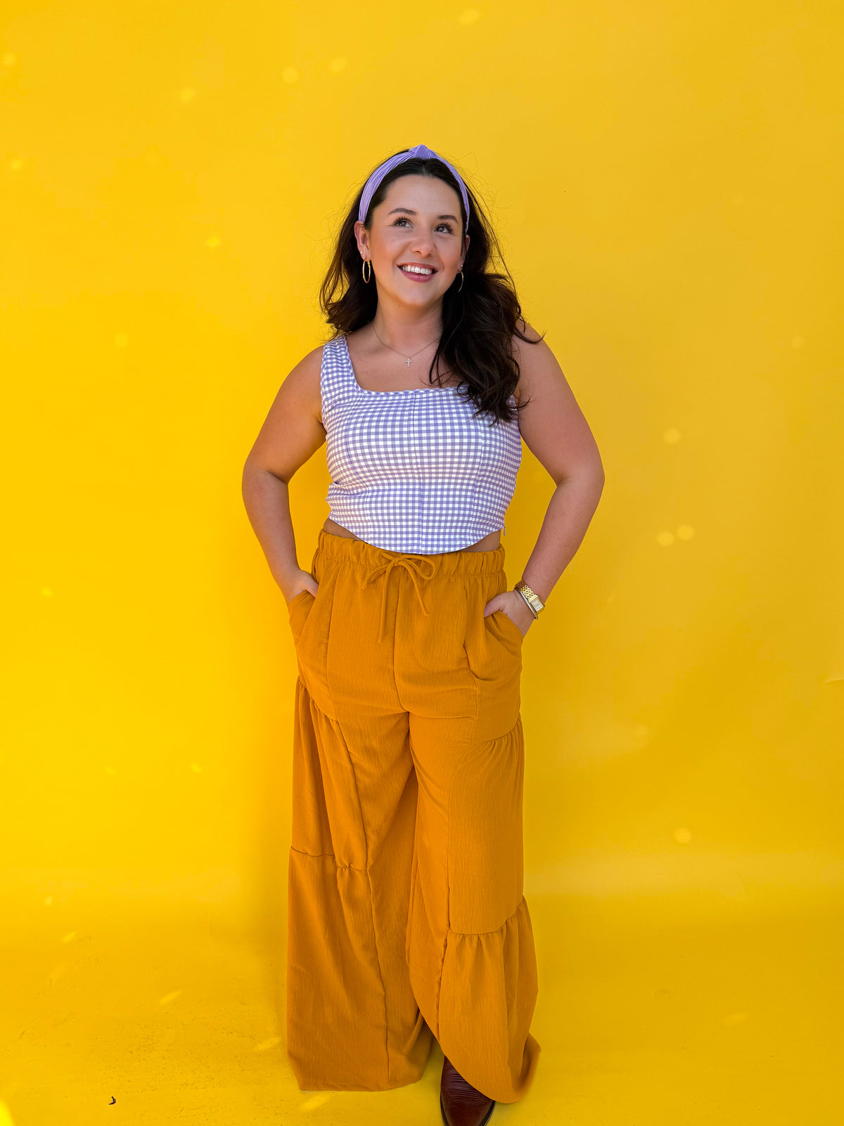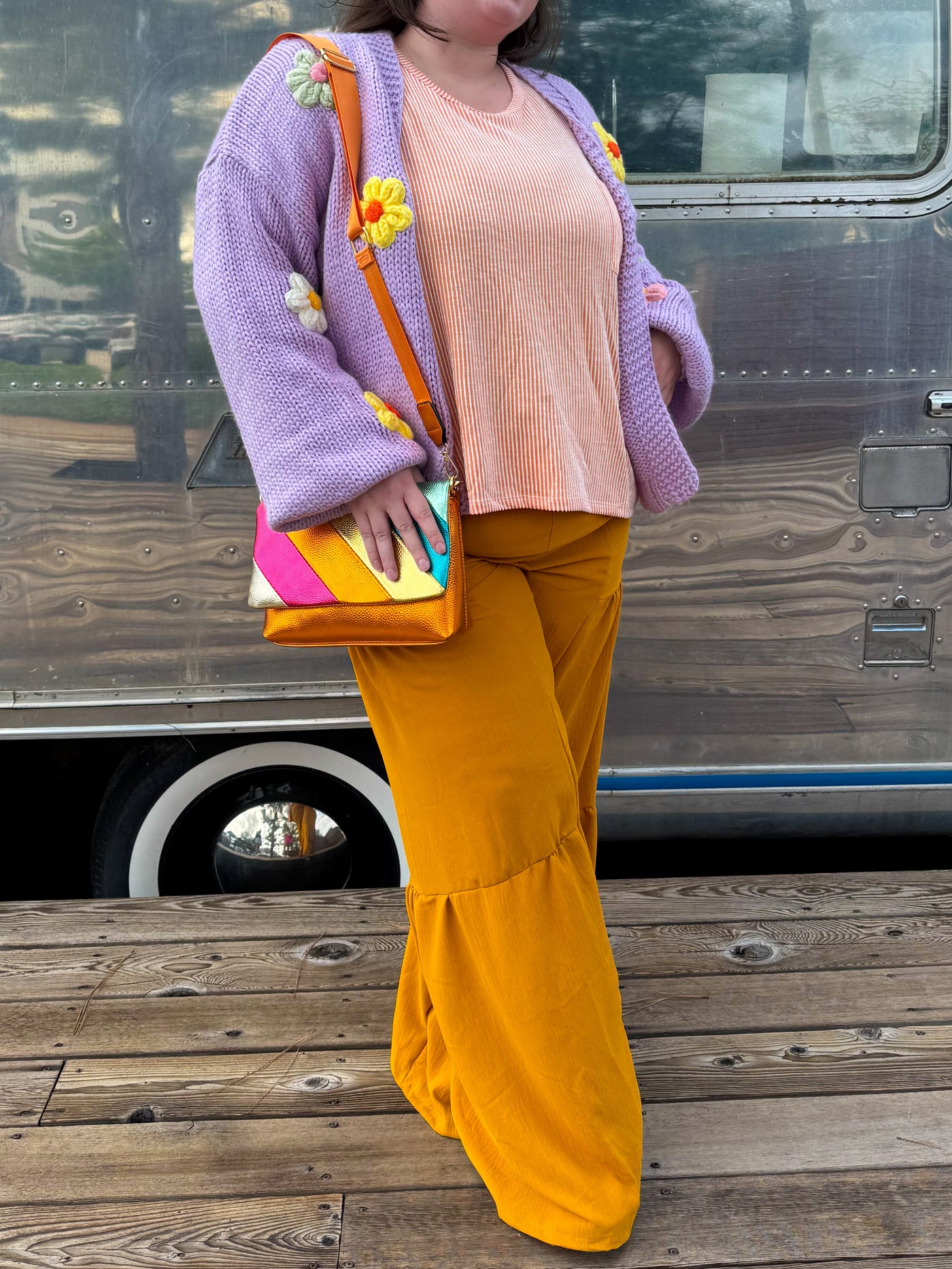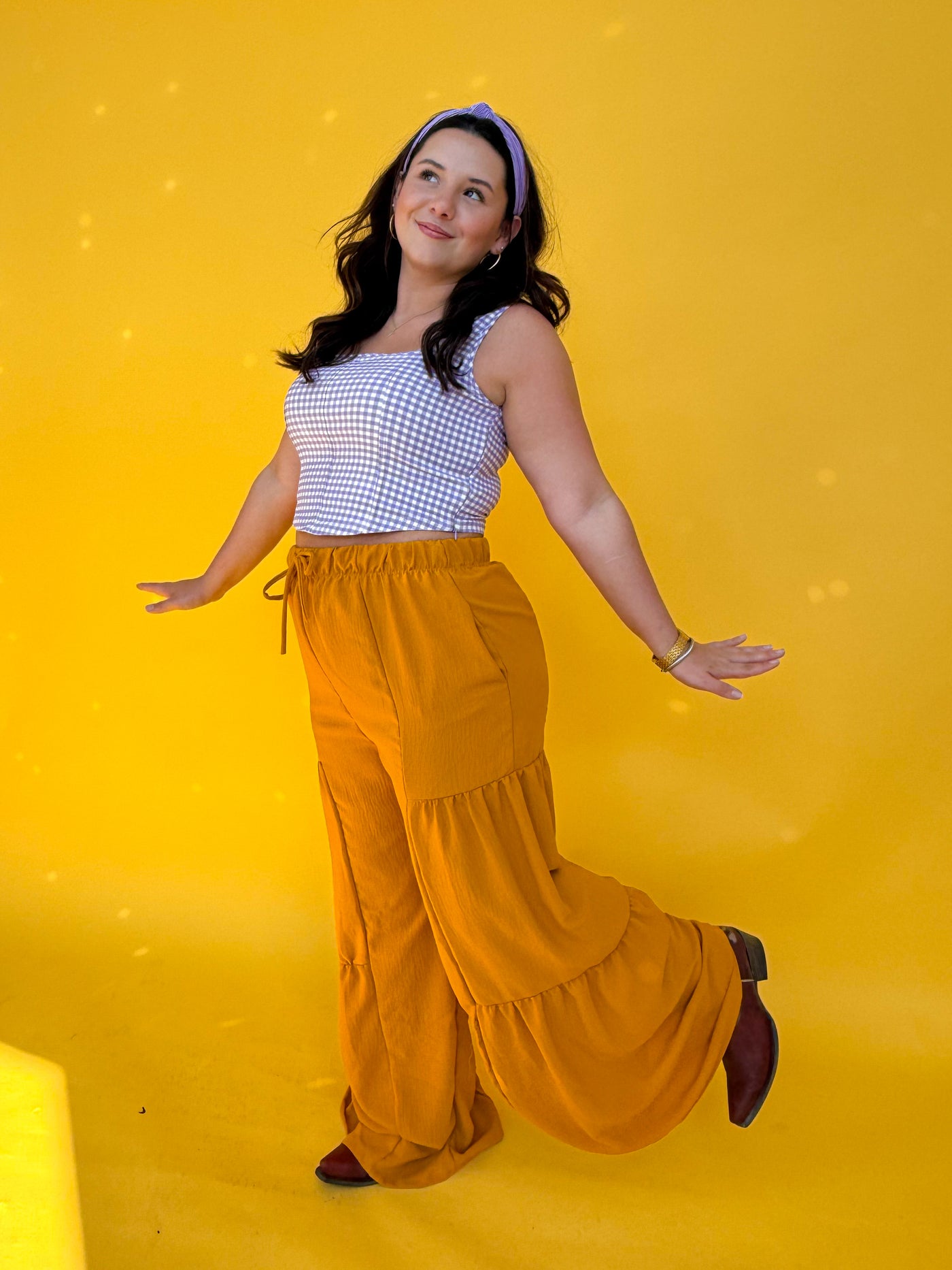 Who says pants have to be boring an uncomfortable? These flare pants are in a perfect shade of mustard for autumn, and add color to your look when you are in a sea of neutrals!! They are comfy, have an elastic and tie waistband, and have POCKETS! These showstoppers look great with all colors, but we love styling them with oranges, burgundy, green, and teal!