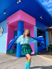 This sweater will be the perfect color for your winter wardrobe. It has an icy blue color that pairs great with other blues, pinks, and purples. It has a cropped fit and V-neck to keep it cozy and comfortable. Add this sweater to your closet today! Seen paired with the Checkered Flare Pants.