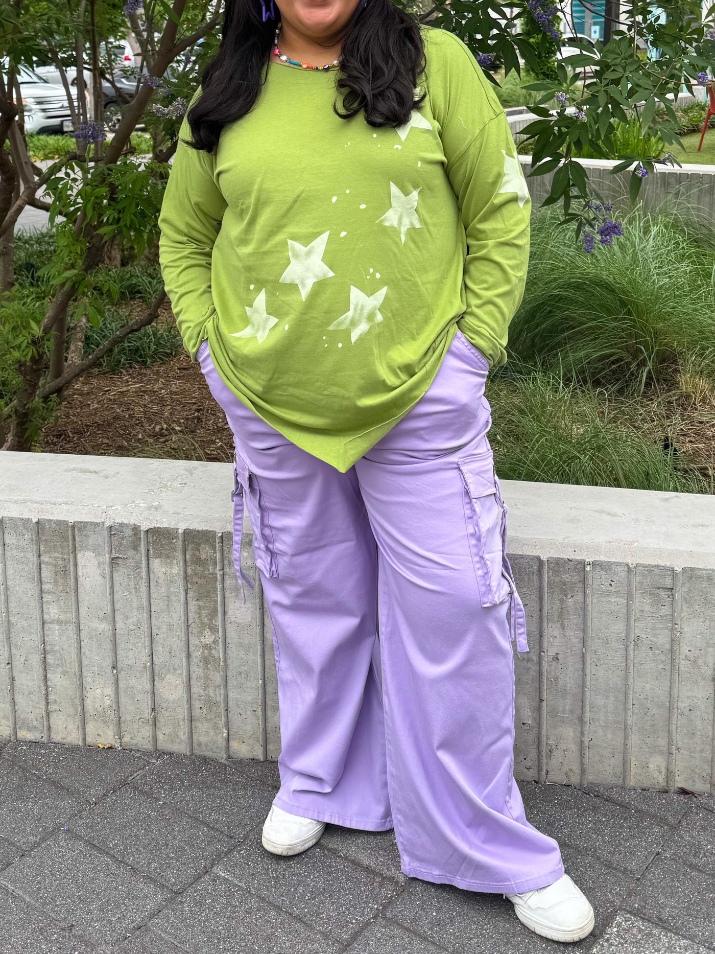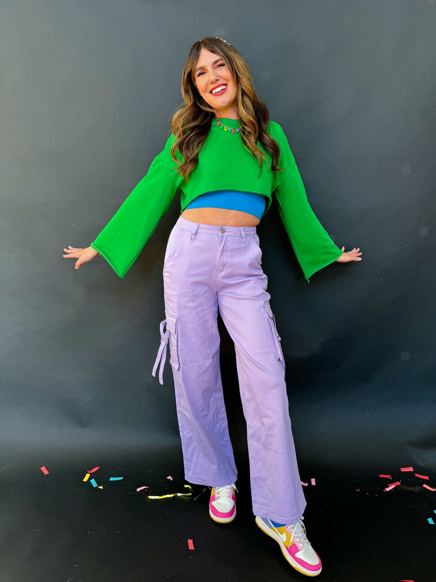 The pants that GO WITH EVERYTHING. Our Lavender Cargos are the perfect mix of cool-girl and girlie style. You will love these for their flattering high-waisted fit, cool pockets, and light purple color. Style with graphic tees, blouses, and sweaters!