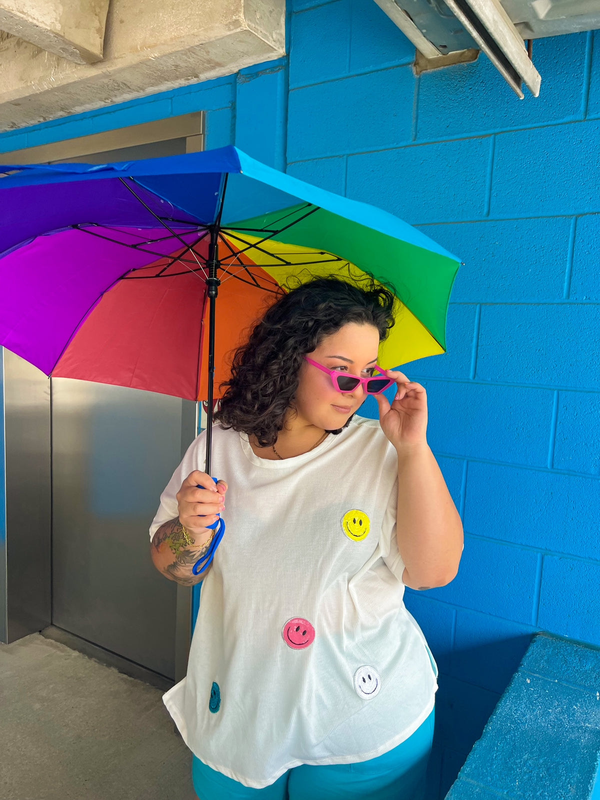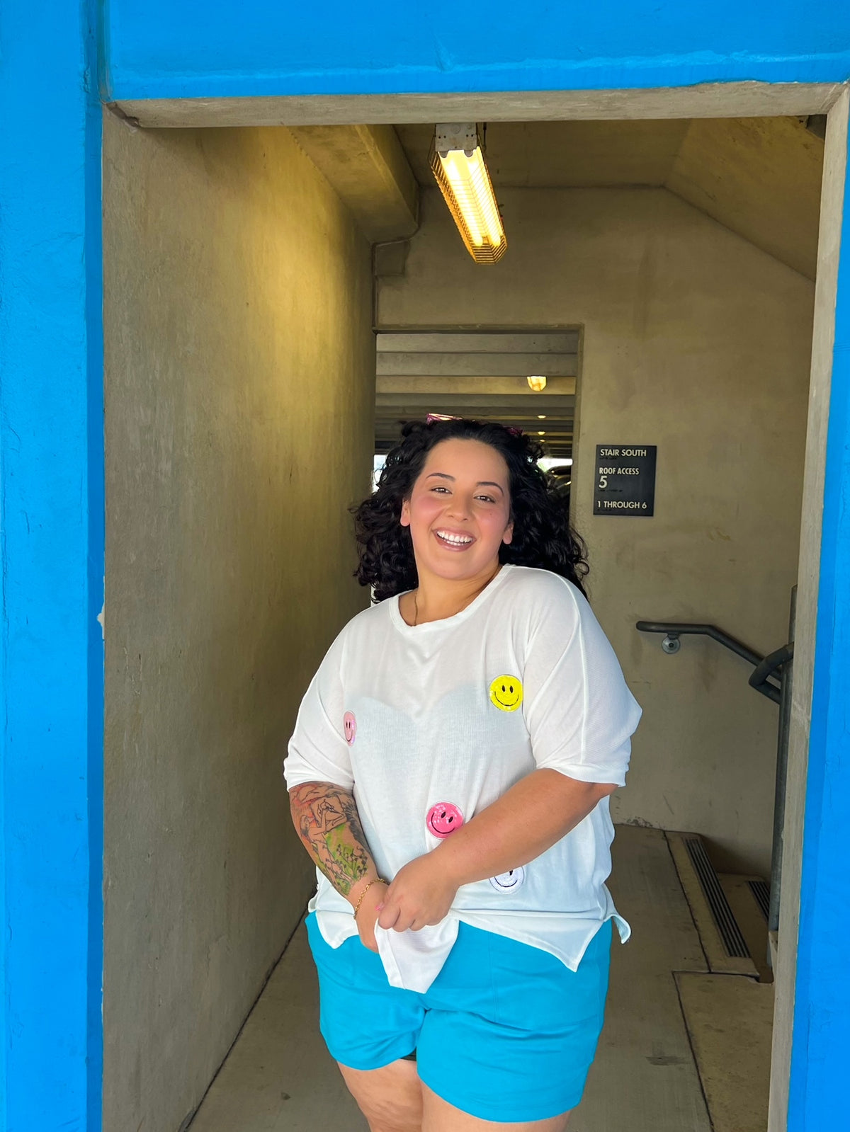 You know that if we are bringing you a neutral, it's going to be a FUN one. This tee is the cutest take on a neutral piece and is sure to bring you a boost of dopamine! With its oversized fit, sparkly smile patches, and effortless vibe, you will want to grab this top again and again. The subtle colorful smiles make this so easy to match. We love this tee paired with hot pink, yellow, or blue! Seen styled with the green and white checkered bucket hat.