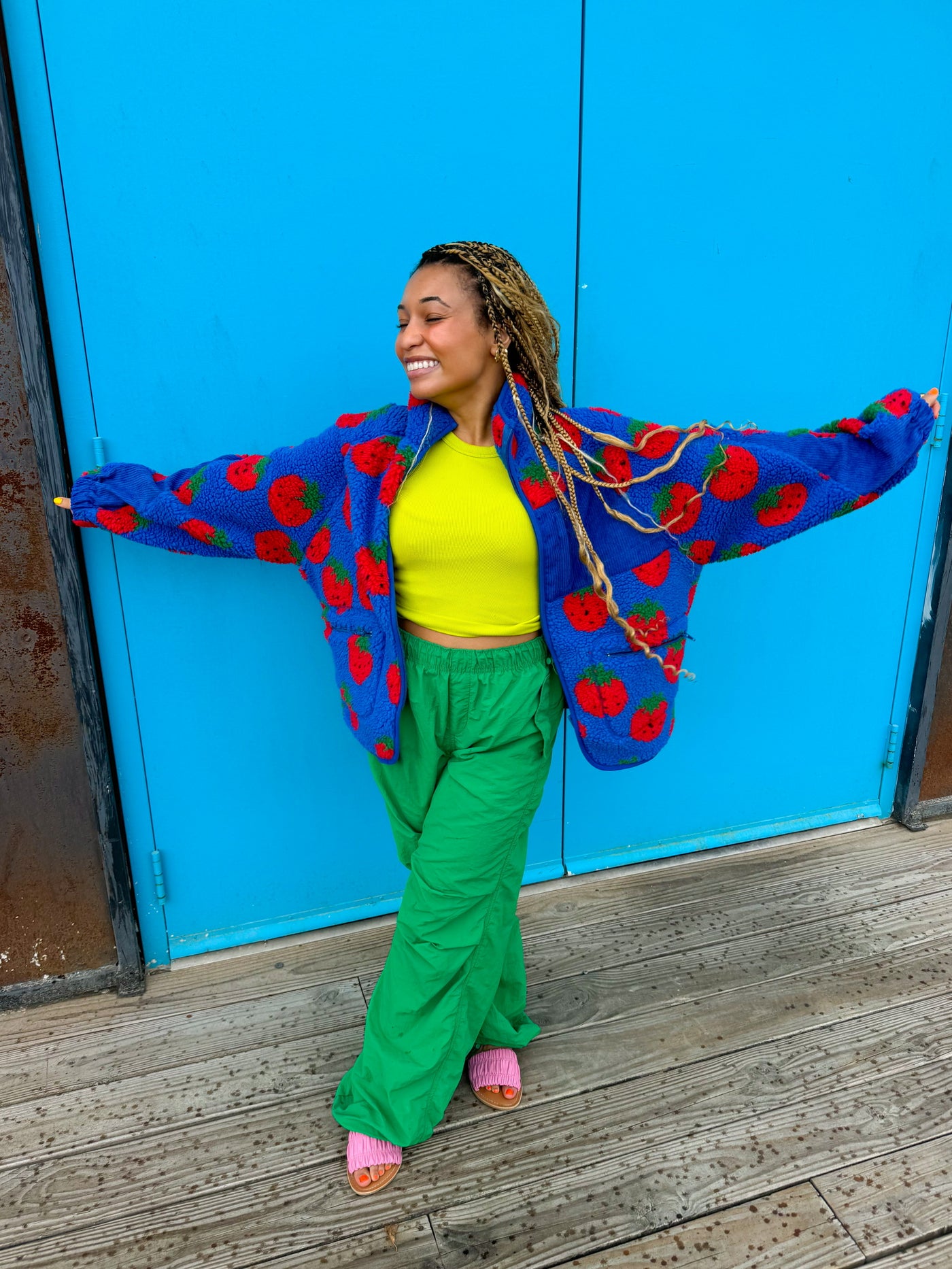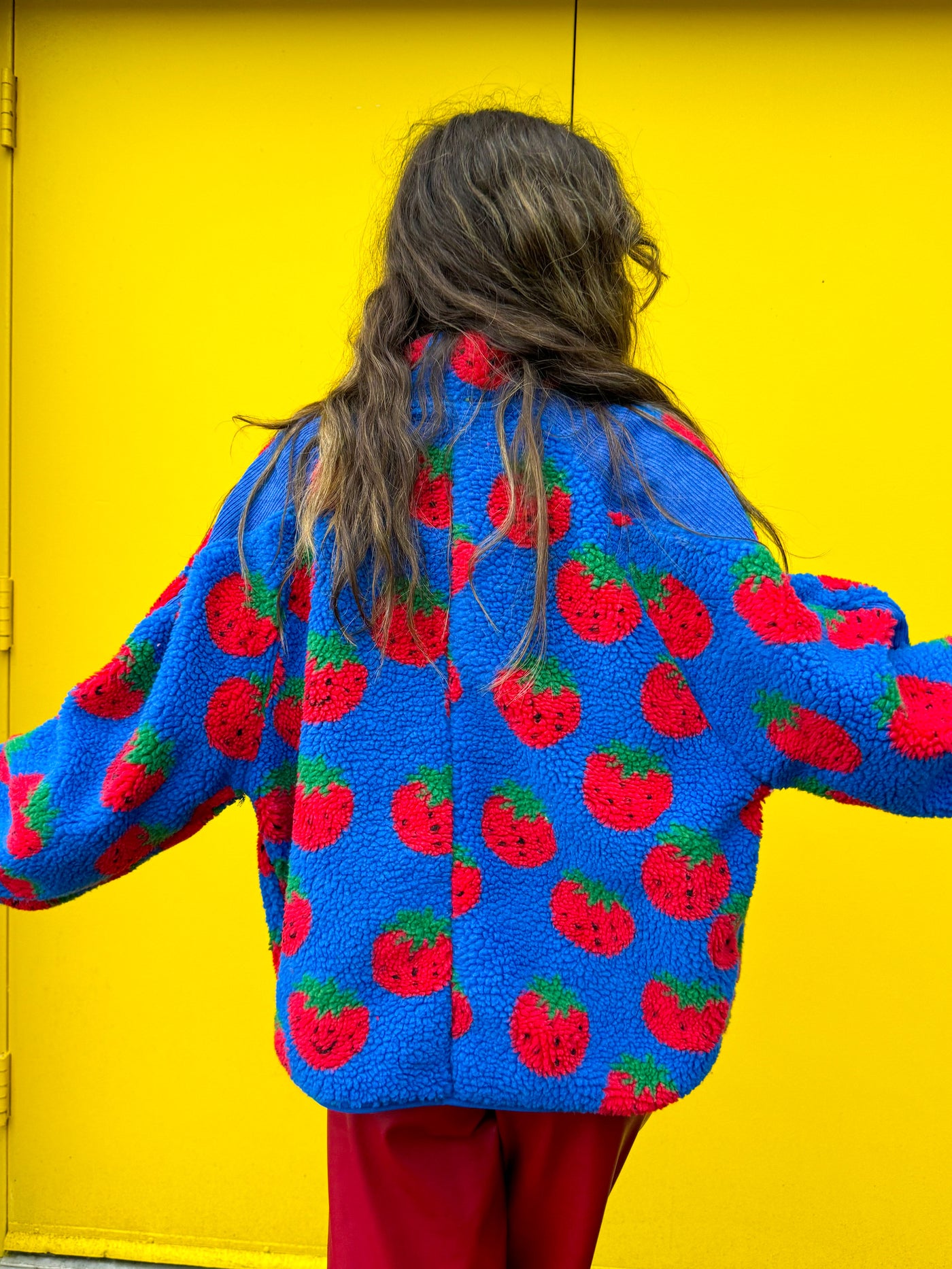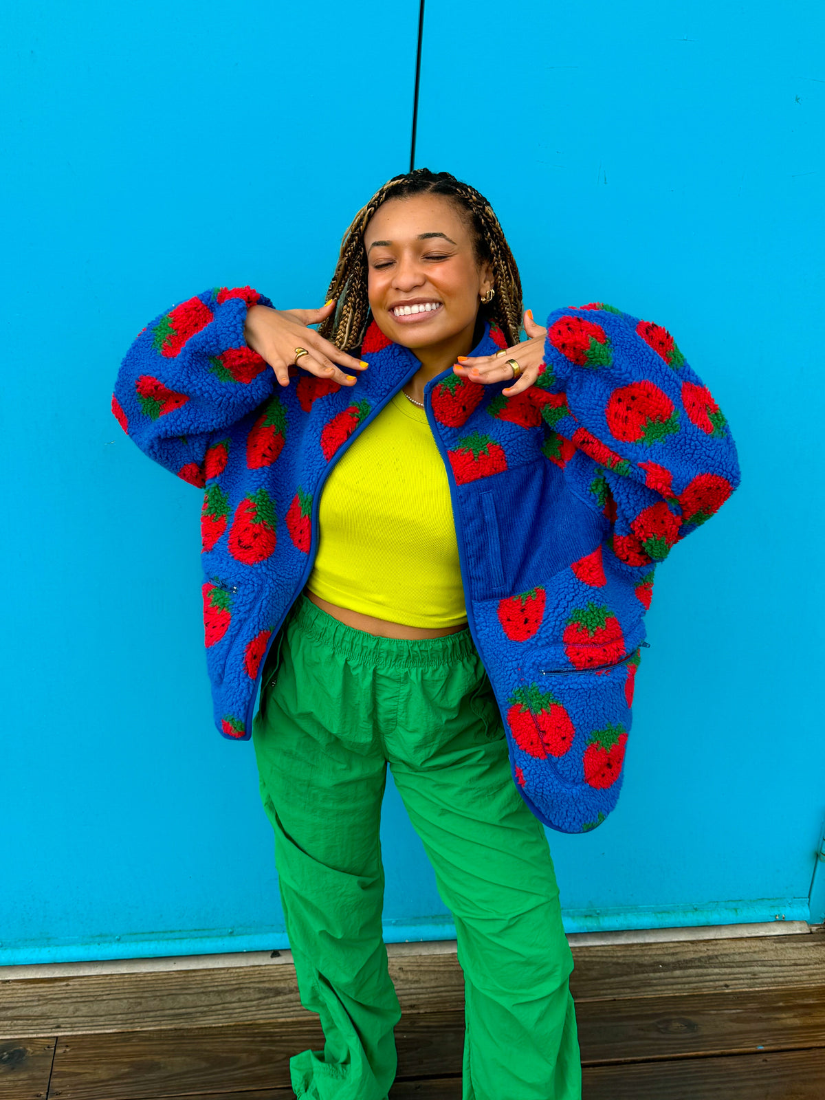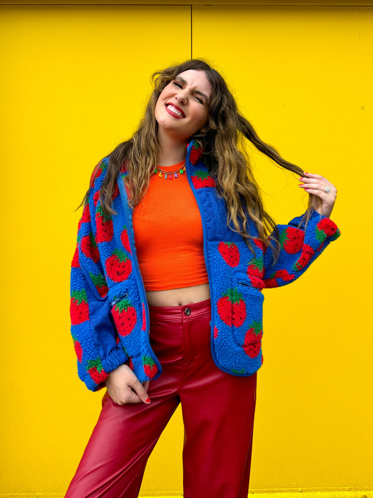 Strawberry picking all year round! This vibrant sherpa is an eye-catcher, and perfect for chilly days where you want something fun but casual! The red and blue are a real POP and make all outfits colorful and iconic! Style with fun colors like orange, green, and pink, or with neutrals! Make this our go-to jacket this winter!
