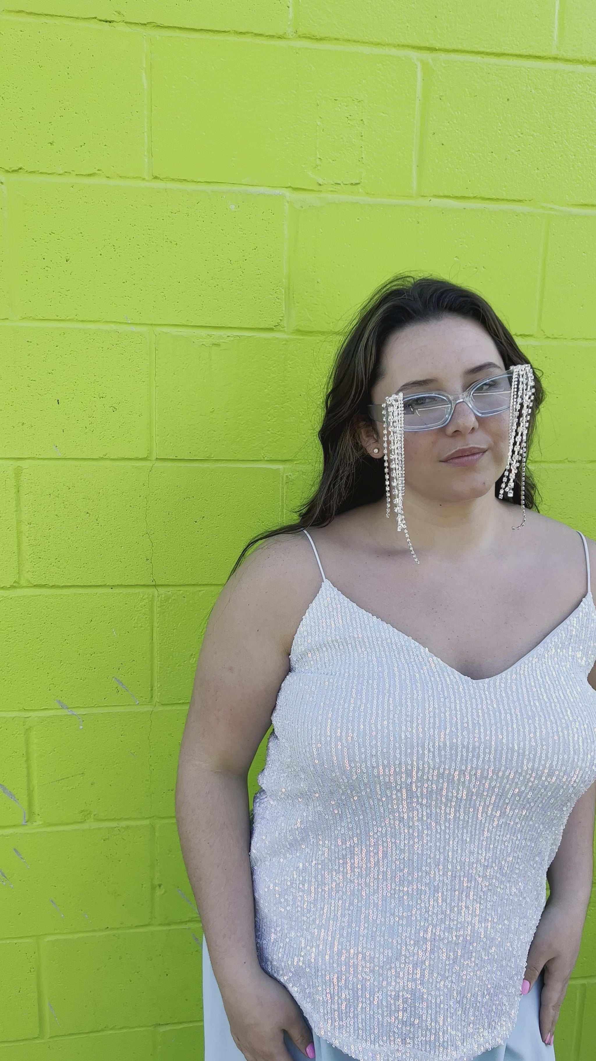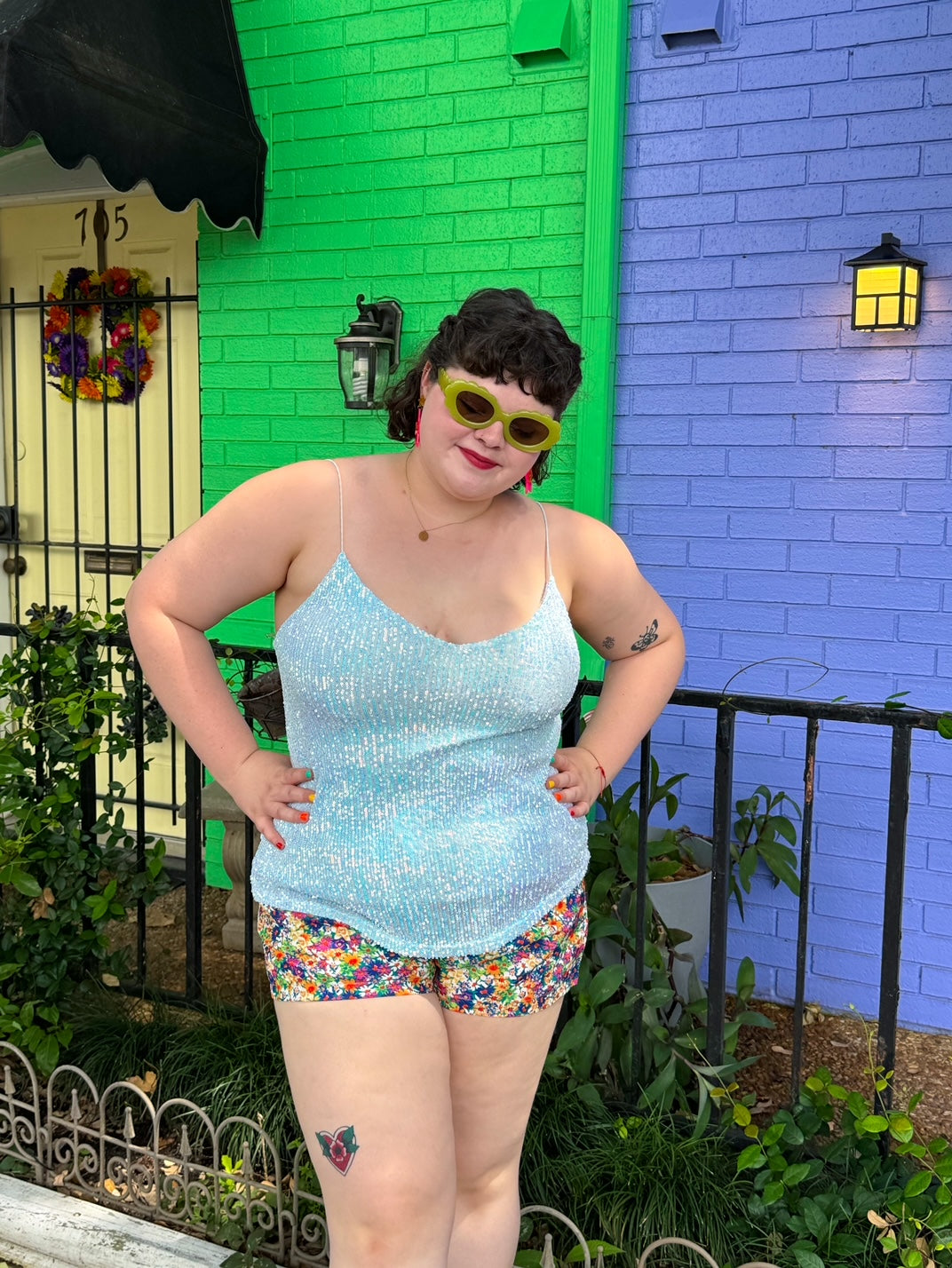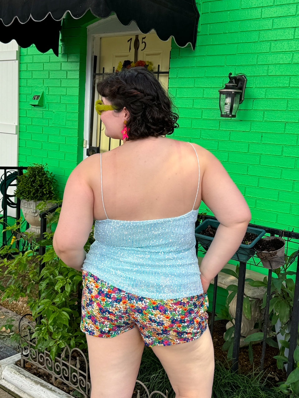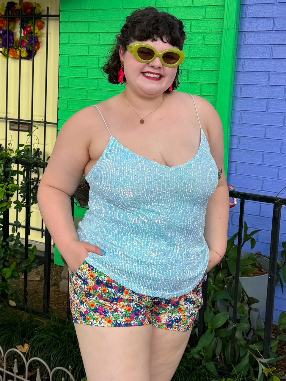 Get some sparkle back in your wardrobe! This easy-to-style tank is a gorgeous light blue color and is covered in fun sequins! The flattering fit and v-neck style make this tank stand out from all the rest. We paired ours with the Aqua Flare Pants.