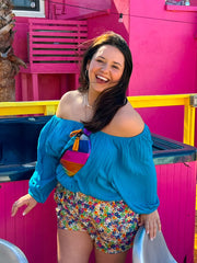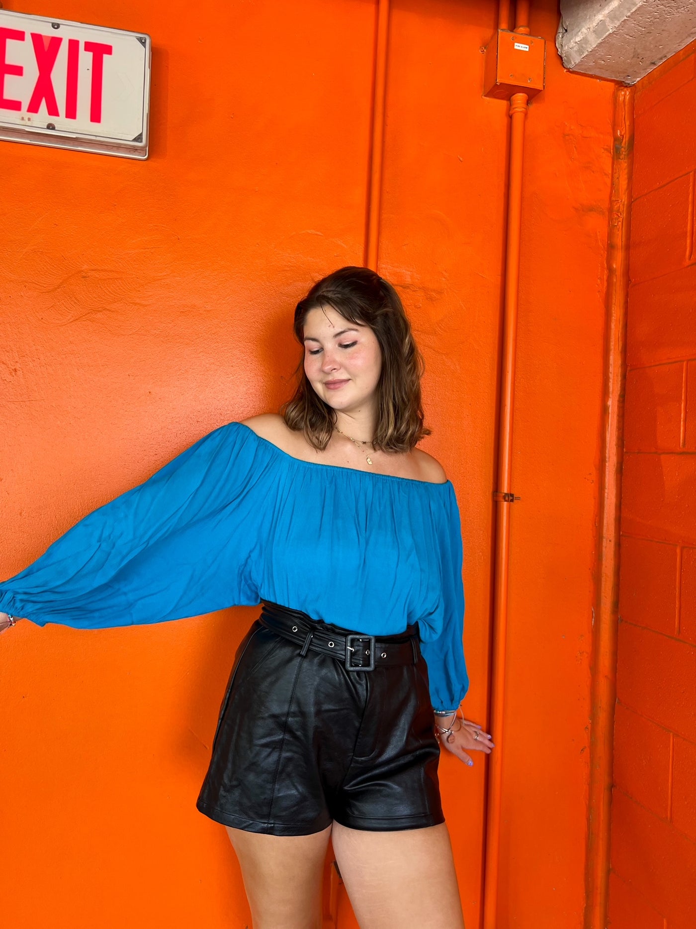 Looking for the perfect top to add some color to your wardrobe? Our Blue Raspberry Snowcone off-the-shoulder top is the perfect addition. The blue hue is refreshing and vibrant. Its stretchy neckline and hemline make this top easy to style casually with jeans or dressed up with a mini skirt.