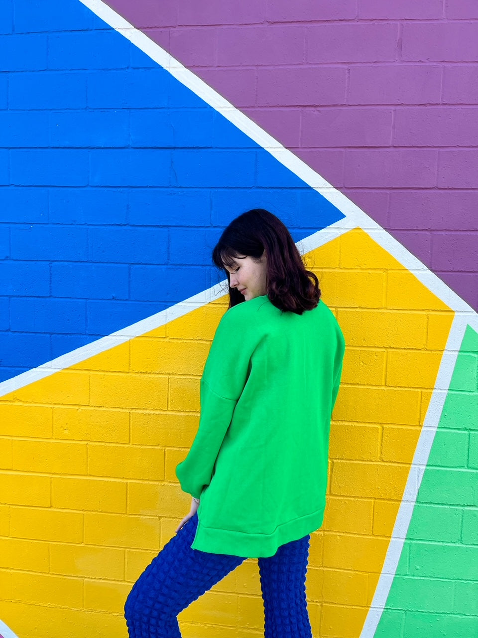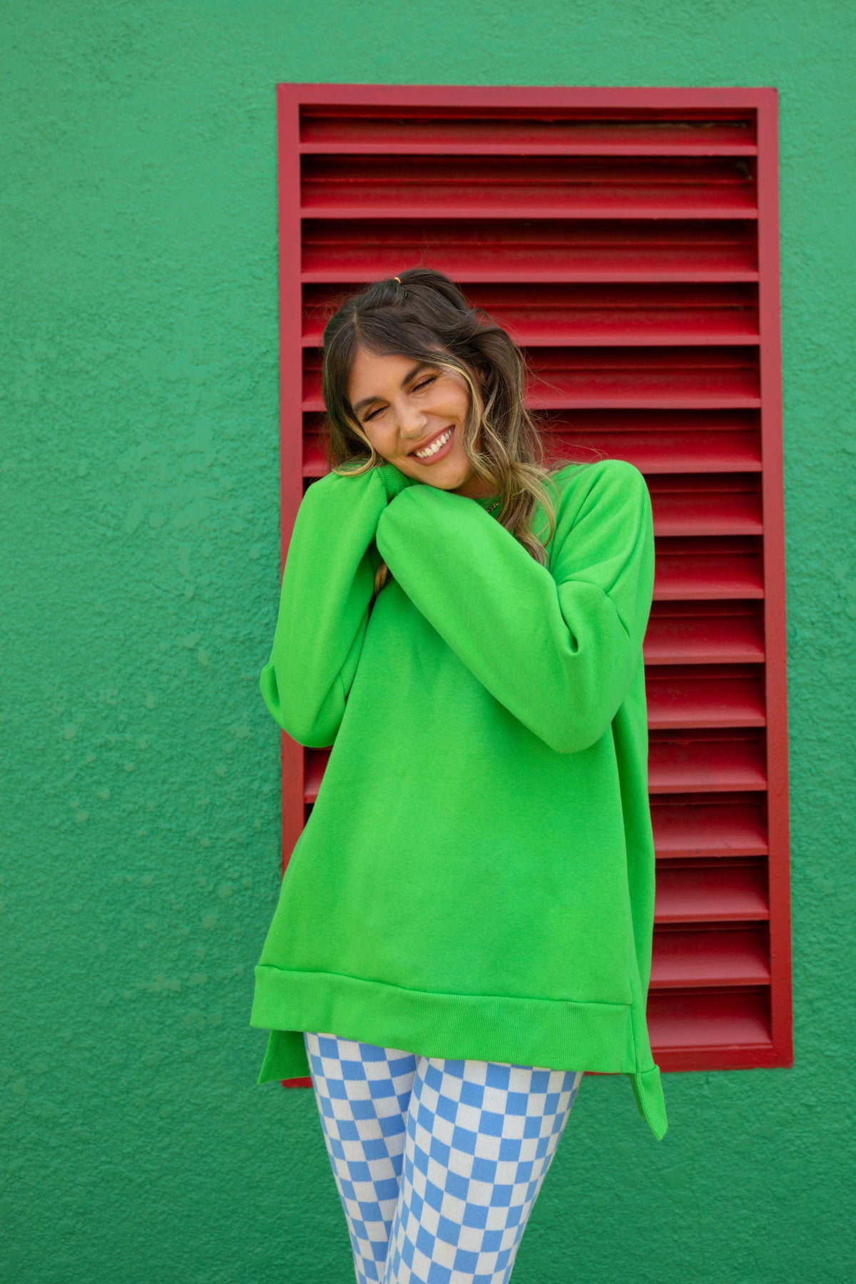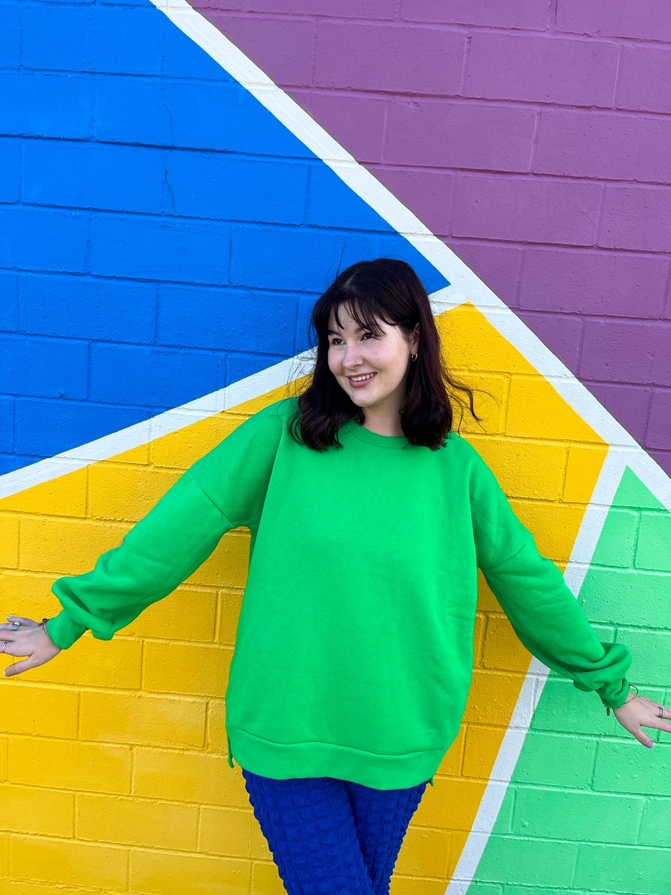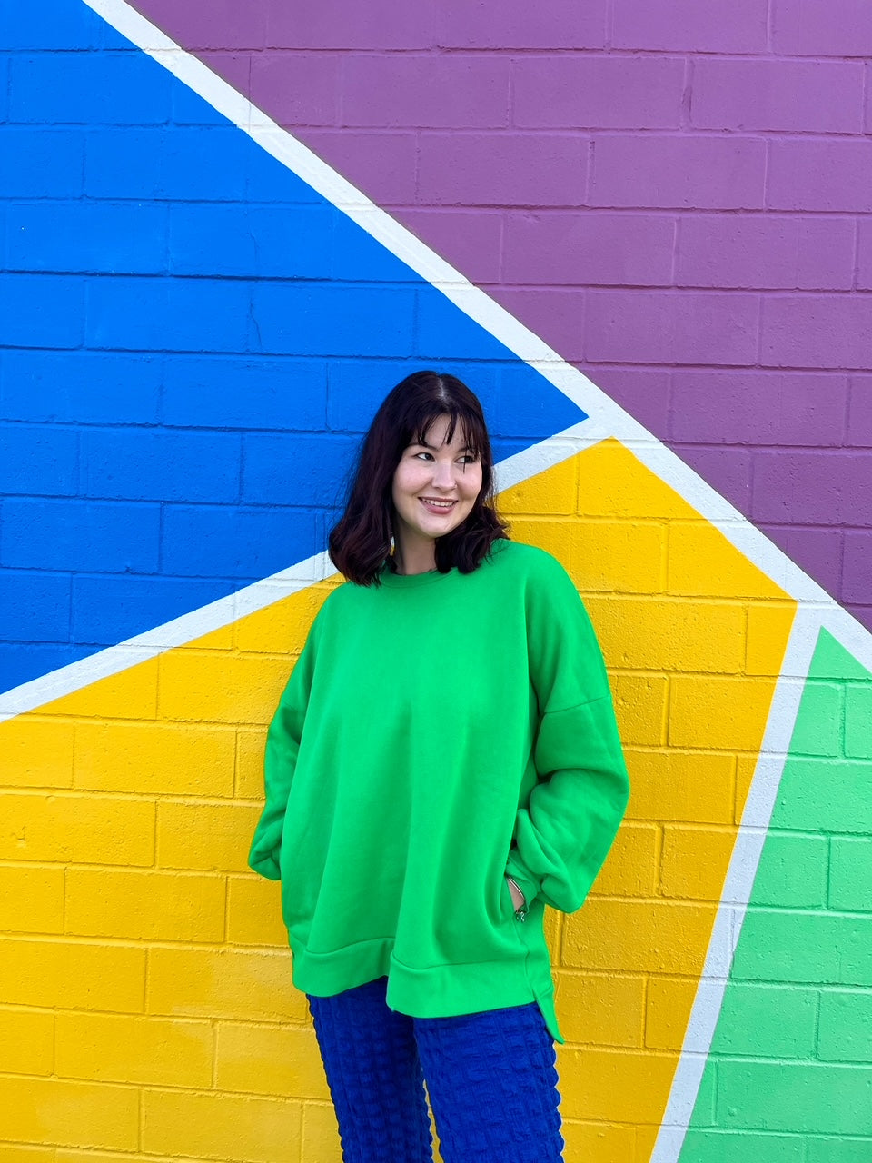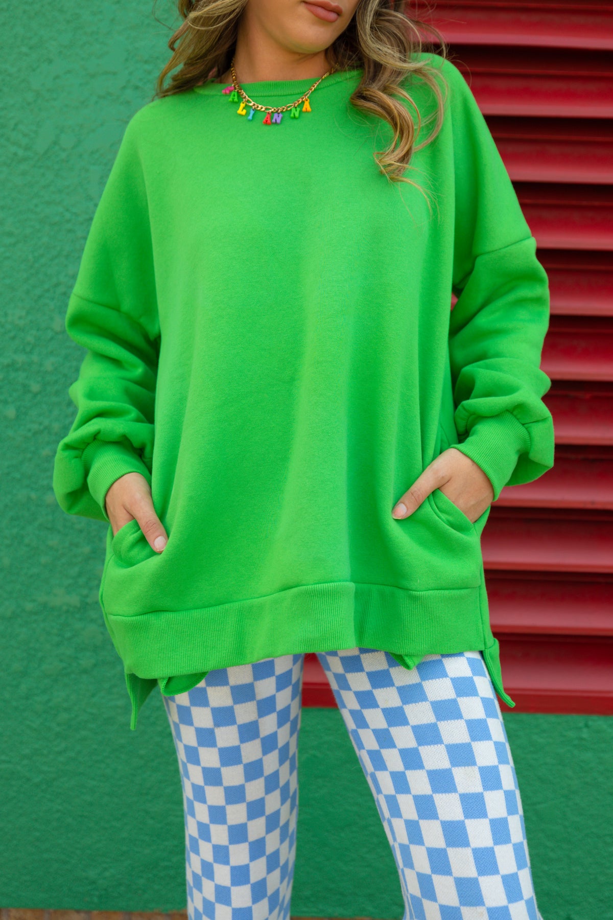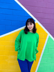 You’ll be looking forward to Fall with this oversized crewneck. Made from a cozy, soft fabric, it features pockets and a bright green color that will match all your favorite outfits.