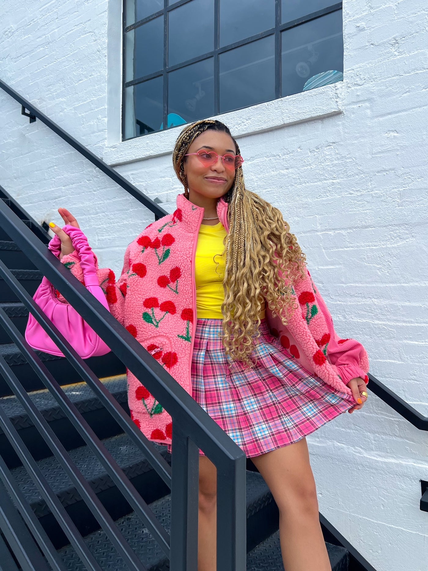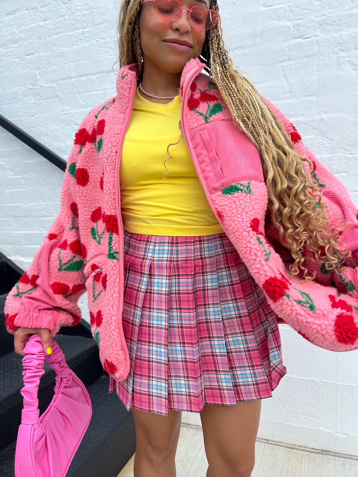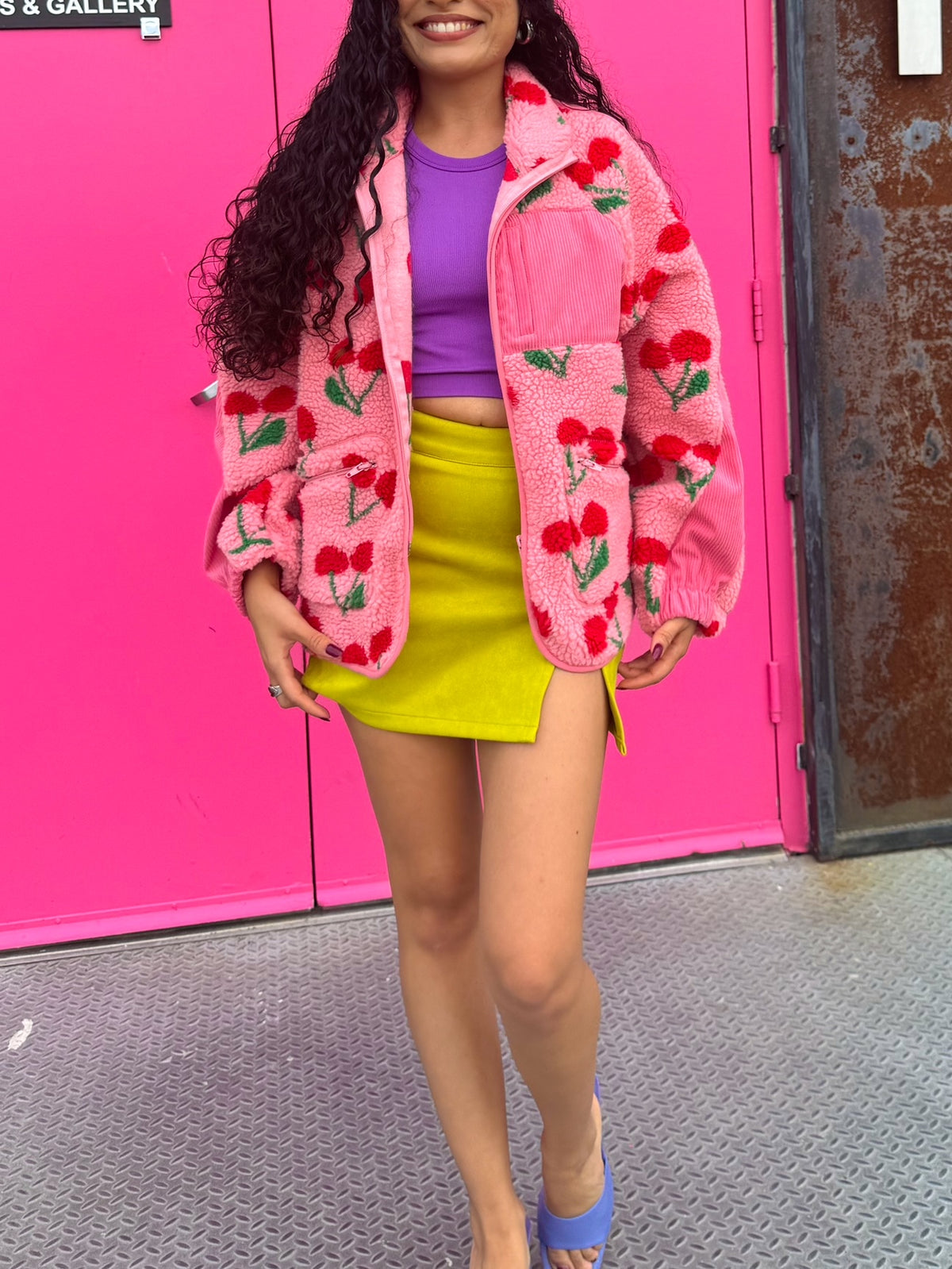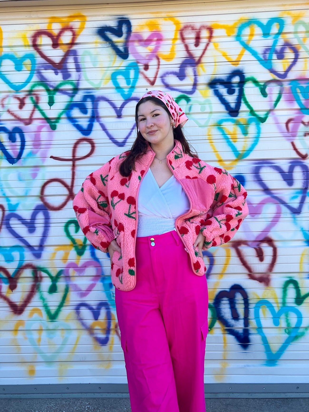 Cherry picking all year round! This pink sherpa is an eye-catcher, and perfect for chilly days where you want something fun but casual! The cherry details make all outfits colorful and iconic! Style with fun colors like purple, green, and pink, or with neutrals! Make this our go-to jacket this winter!