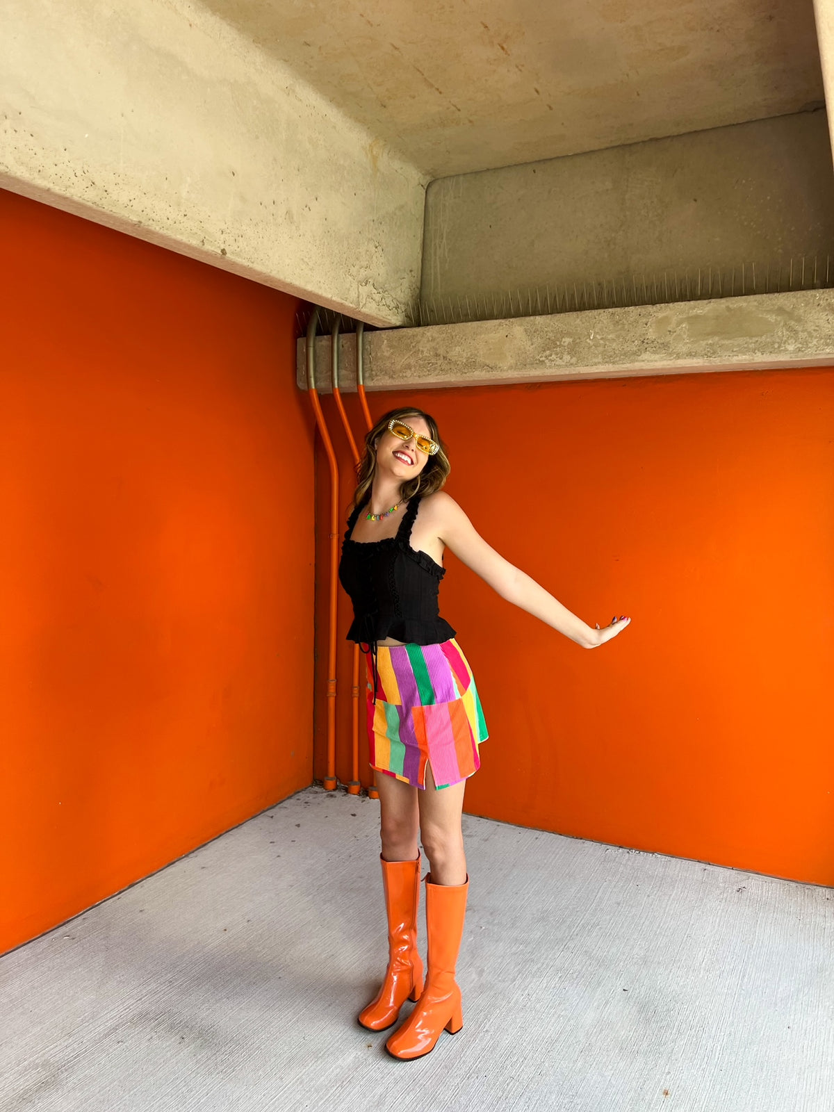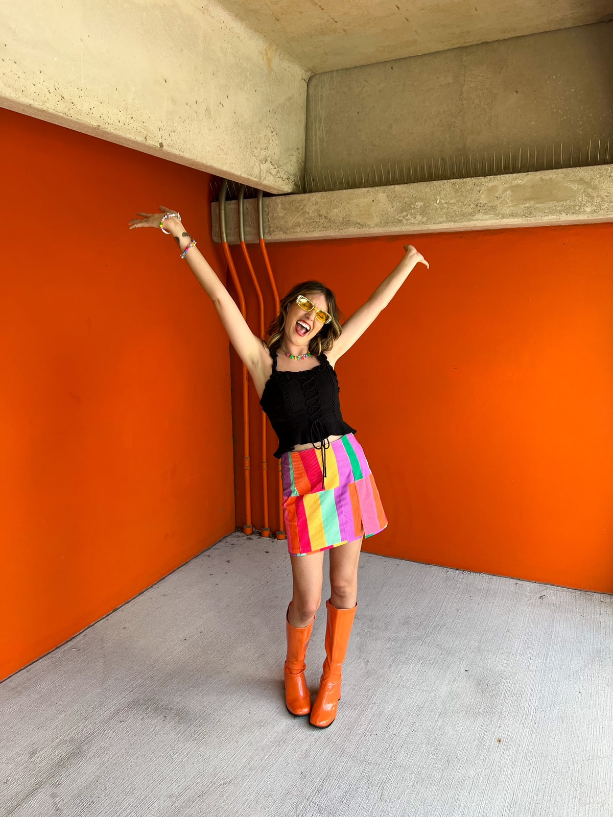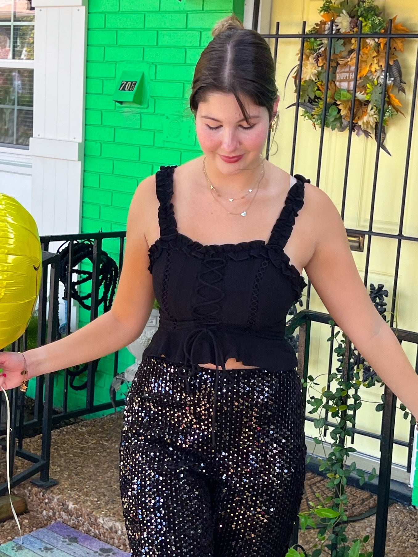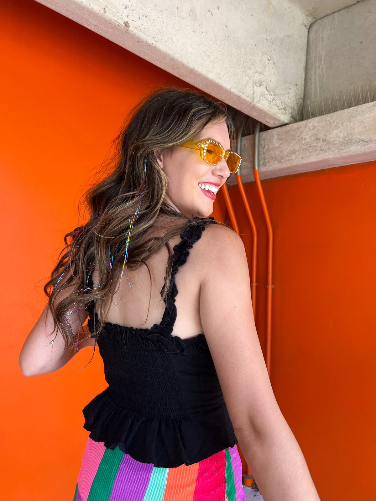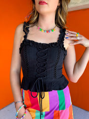 This lace-up top goes with everything! A classic black tank top with some fun twists! It features a lace-up front, peplum bottom, and a slightly cropped fit. Pair it with some colorful pants or a skirt for a color-pop outfit!