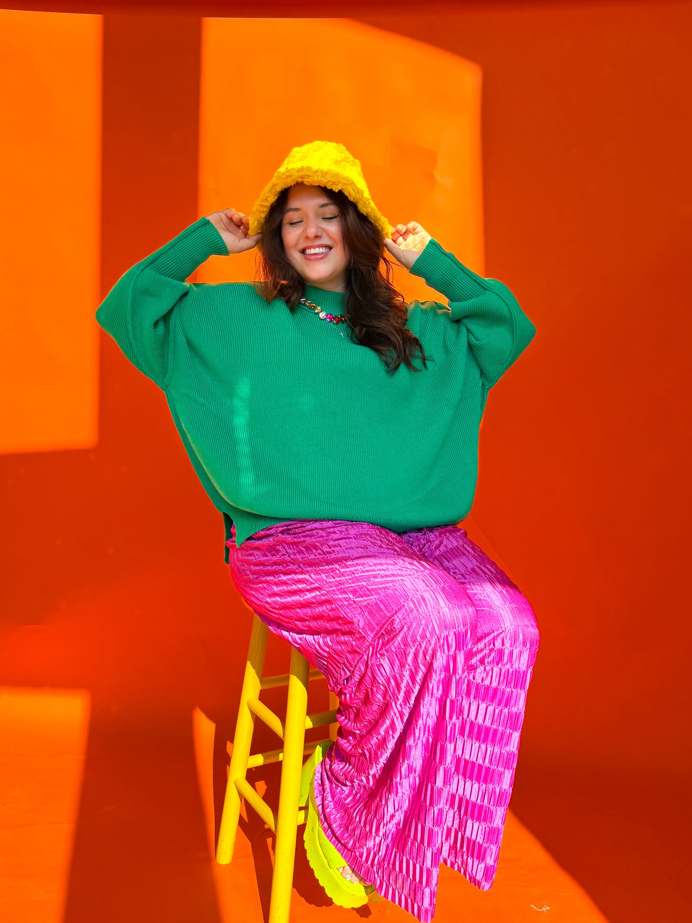 Feeling BOLD and POWERFUL in this sweater this cozy season!! A basic sweater is essential in every closet, and it's even better when it's in a fun color!! This green is so fun to style with neutrals, pinks, oranges, blues, and truly the whole rainbow!! And to keep the ultimate comfort with this sweater, style it with jeans or flare pants, or dress it up with a cute skirt or trousers!!
