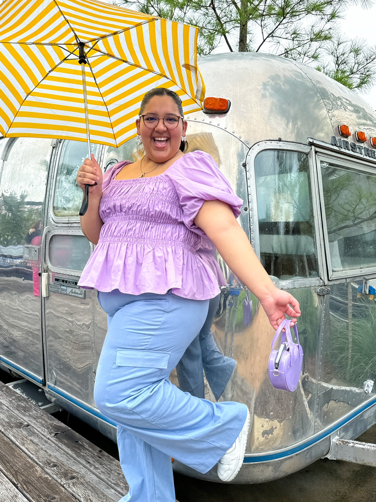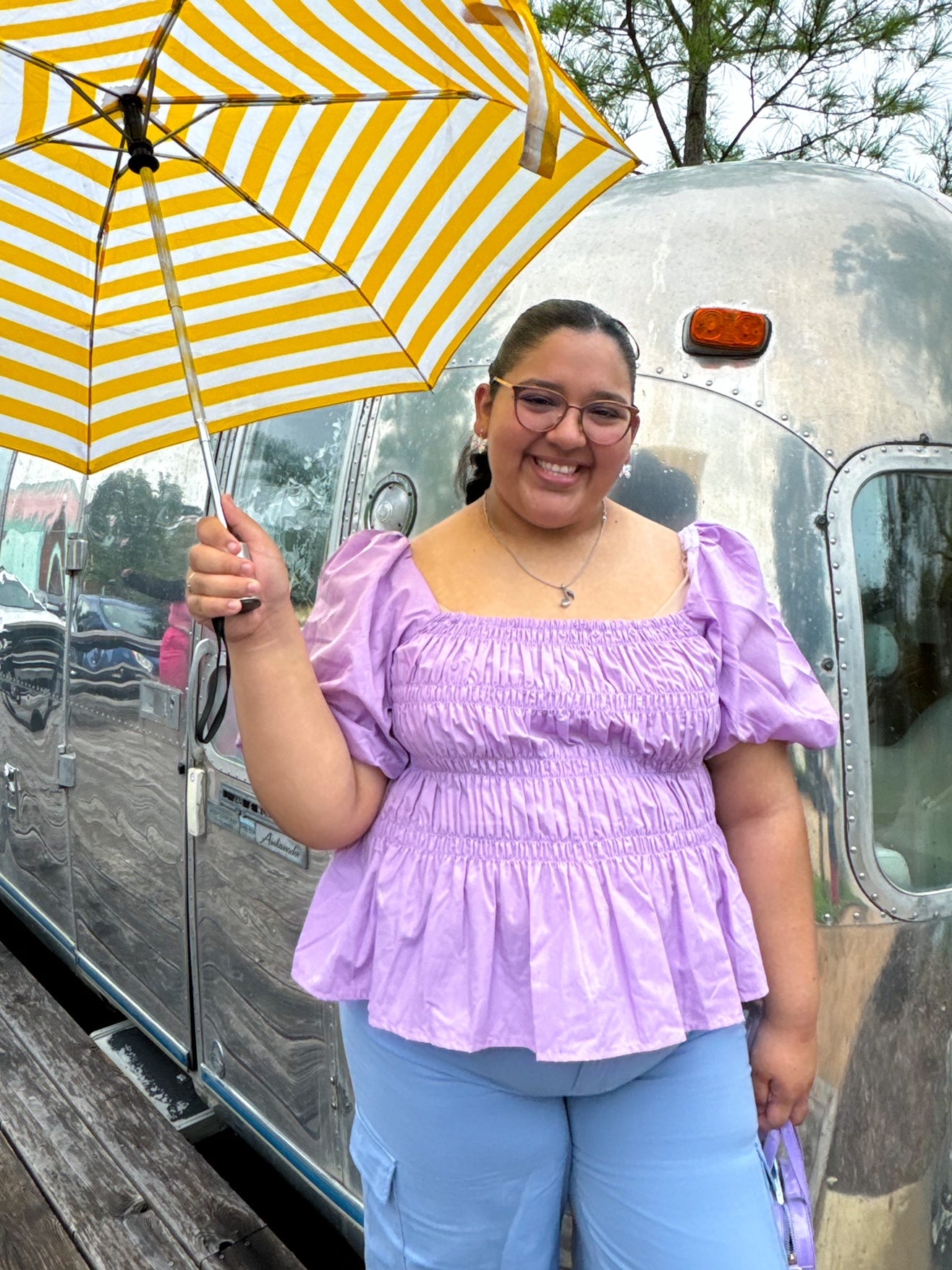 The most magical lavender peplum top is here!!! This top can be styled off the shoulder or on the shoulder, and the sleeves are perfectly poofy either way! The elastic bodice and flare at the bottom make this comfy top extra dressy! Style with skirts, shorts, flare pants, or trousers! This shade of purple looks amazing with greens, oranges, pinks, and neutrals!