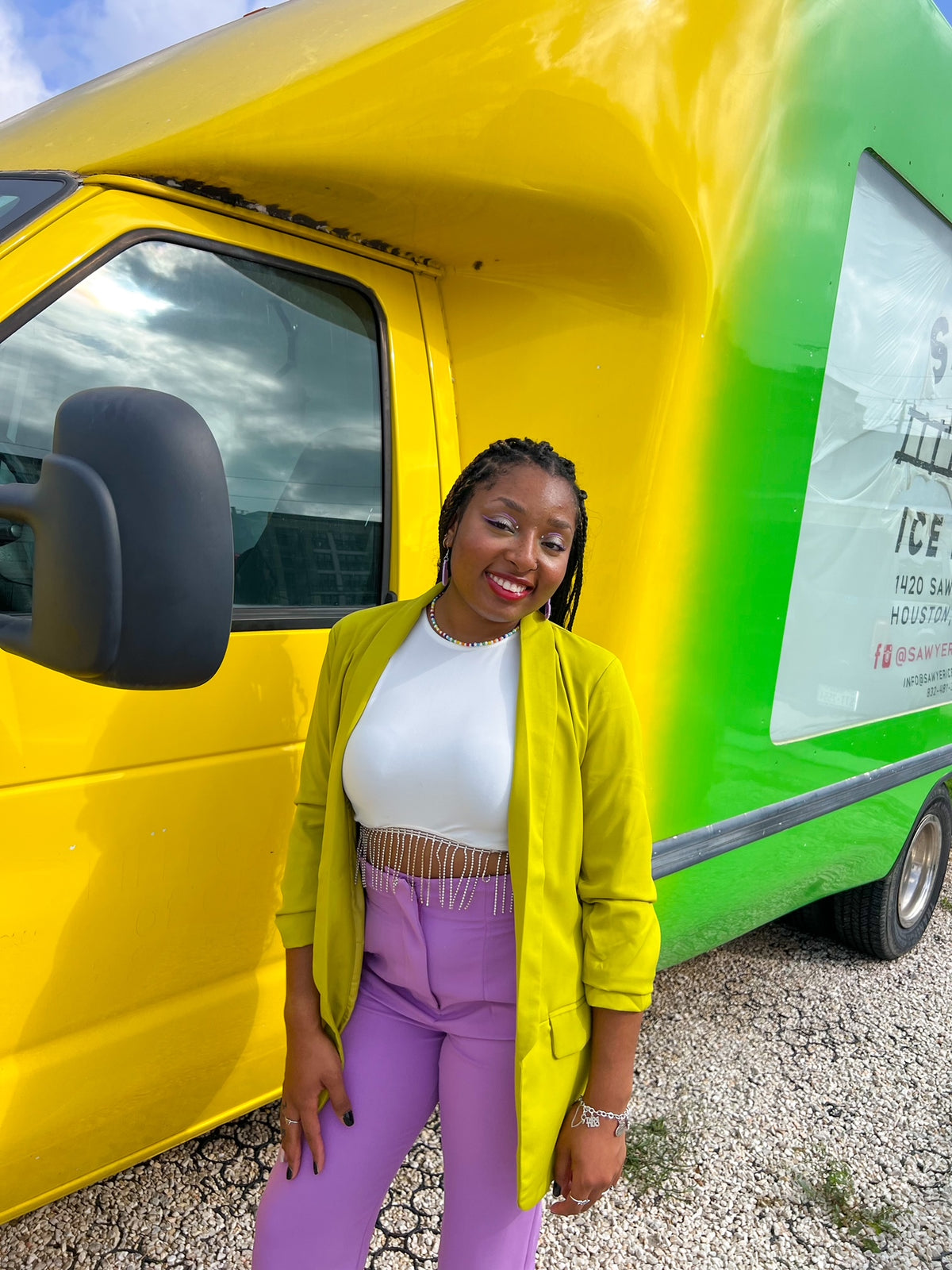 This blazer, in a lemon-lime color, is your perfect choice for almost any occasion. It has scrunched sleeves and pockets to keep you comfortable and functional, but still cute. The length hits right around your fingertips so it pairs great with dresses. Seen paired with Sightseeing top and the Live Free skirt.