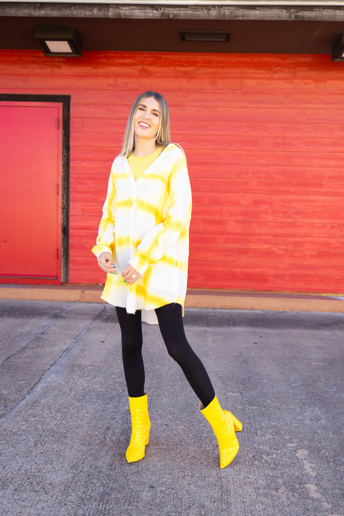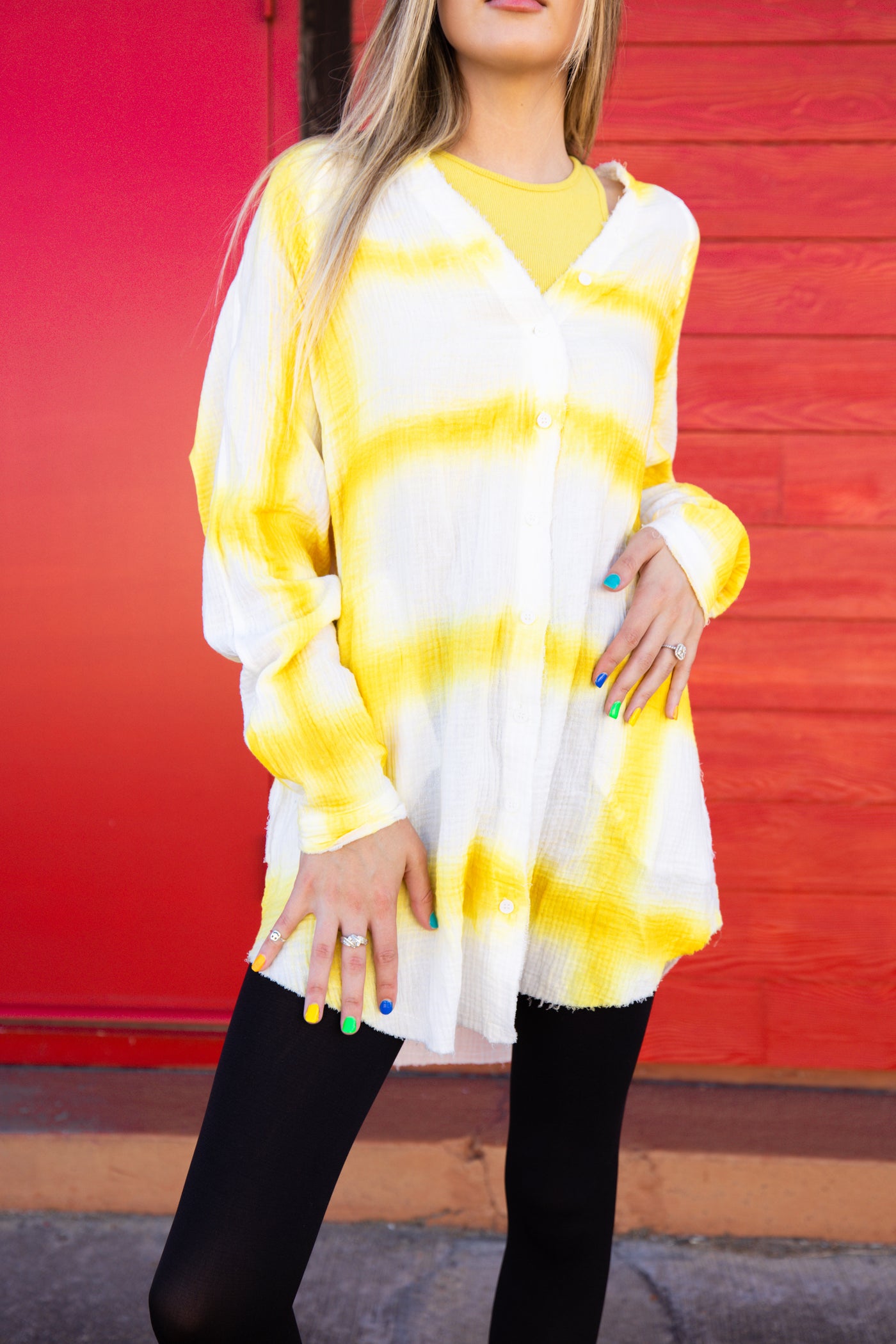 The Lemon Juice dress is a minidress/tunic style with a button down front. It features a gauze material with a yellow tie dye pattern. It has an oversized fit that pairs perfectly over leggings and tights. Seen paired with the mustard cropped tank for layering.