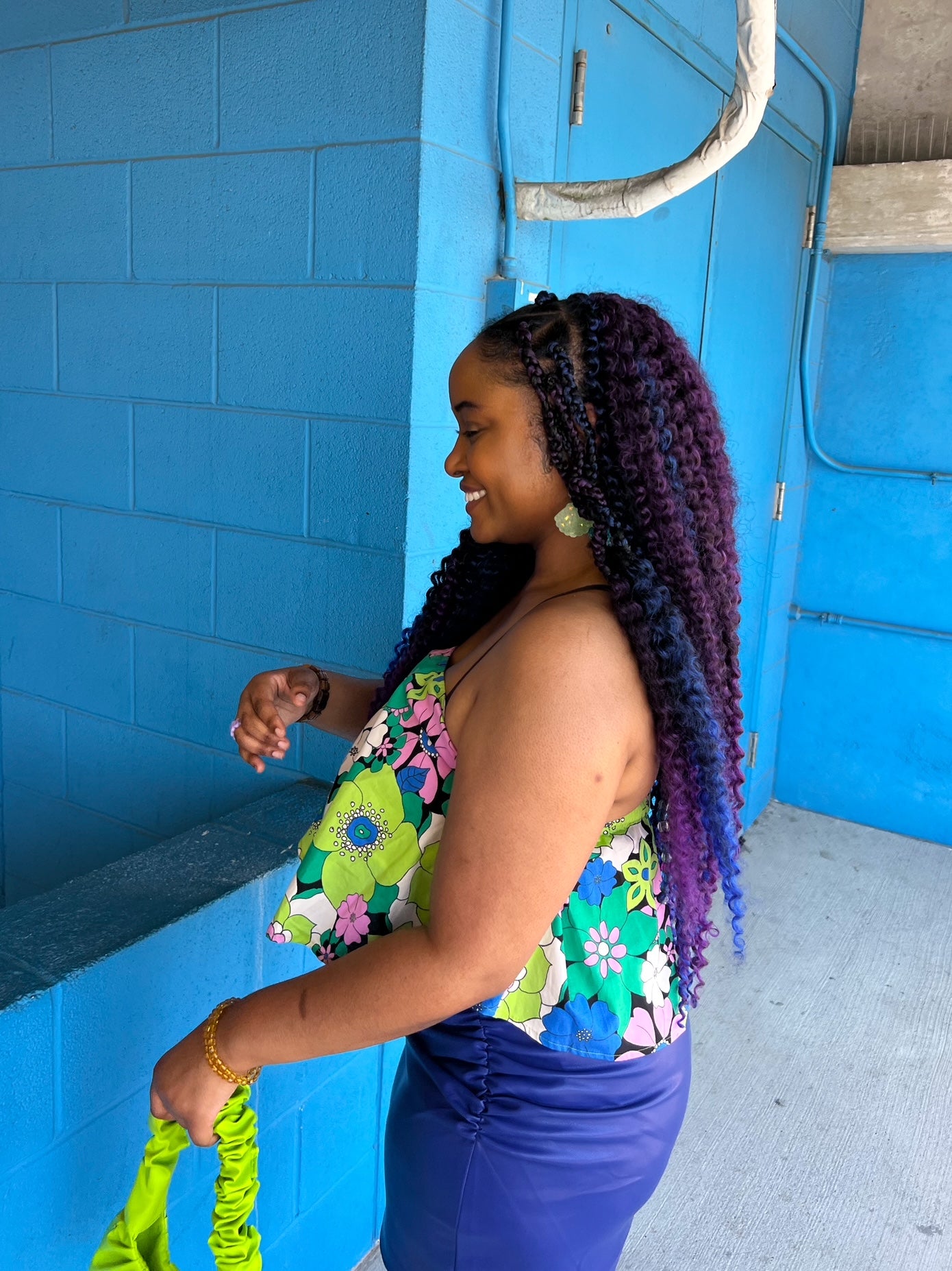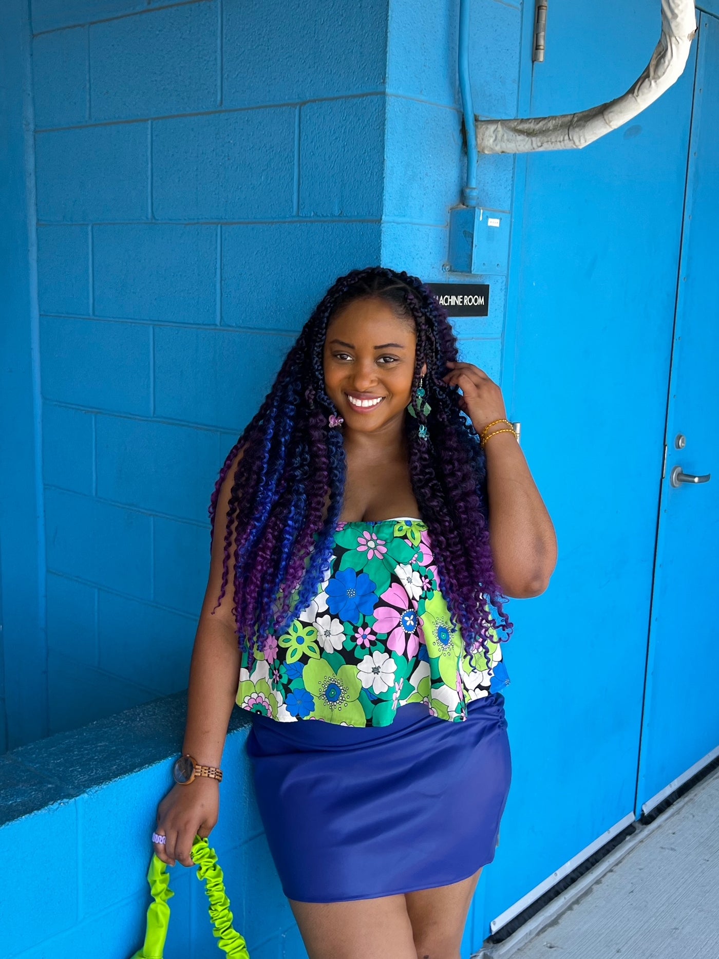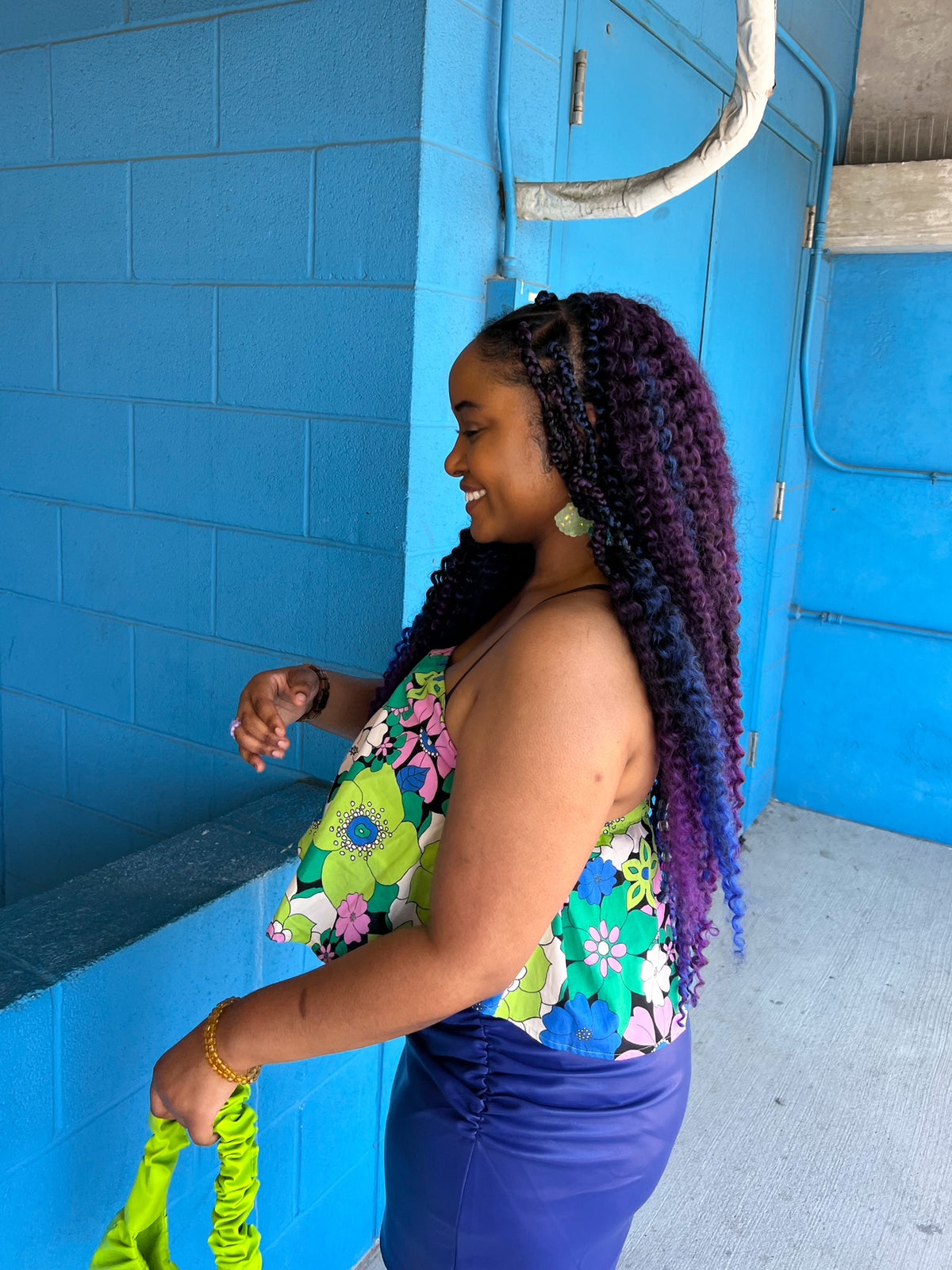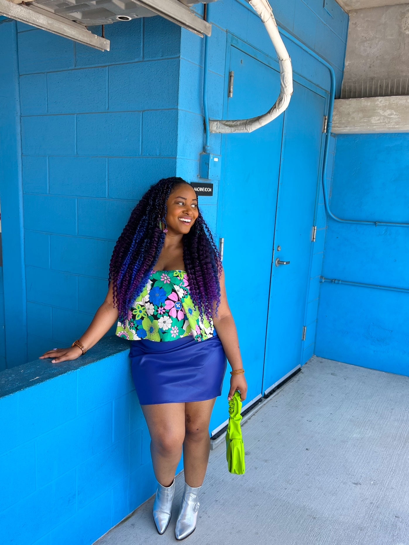 The Just for You Flower top has a tube top fit with stretchy back detail. It features various flowers in blues, greens, and pinks. Seen paired with the Brunch Blue Leather skirt.