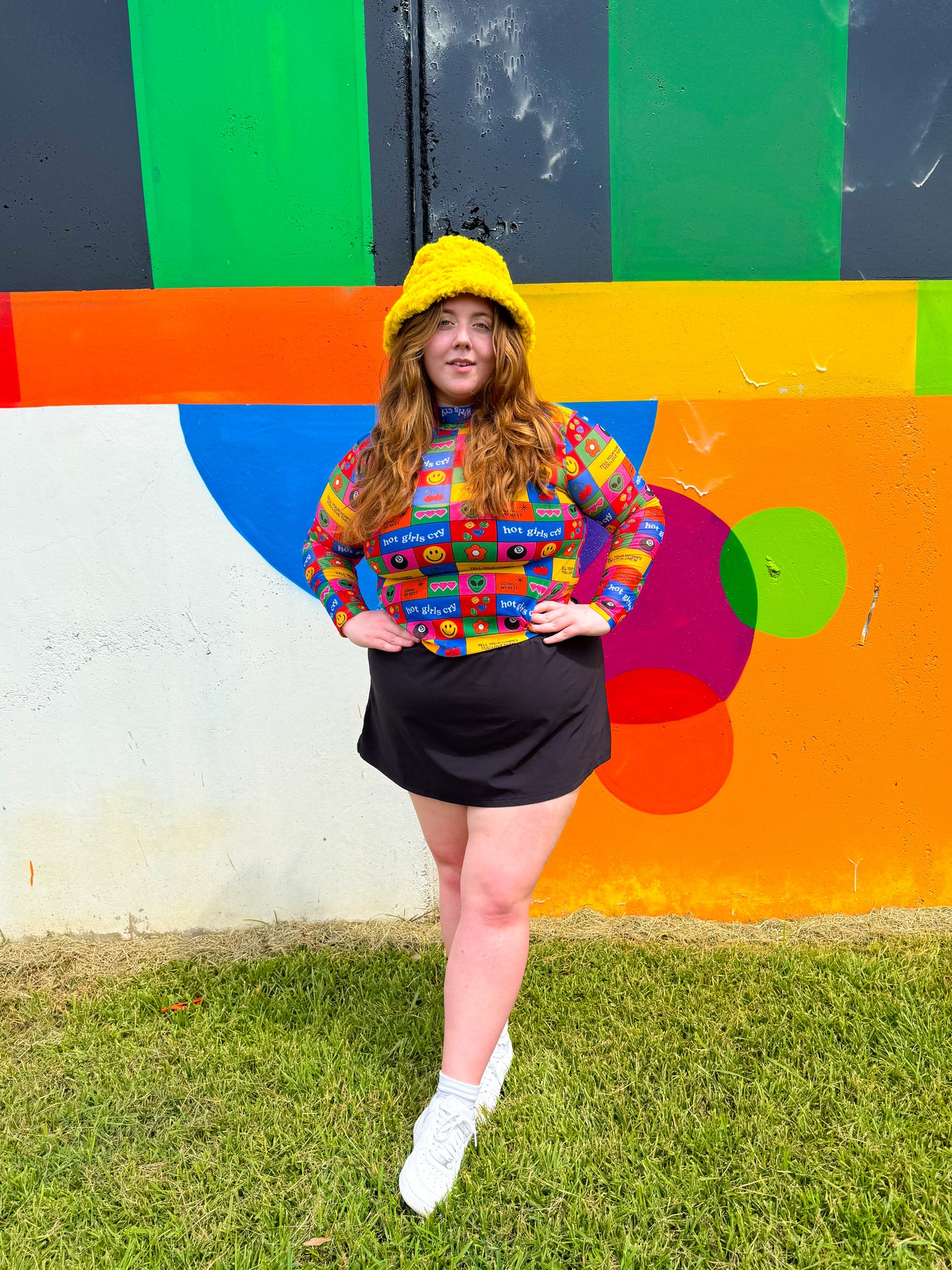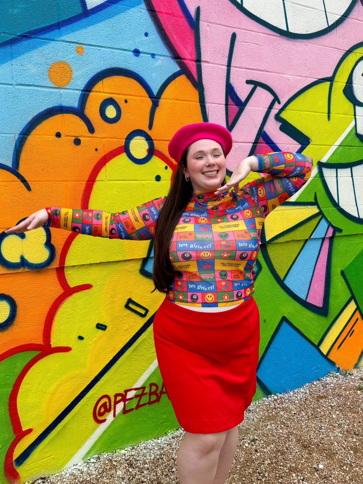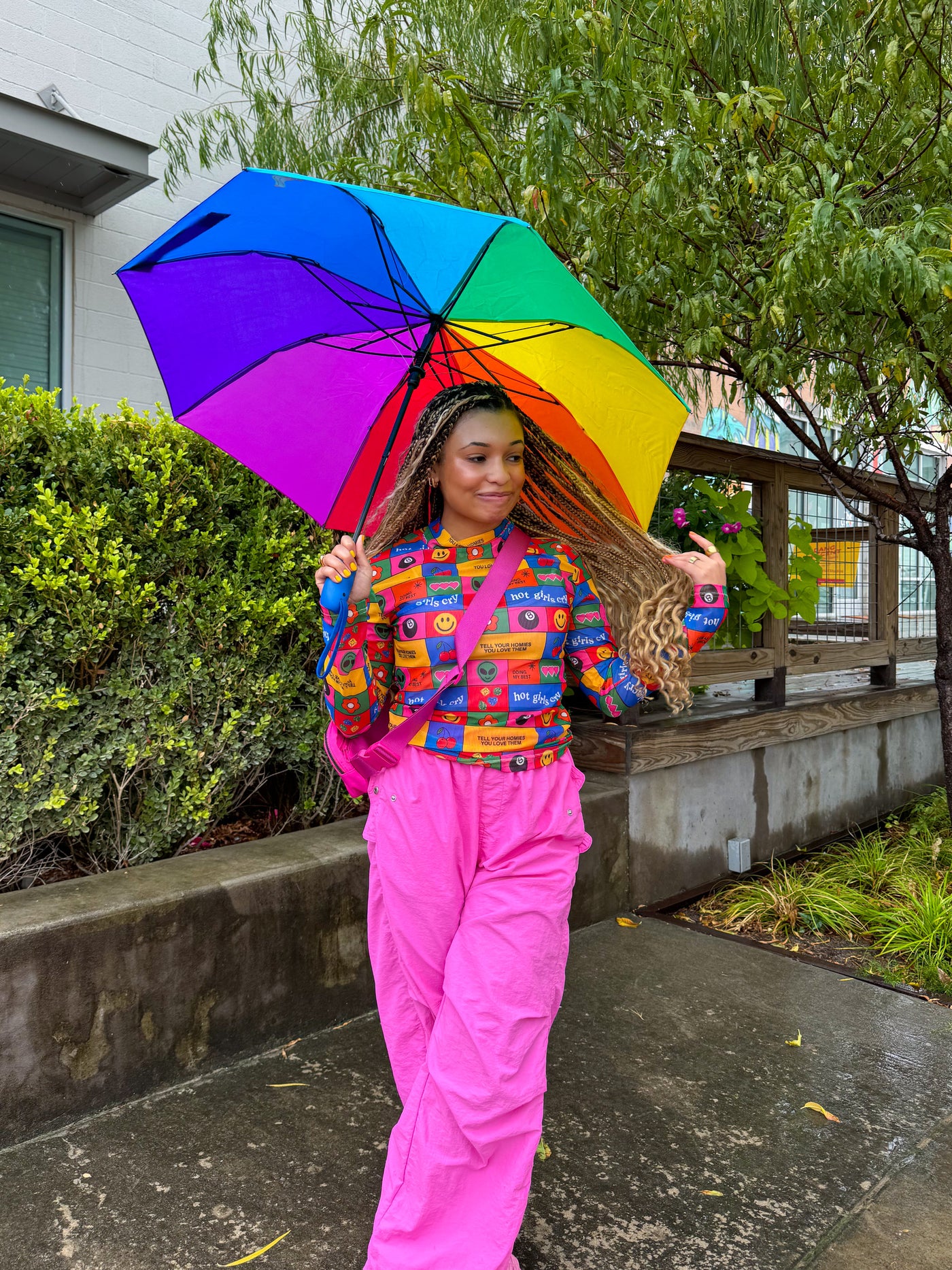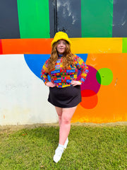 The perfect layering top has entered the rainbow closet!! A fun & funky design AND a lightweight material perfect for layering?? What else could you need?! The fun designs on this top makes it easy to wear with a tank top or bralette styled under it, or wear with your favorite funky t-shirt on top! You can even style this item like a bollero for an extra POP! Style with pinks, reds, yellows- really any color in the rainbow! Bring on the funky fashion this fall!!