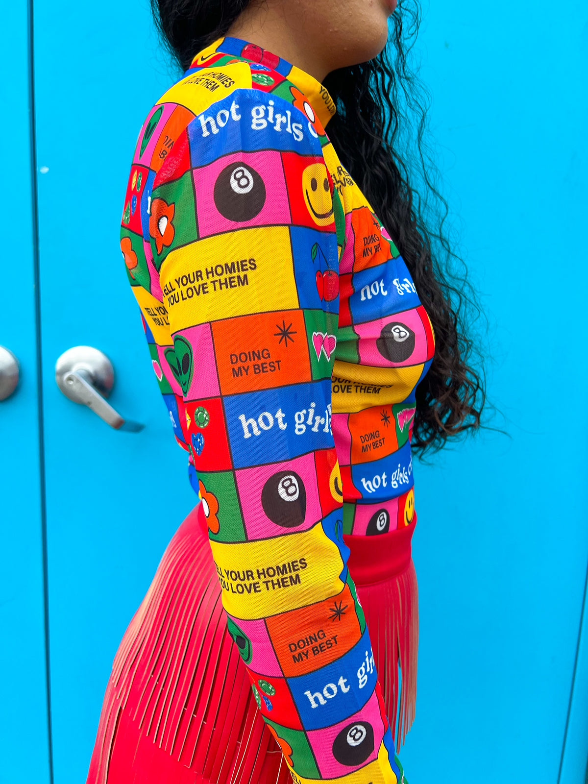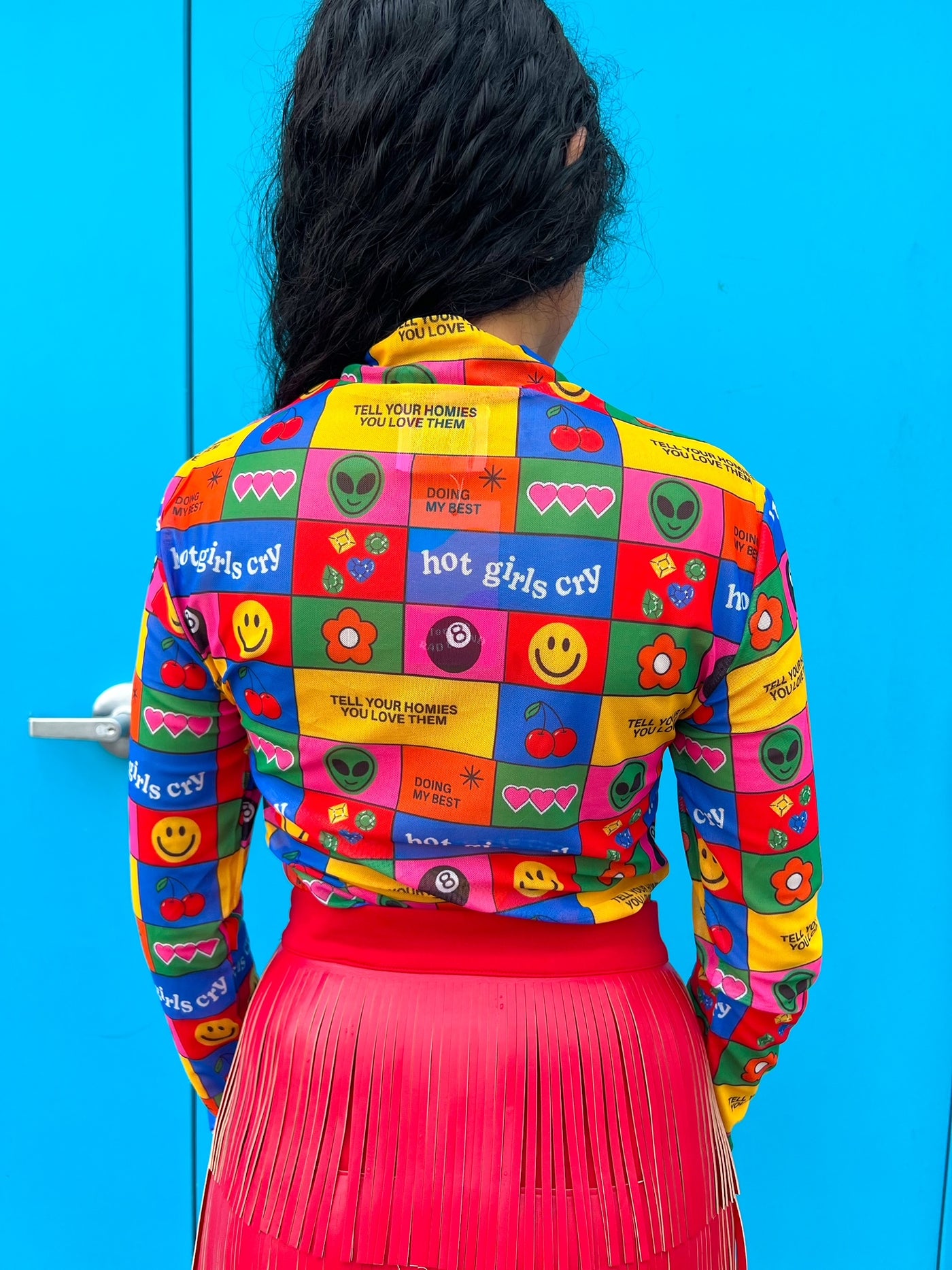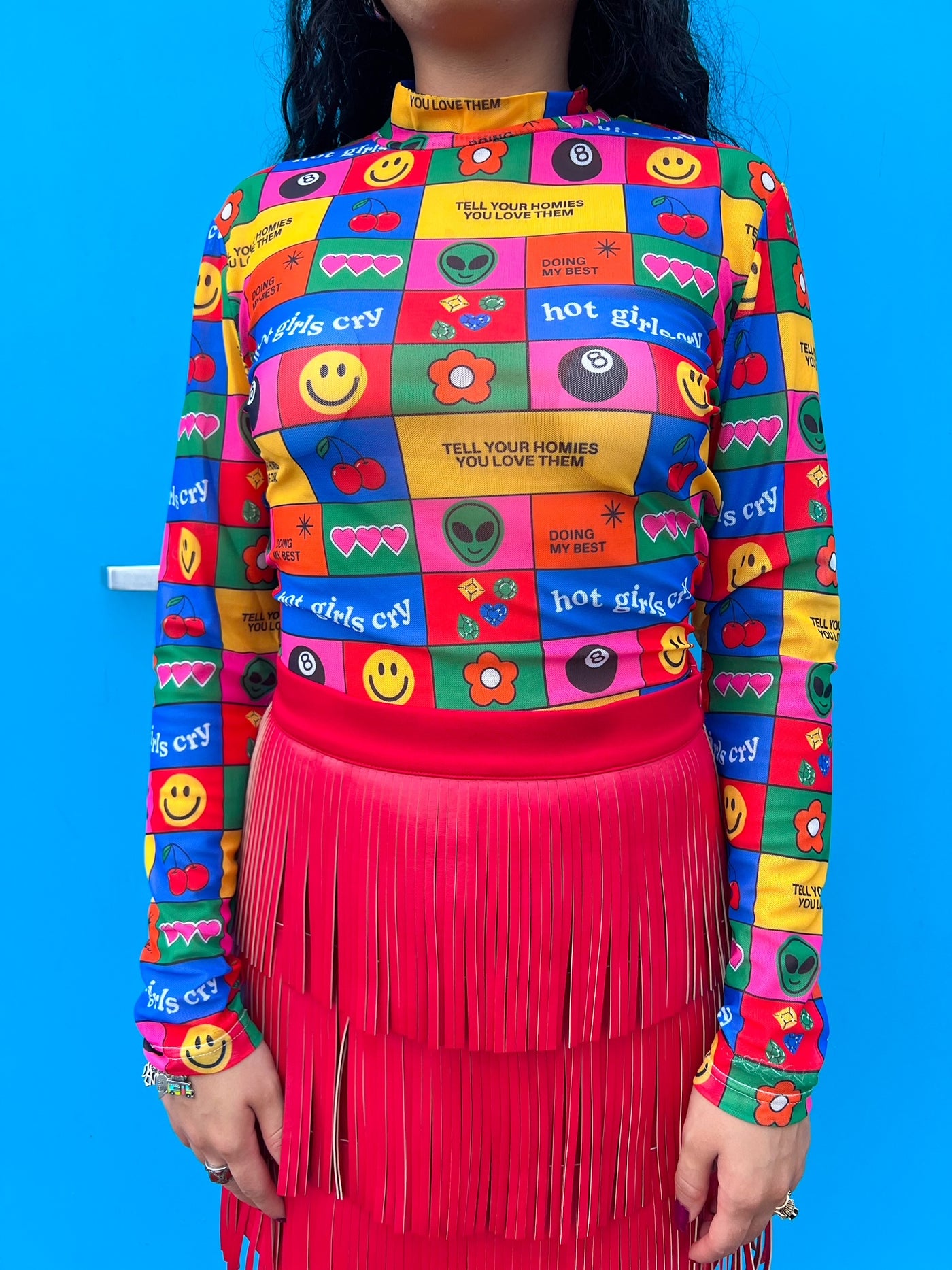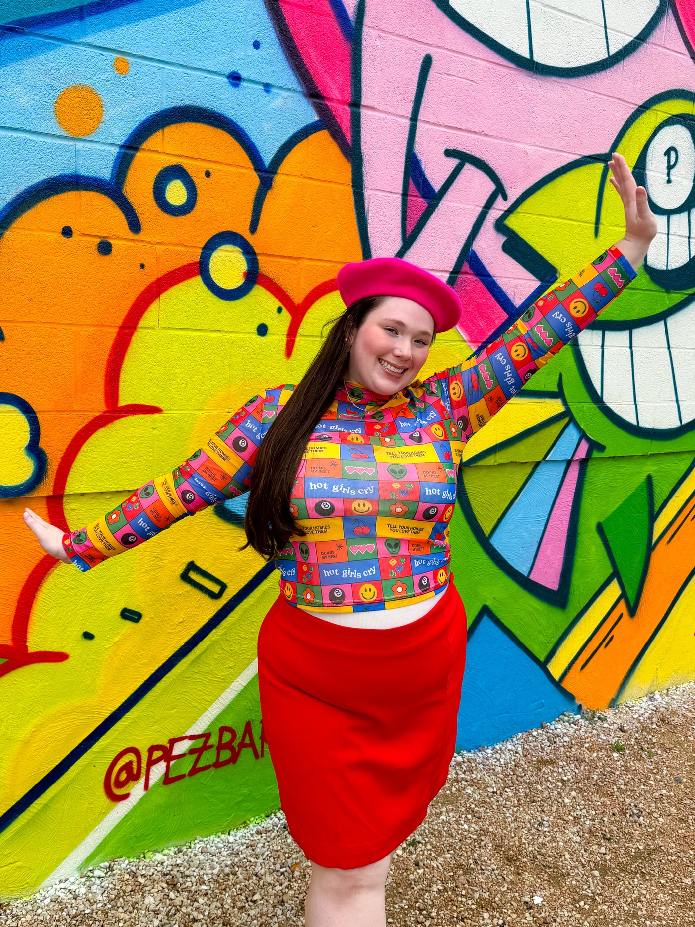 The perfect layering top has entered the rainbow closet!! A fun & funky design AND a lightweight material perfect for layering?? What else could you need?! The fun designs on this top makes it easy to wear with a tank top or bralette styled under it, or wear with your favorite funky t-shirt on top! You can even style this item like a bollero for an extra POP! Style with pinks, reds, yellows- really any color in the rainbow! Bring on the funky fashion this fall!!