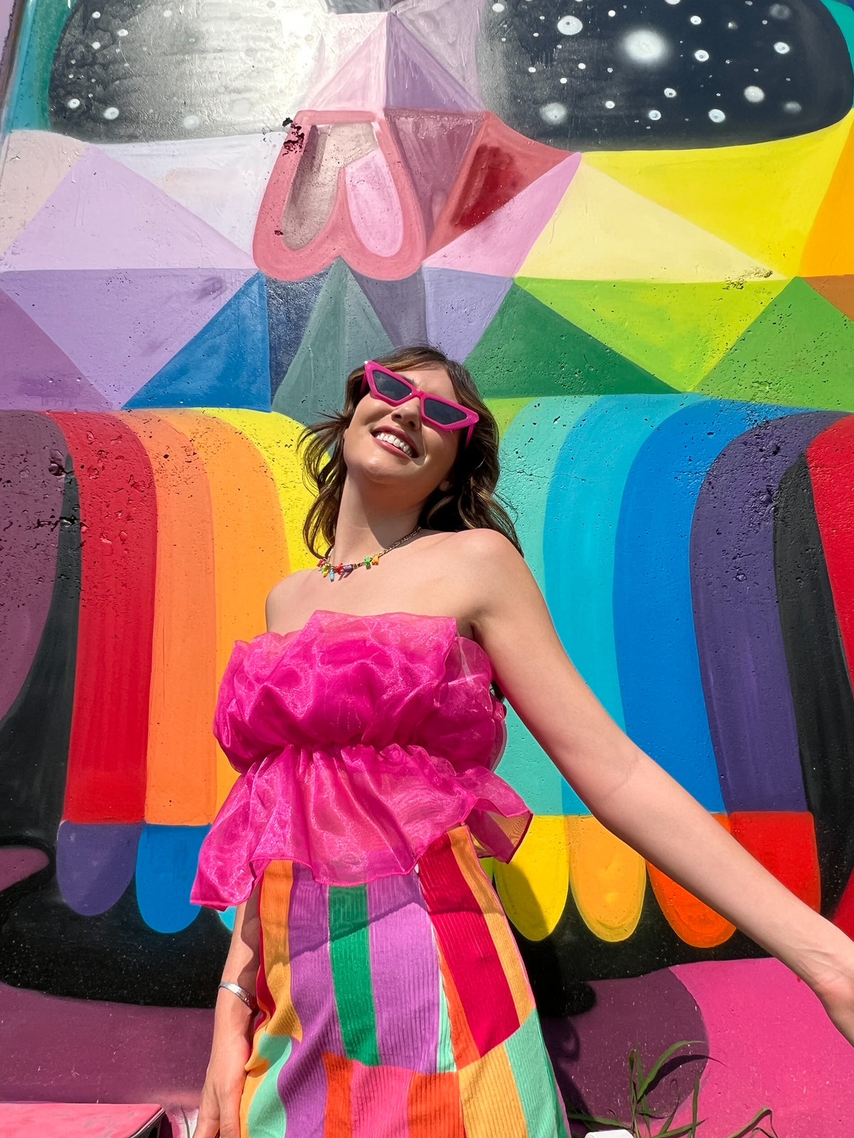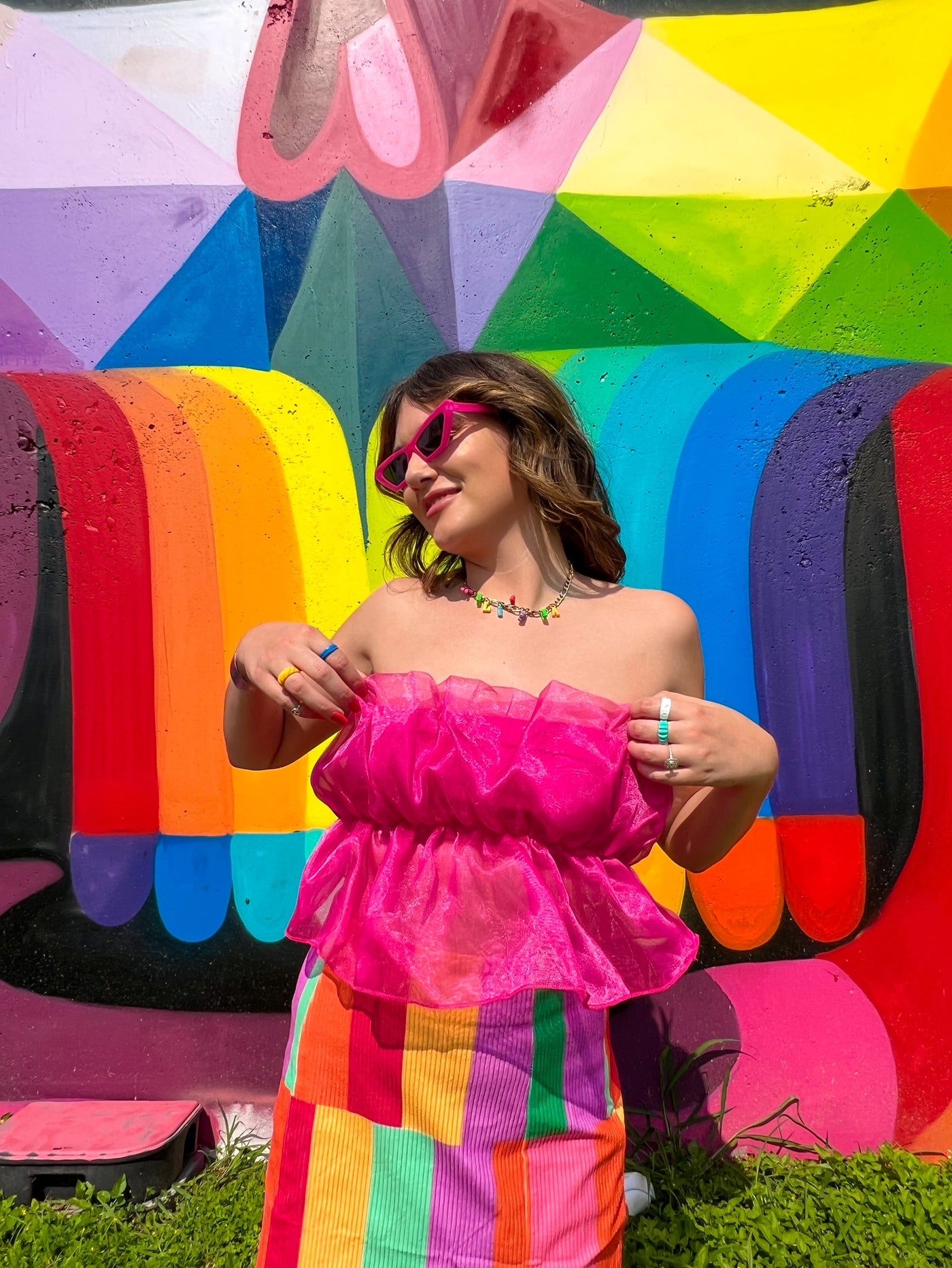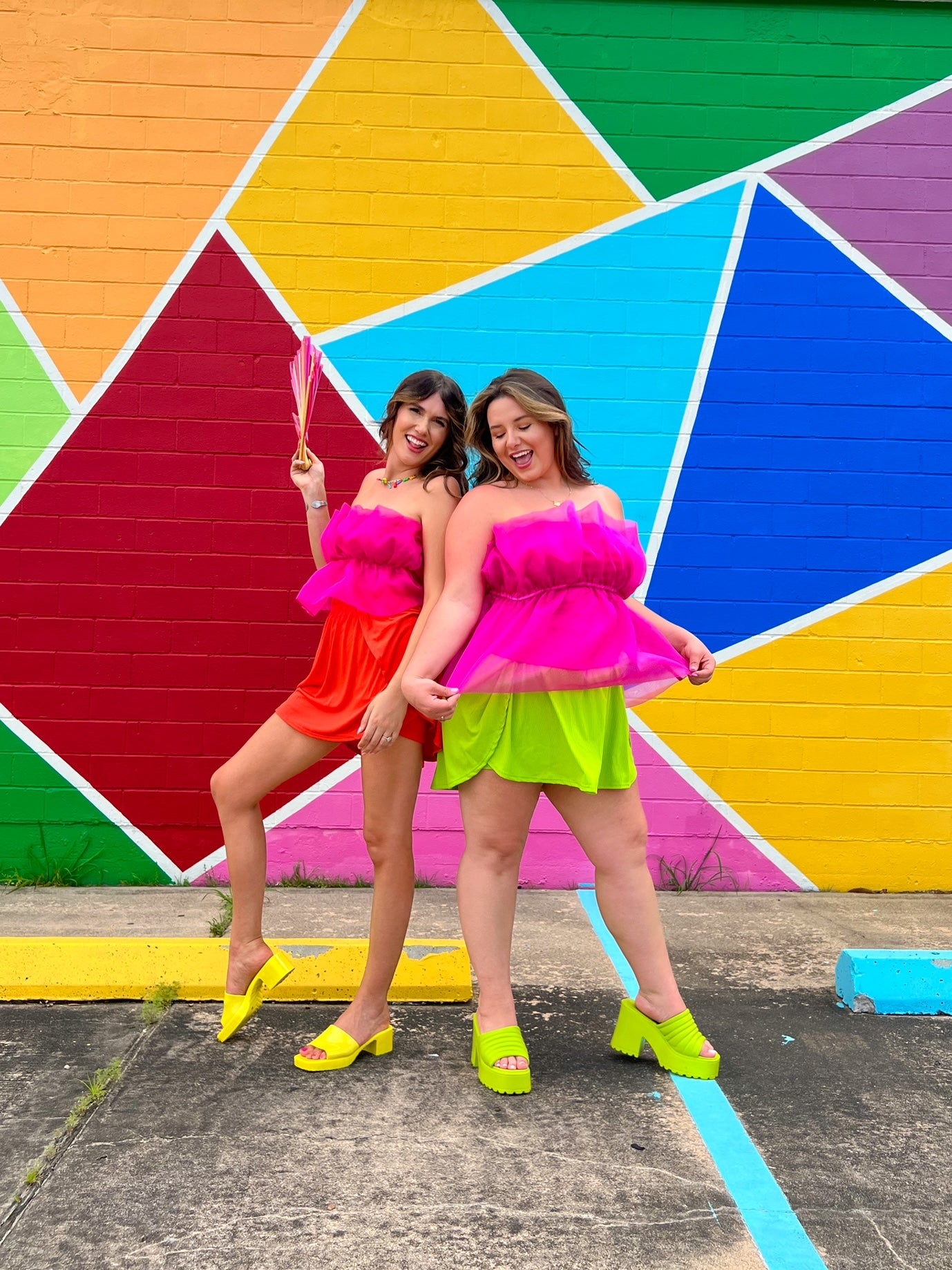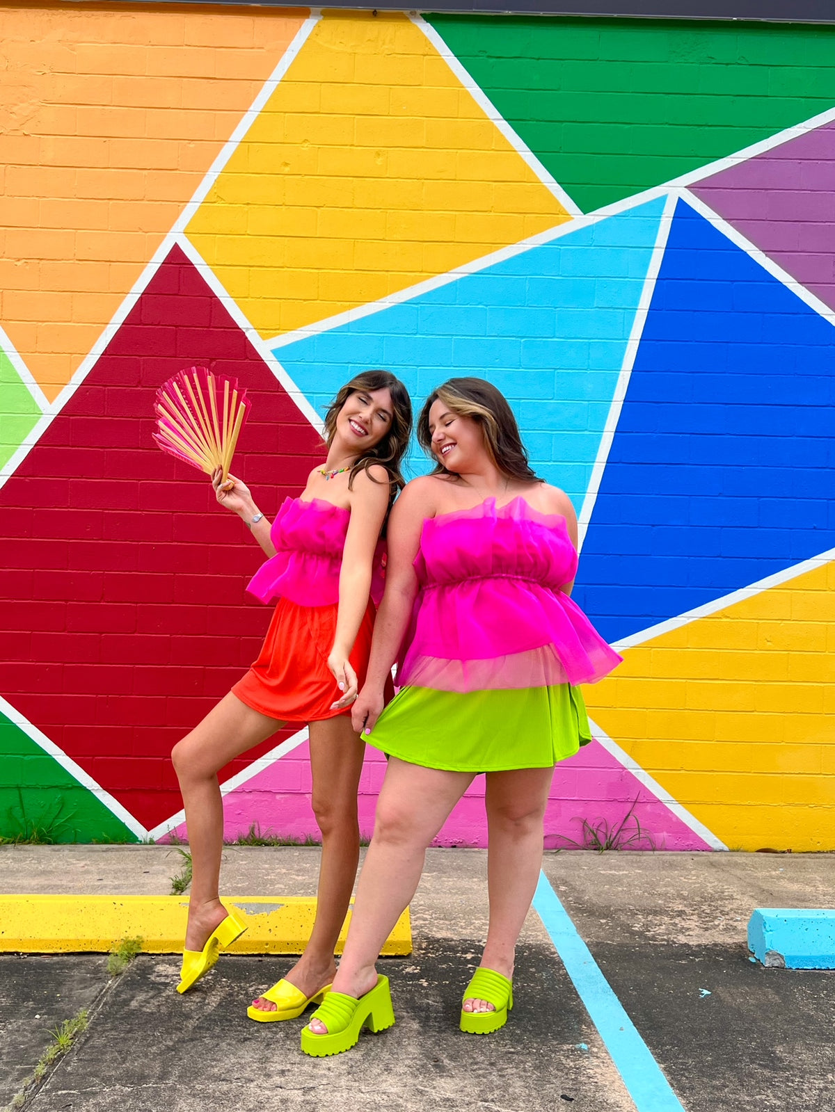 Grab your bestie, she is gonna want to see this! The new Blooms tube top is an adorable, hot pink, tulle top with some extra pizzaz! The solid pink color makes it perfect to match with so many things but this top is far from basic. With its tulle outer layer and a pink inner layer, you will be covered. We paired ours with the Summer Forever skirt in lime and orange.