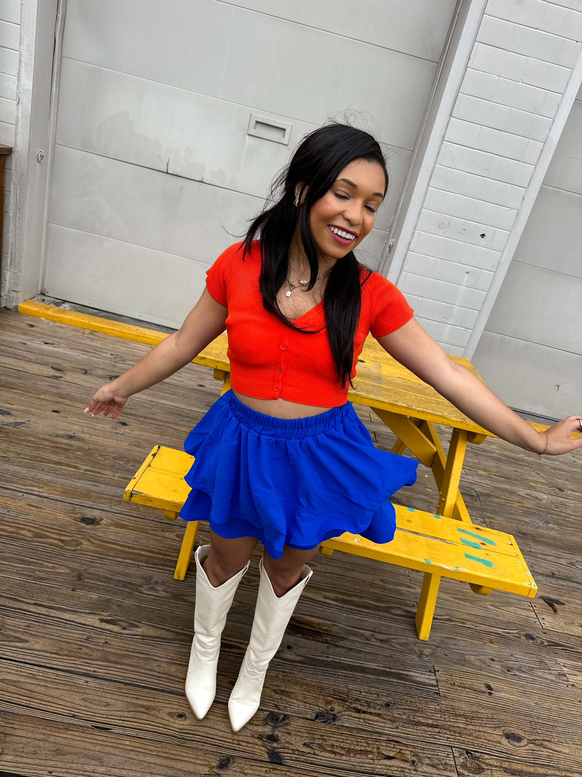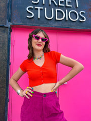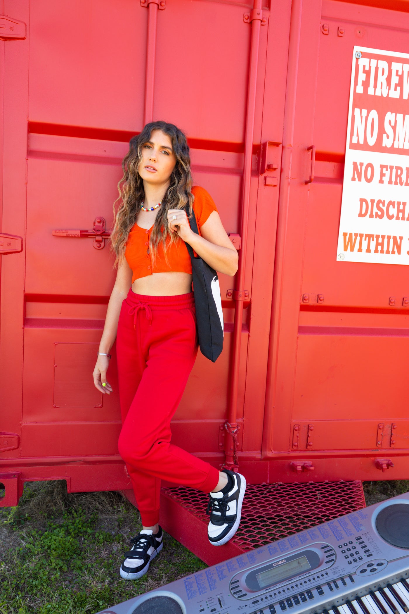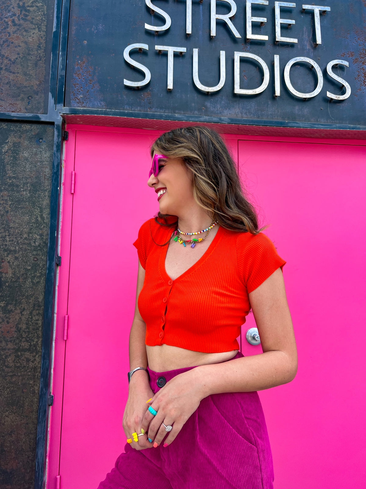 The Keep Me Here buttoned tee is the perfect vivid orange for your winter color palette! The front buttons and V-neck give you a flattering fit, while the bright reddish-orange color makes the statement you’re looking for. A knitted fabric with some stretch creates comfort, with enough give to feel good while still looking put together. Seen paired with our Bright Red sweatpants and Theme Park pants in berry.