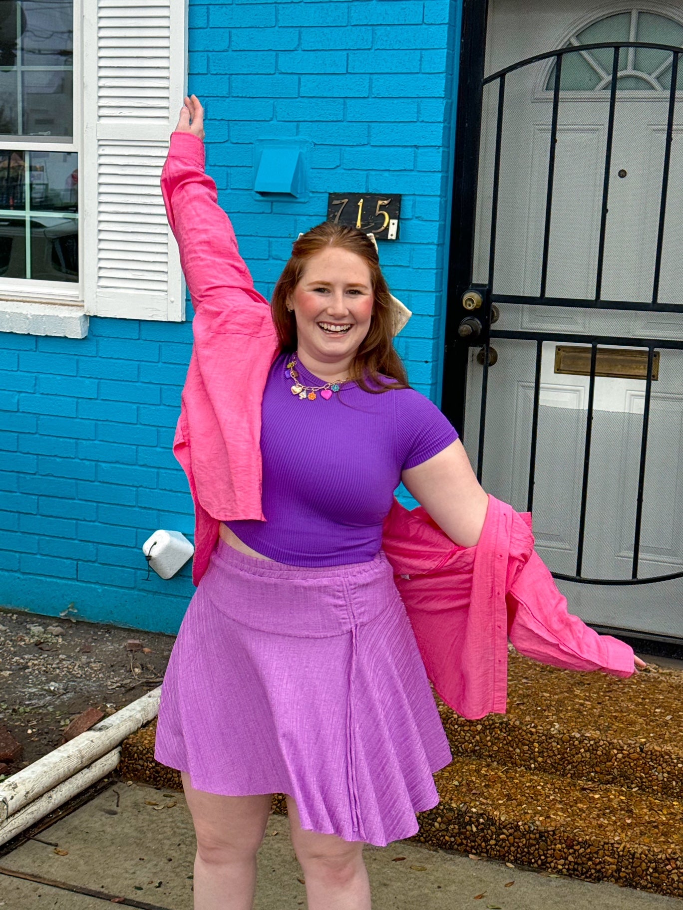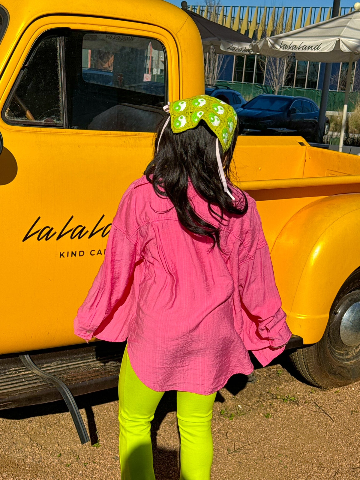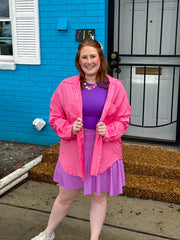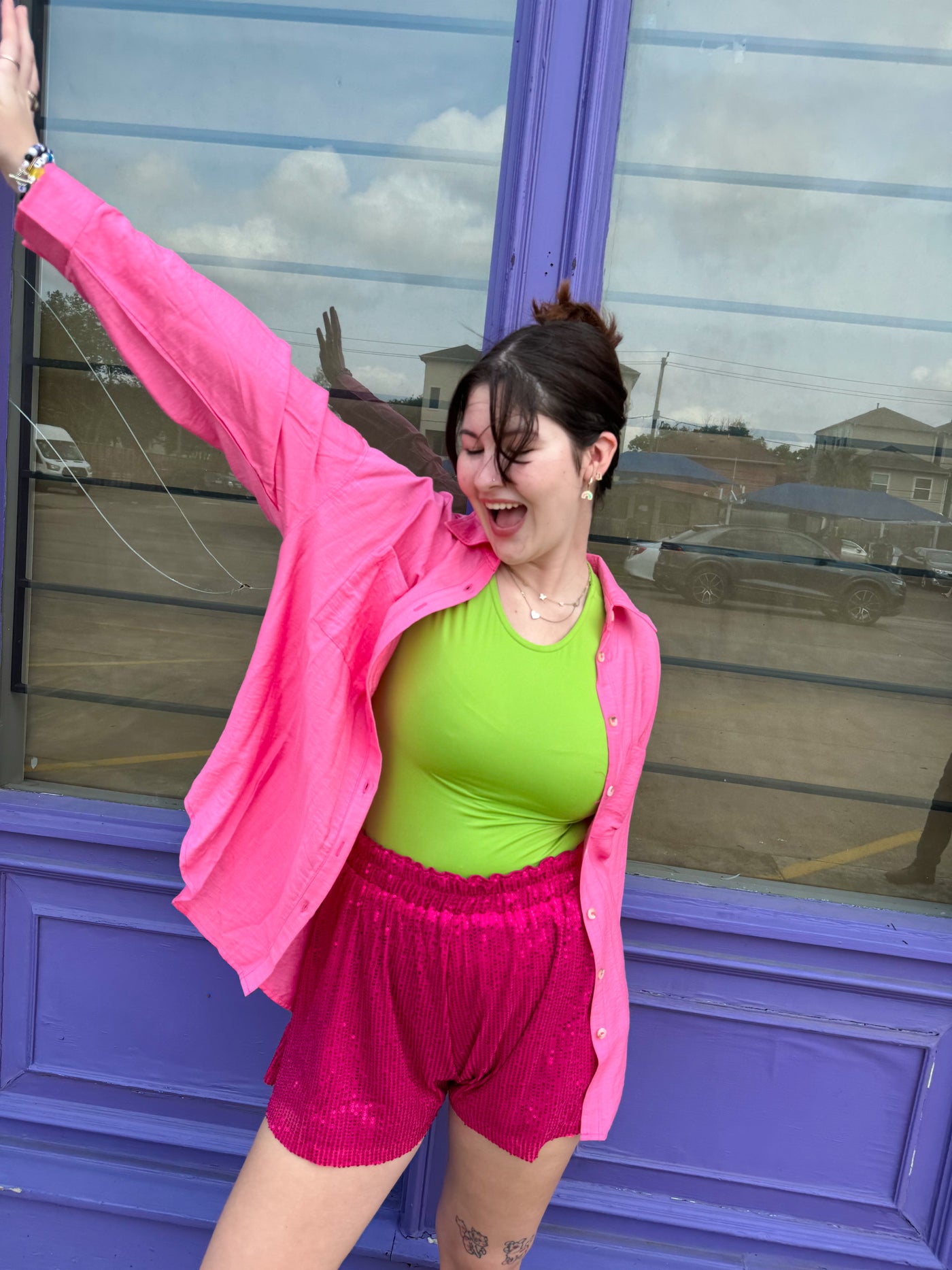 The Pink I Think buttondown that goes from the beach to a girl's date. This lightweight buttondown is the perfect layering piece for the summer. Seen paired with the Lounge Tank in Fuchsia.