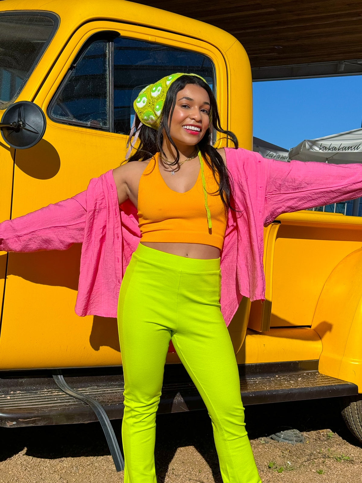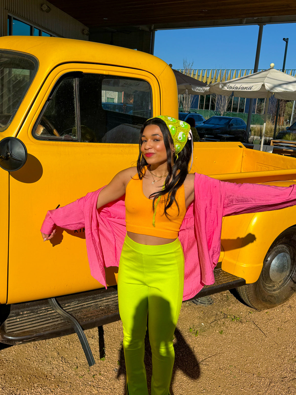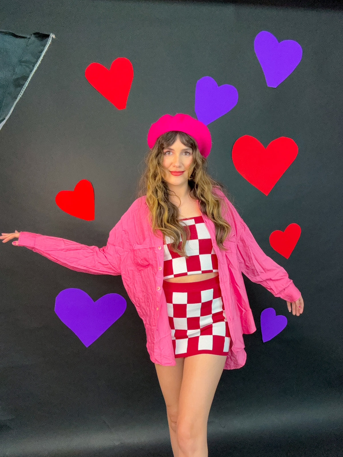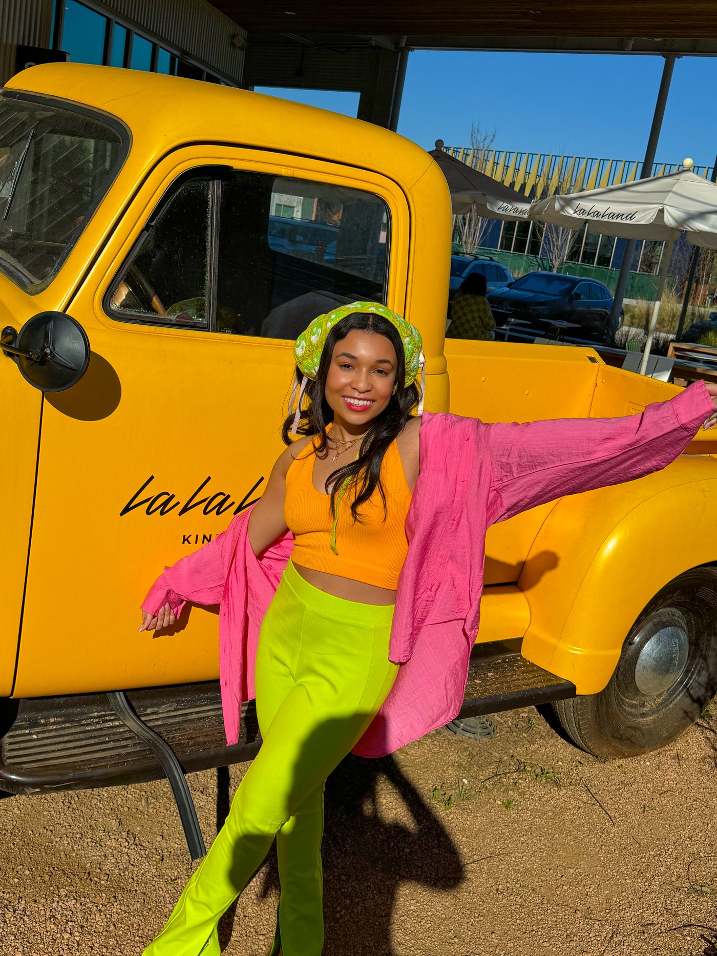 The Pink I Think buttondown that goes from the beach to a girl's date. This lightweight buttondown is the perfect layering piece for the summer. Seen paired with the Lounge Tank in Fuchsia.