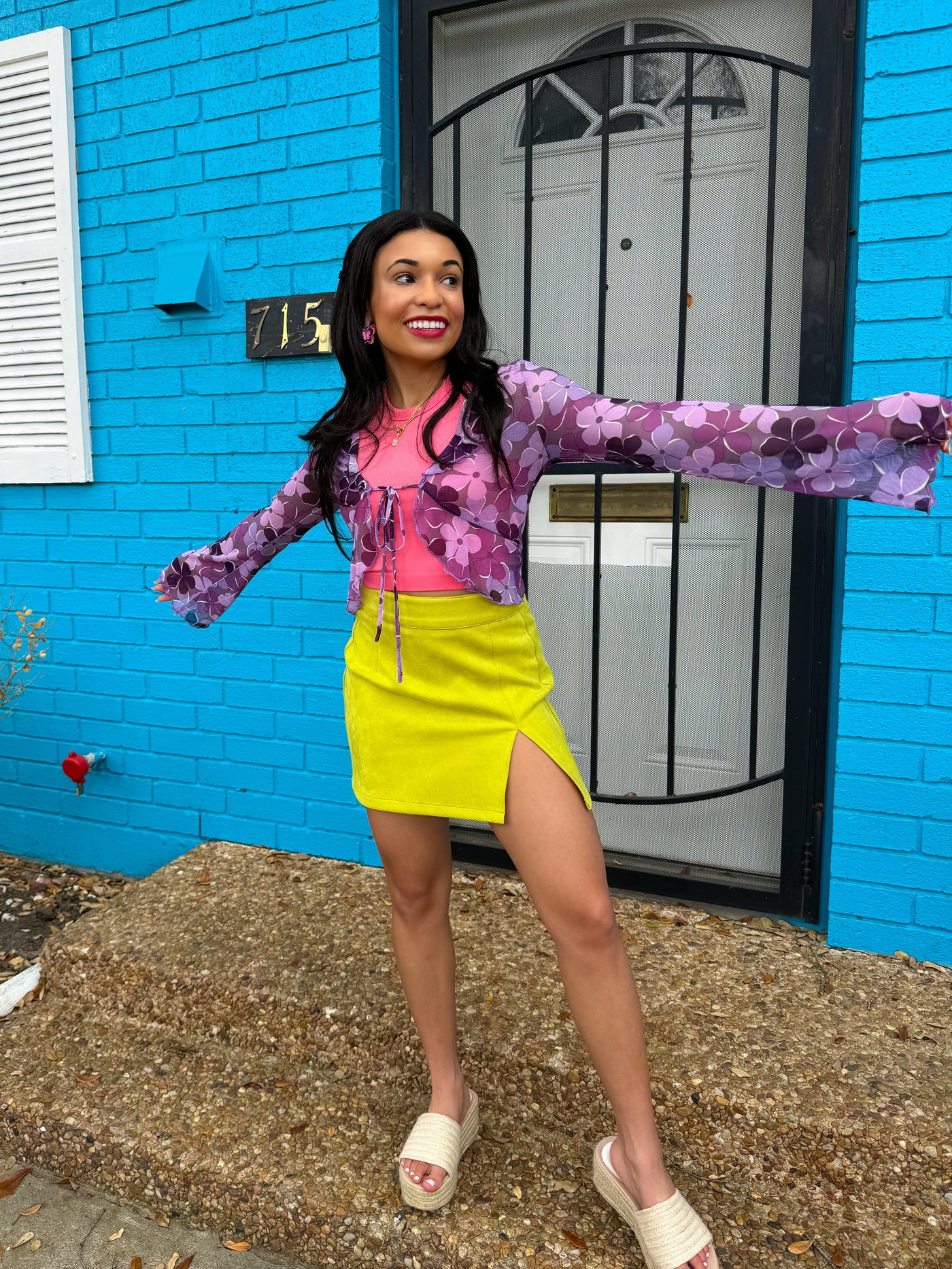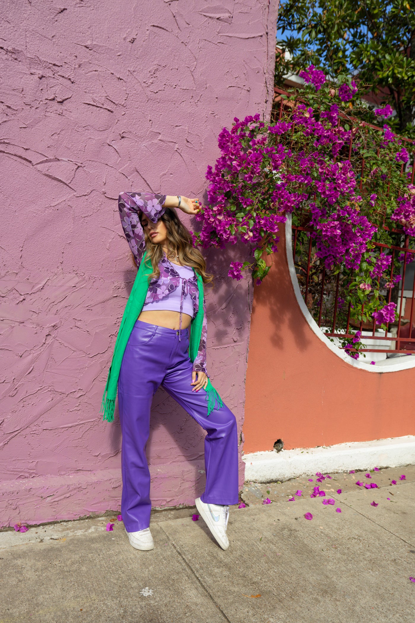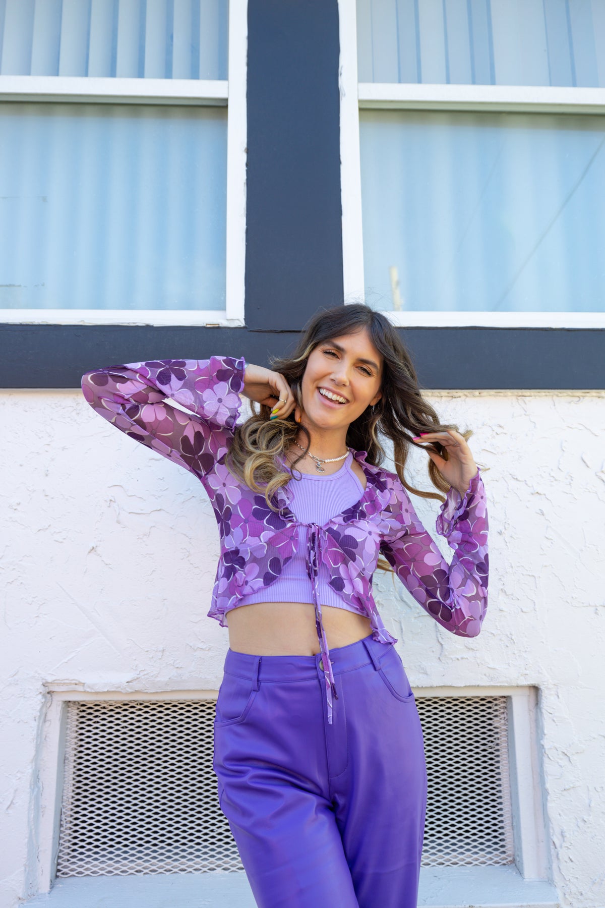 This cute, lightweight long-sleeve top features a ruffled hem and adorable bell sleeves. Made from sheer fabric with a cool flower print, this top is great for layering over lounge tanks or fitted tops. Seen paired with the Lilac Lounge Tank and the Purple Mystery leather pants.