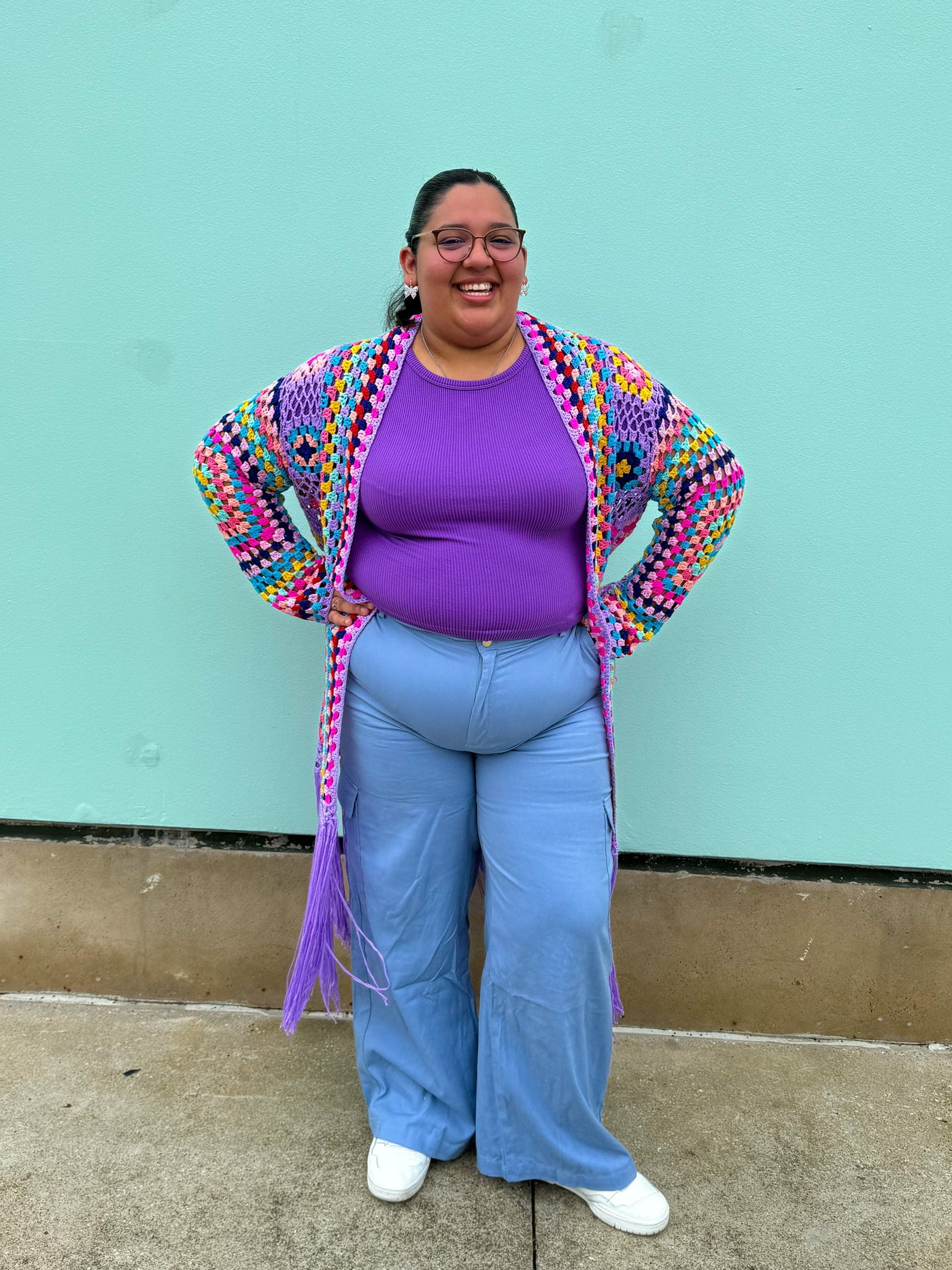 The most MAGICAL cardigan you have ever seen is here and we are OBSESSED!!! The fringe, the rainbow details, the fit, the shade of purple- truly nothing is more iconic than this cardigan!! Style with an equally as colorful outfit or spice up some neutrals by wearing this cardigan on top!!