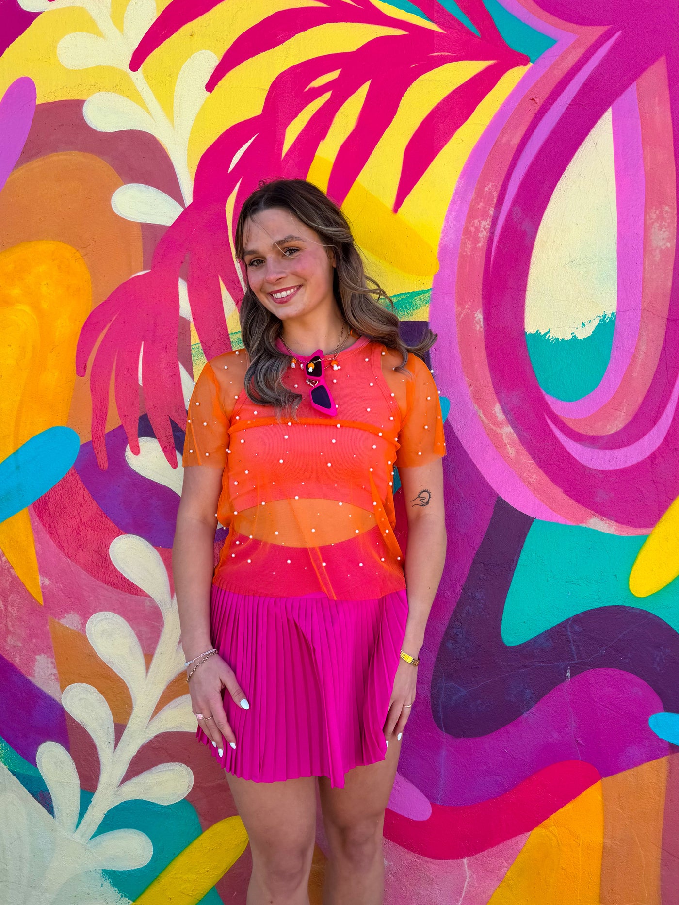 A fun layering top for spring?! Say less! This short sleeve orange sheer top is perfect for showing off a cute tank top or bralette- plus the pearl details bring a little sparkle! Pair with oranges, yellows, pinks, and blues, or style this top with your favorite pair of jeans!