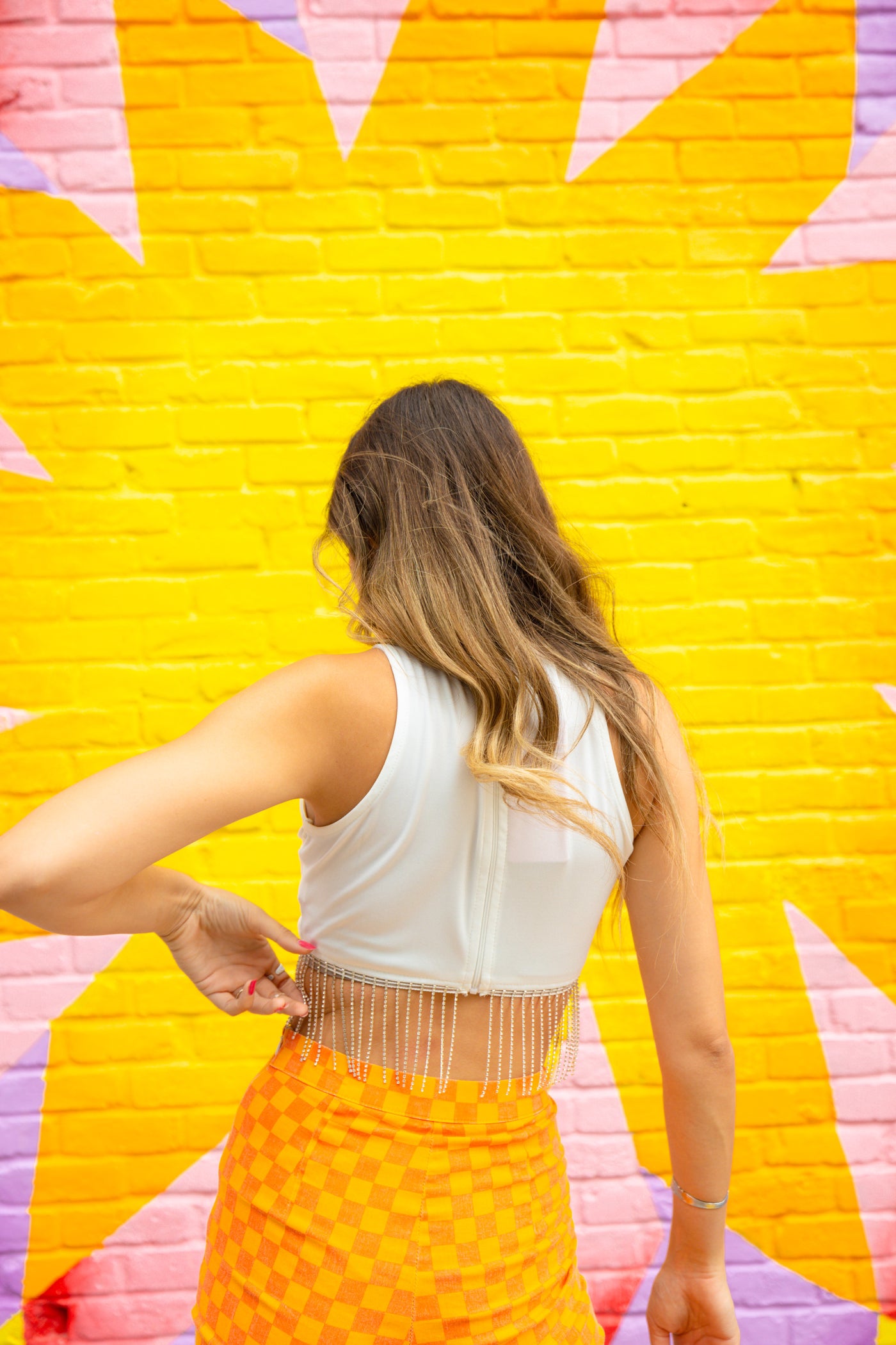 This elevated white tank is brimming with bling. The rhinestone tassels and sparkle give it a lively look that moves and...