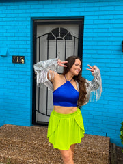 The April Showers halter is a satin material with a subtle animal print. It has a cropped fit and a gorgeous royal blue color. Looks SO cute with greens, oranges, other blues, and pinks!!