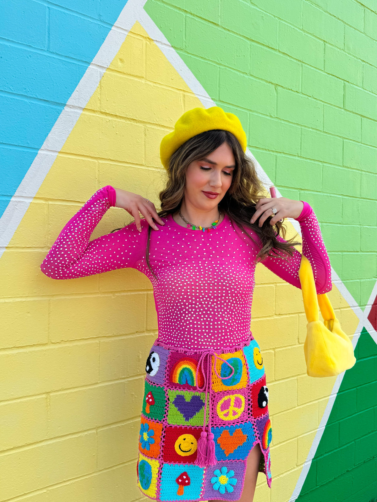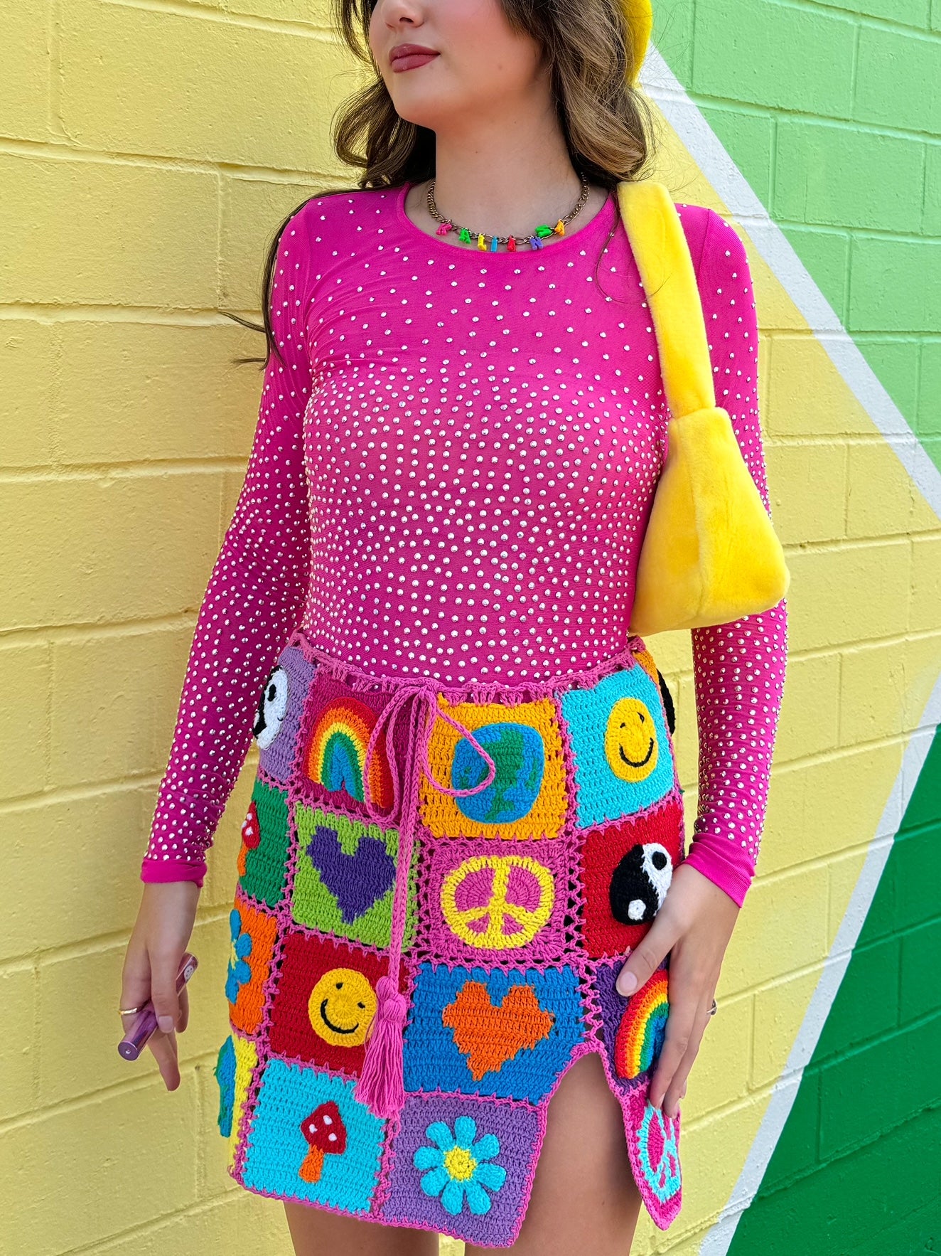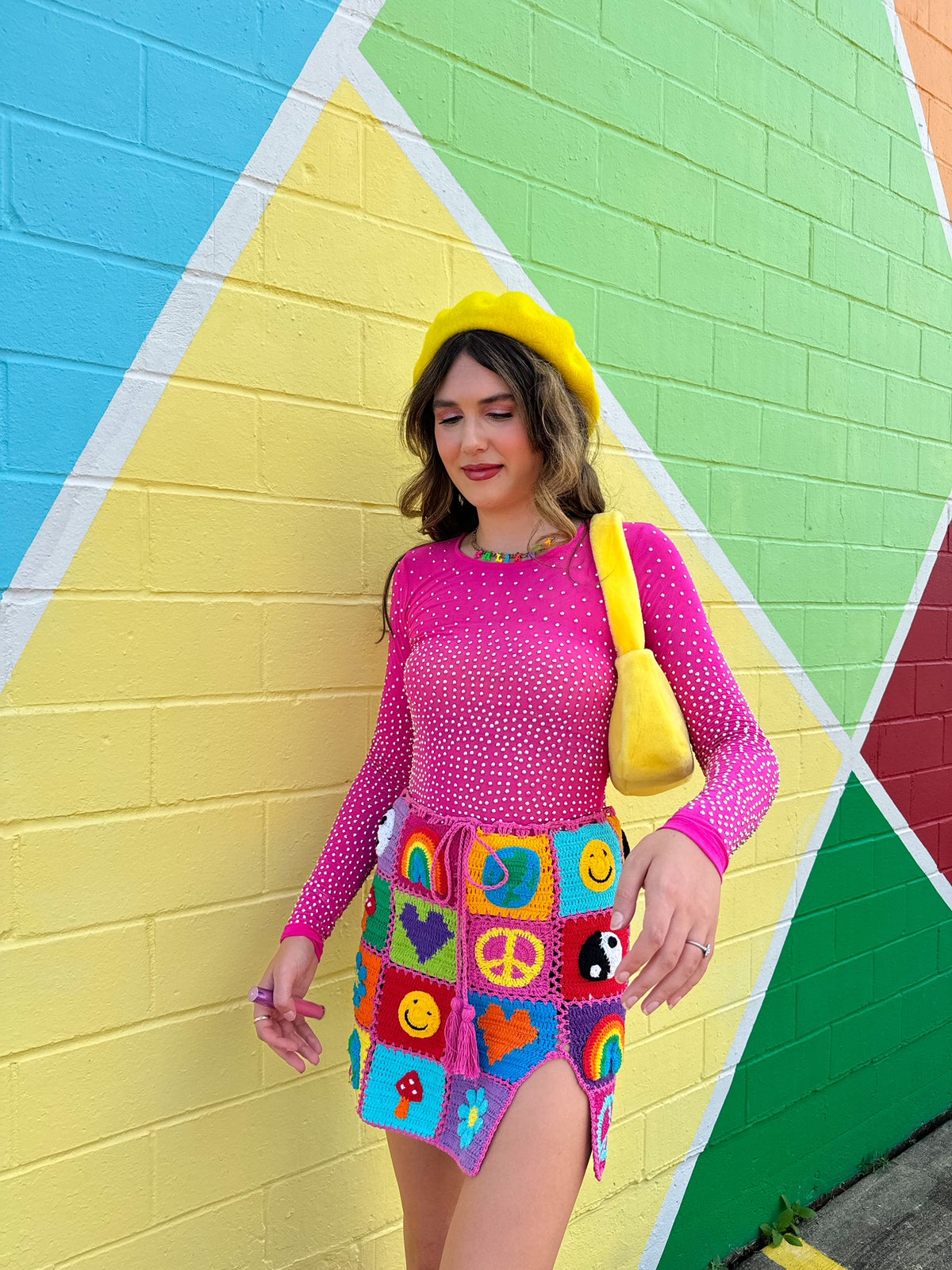 Stun the crowd with this eye-catching bodysuit. A long-sleeved mesh top in a bright fuchsia color features rhinestones all over, making it sure to turn heads as everyone wonders where you got it from! The bodysuit has a clasp that makes it easier to get off and on. Fabric is a stretchy mesh material that can be layered over a nude bra or a tank top.