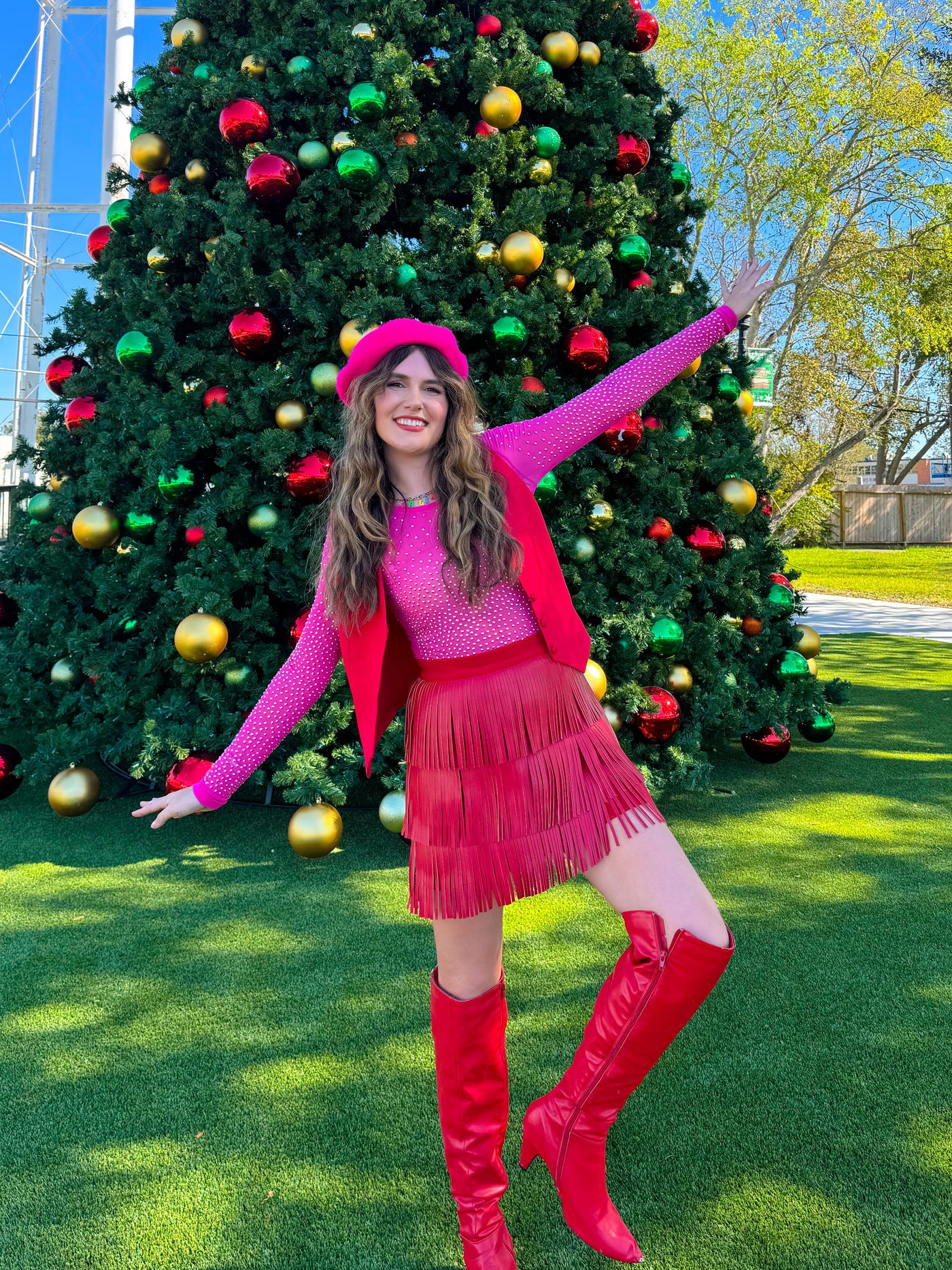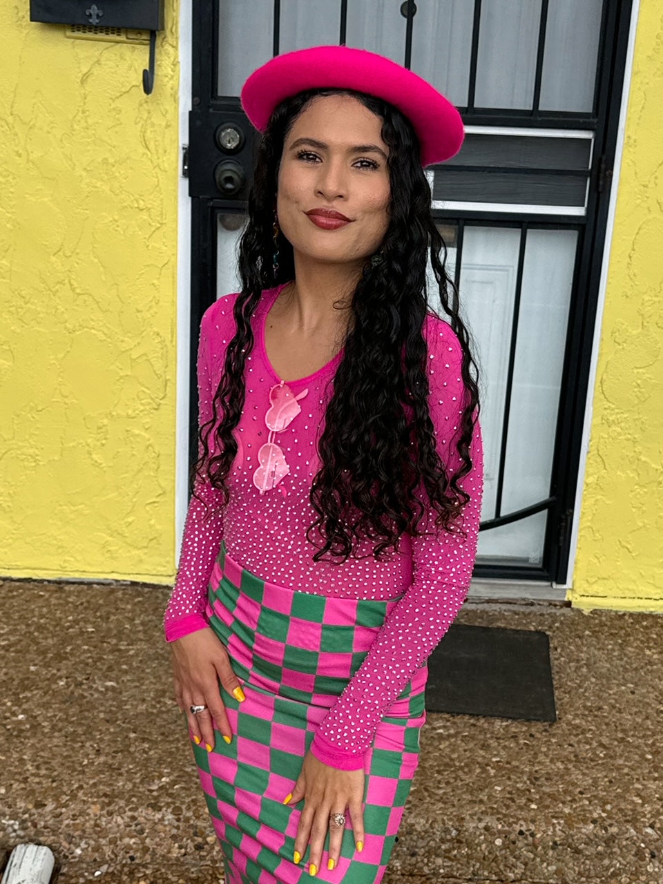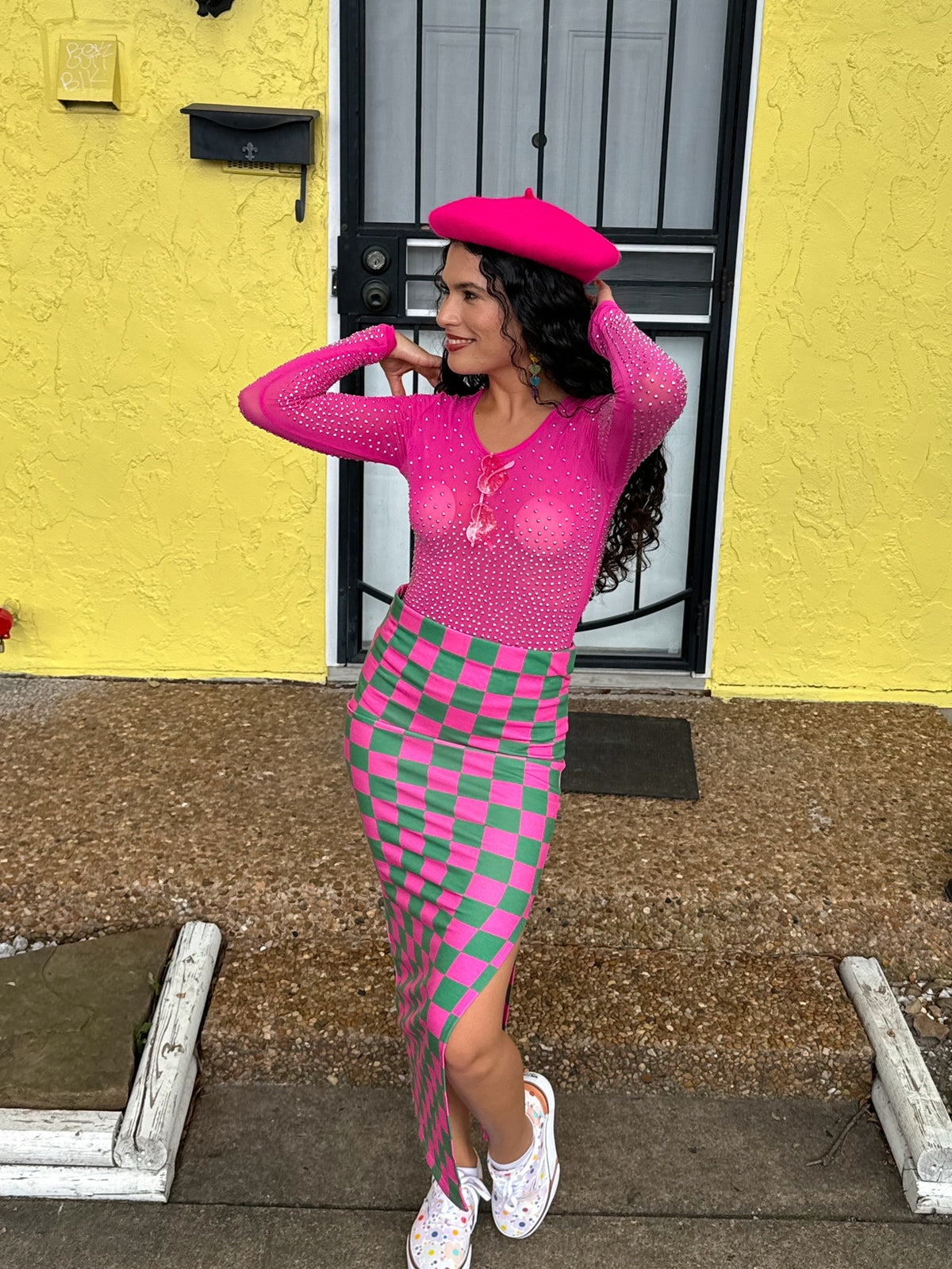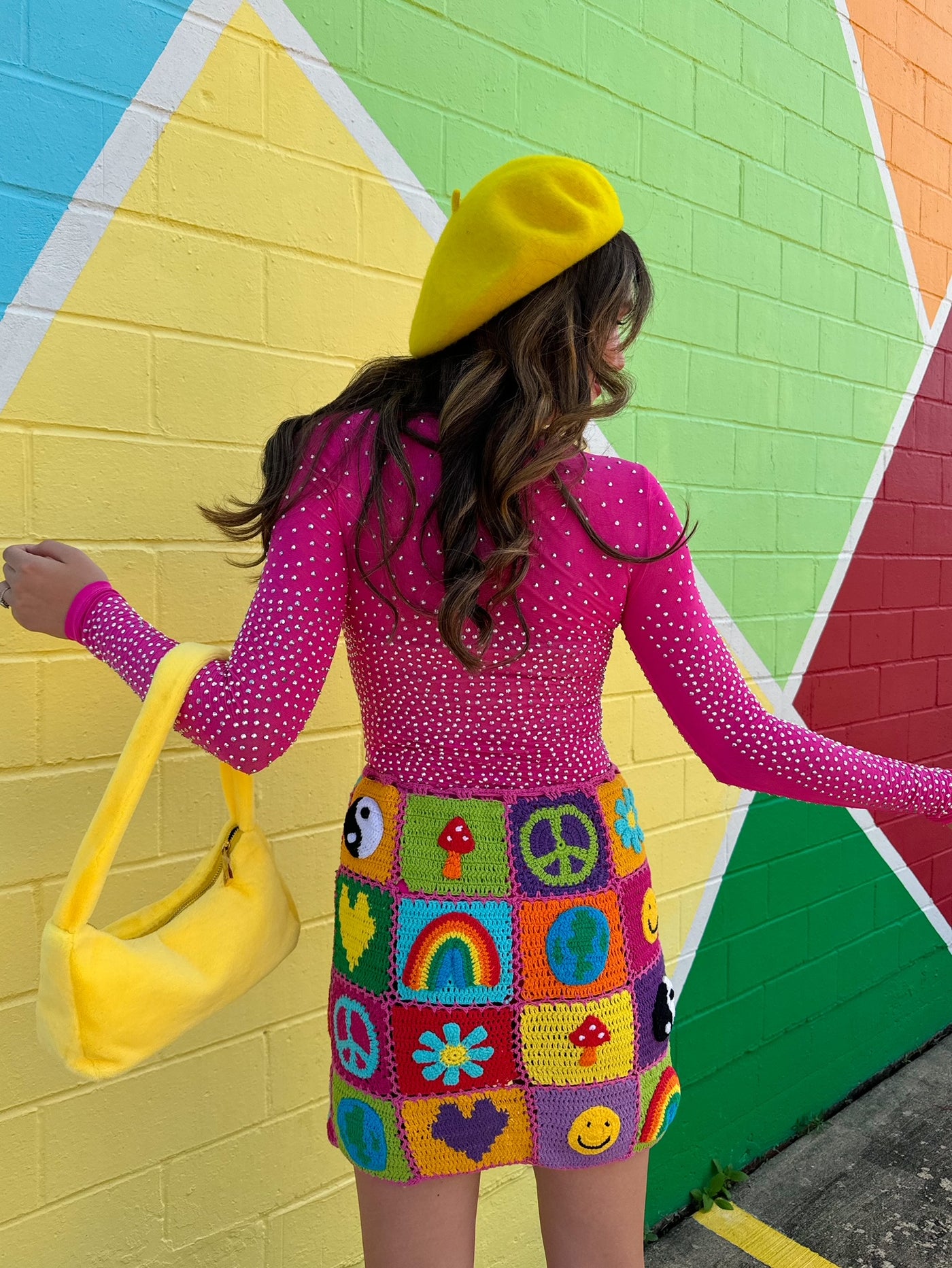 Stun the crowd with this eye-catching bodysuit. A long-sleeved mesh top in a bright fuchsia color features rhinestones all over, making it sure to turn heads as everyone wonders where you got it from! The bodysuit has a clasp that makes it easier to get off and on. Fabric is a stretchy mesh material that can be layered over a nude bra or a tank top.