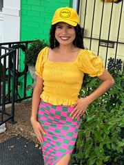 Puff sleeves straight from our dreams and a gorgeous soft yellow color to be obsessed with! This top has a stretchy fabric and stitching to fit just right. Puff sleeves can be worn on or off the shoulder. Seen paired with the Live Free skirt.