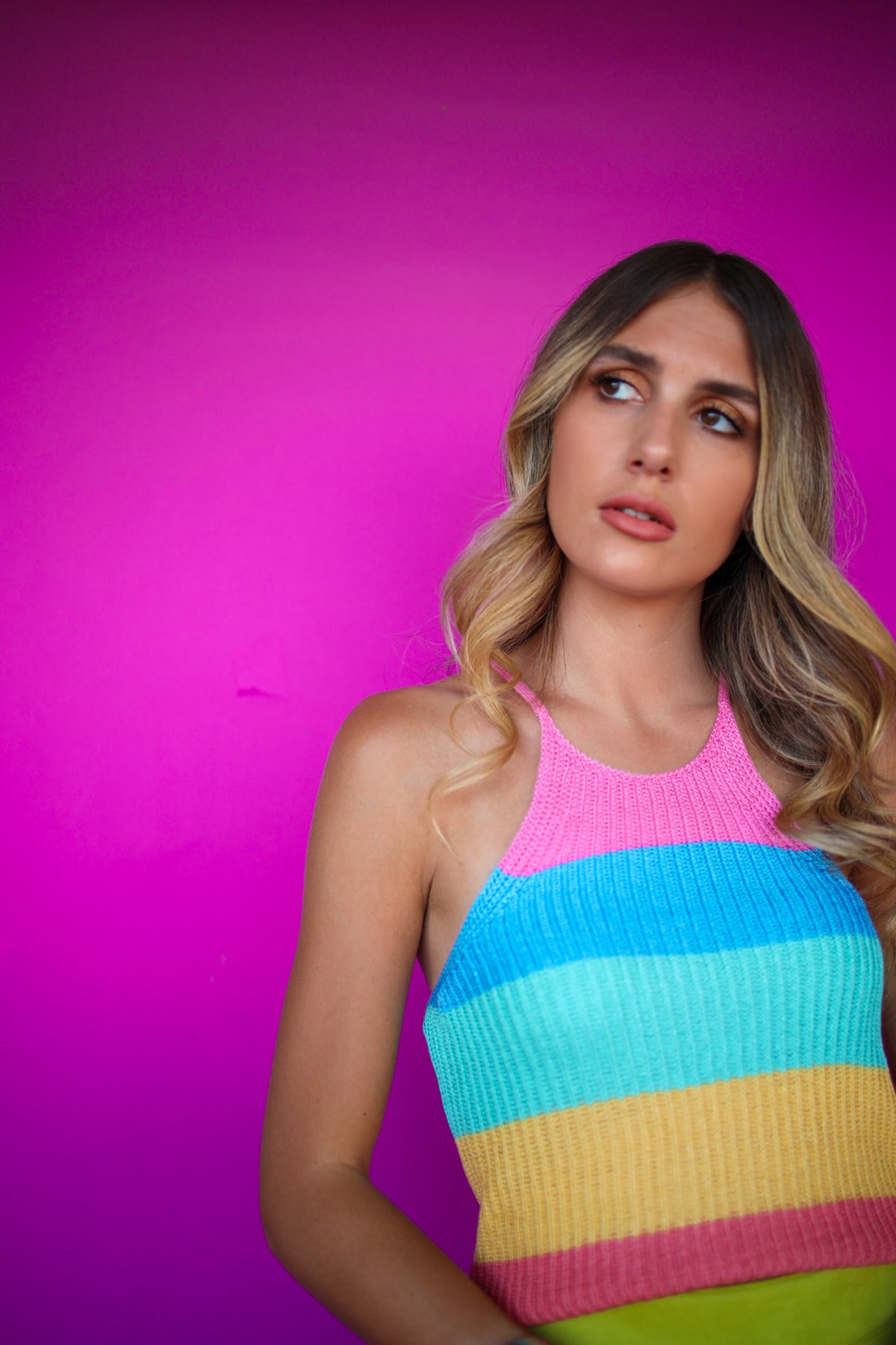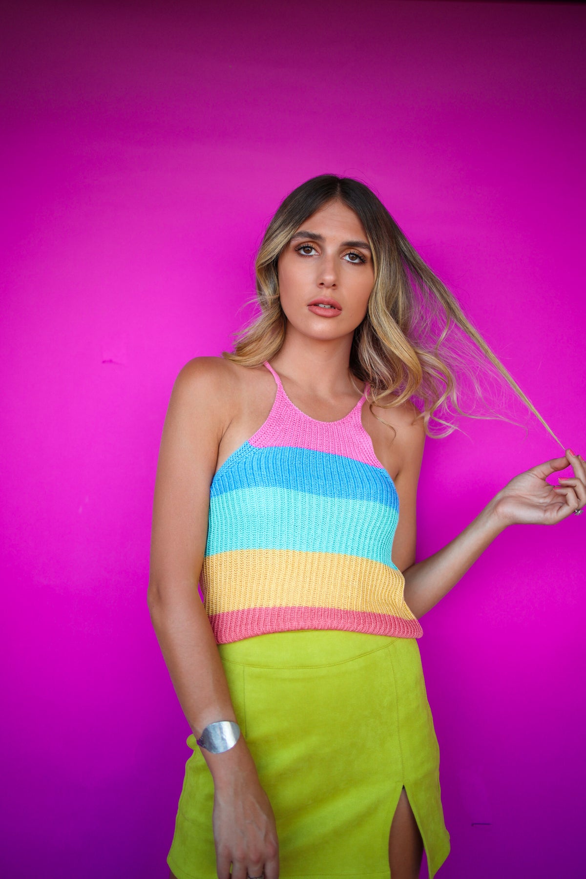 The Twister Pop tank is a relaxed fit, knitted sweater tank with rainbow colorblock. It’s a super soft and stretchy fabric. Pair it with jean shorts or even over a bathing suit. 100% Acrylic