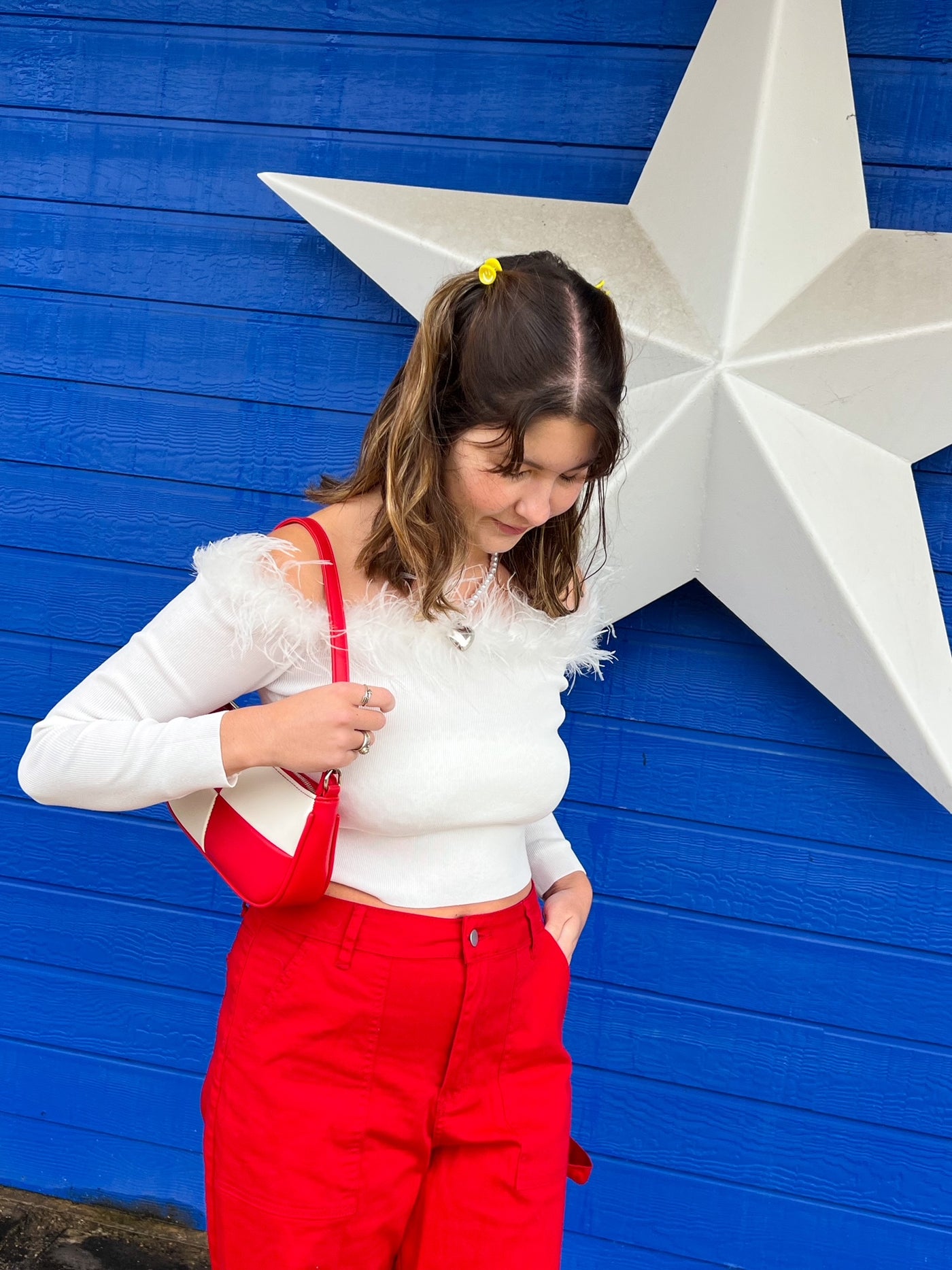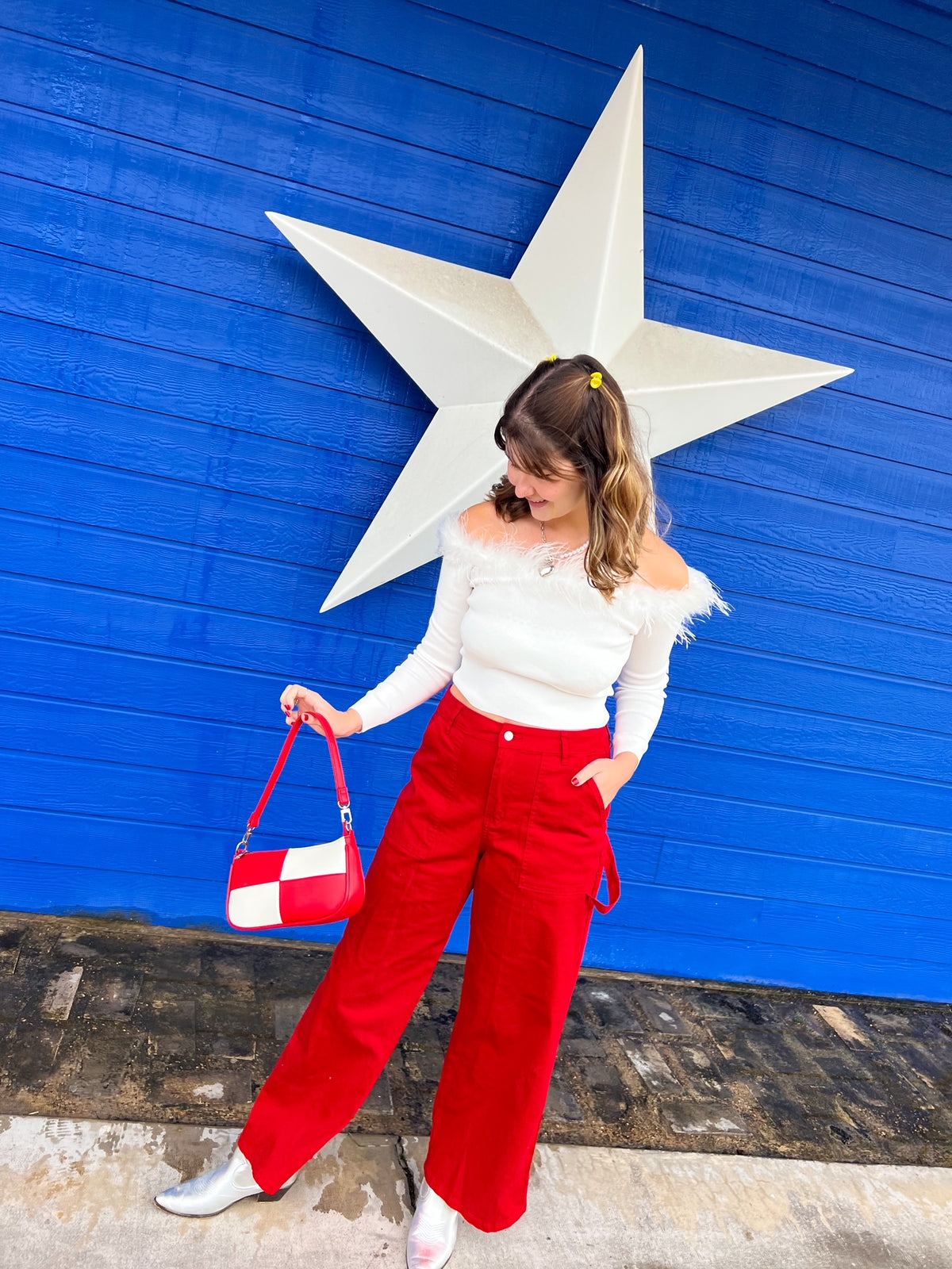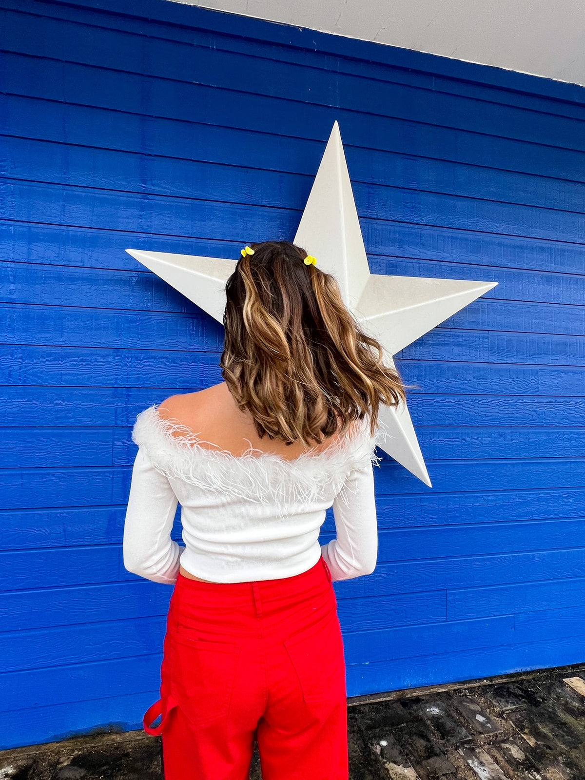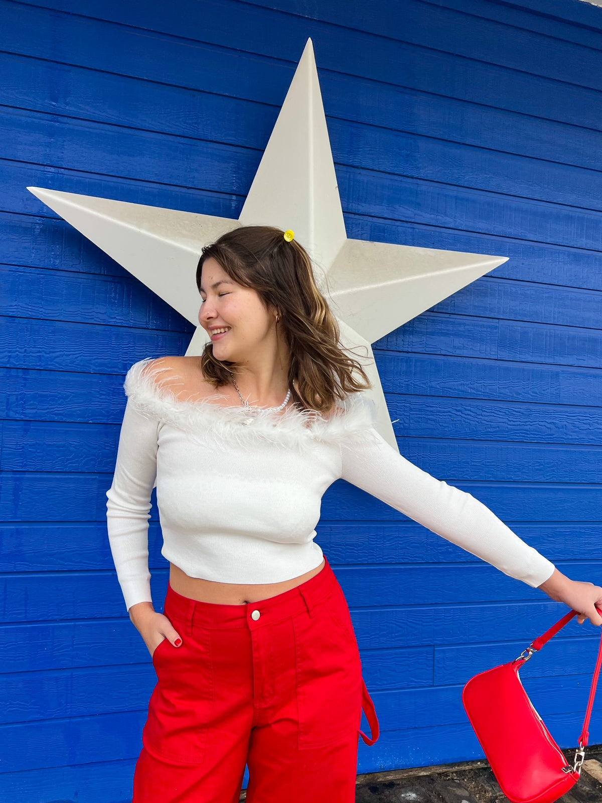 Bring on the FLAIR with our SnowGlobe Feather top. This off-the-shoulder white top features an all-over feather trim and long sleeves. A sweater material makes it super soft and easy to wear, making this a new favorite for the season! Seen paired with the Take a Trip checkered sweater pants. Full-length top.