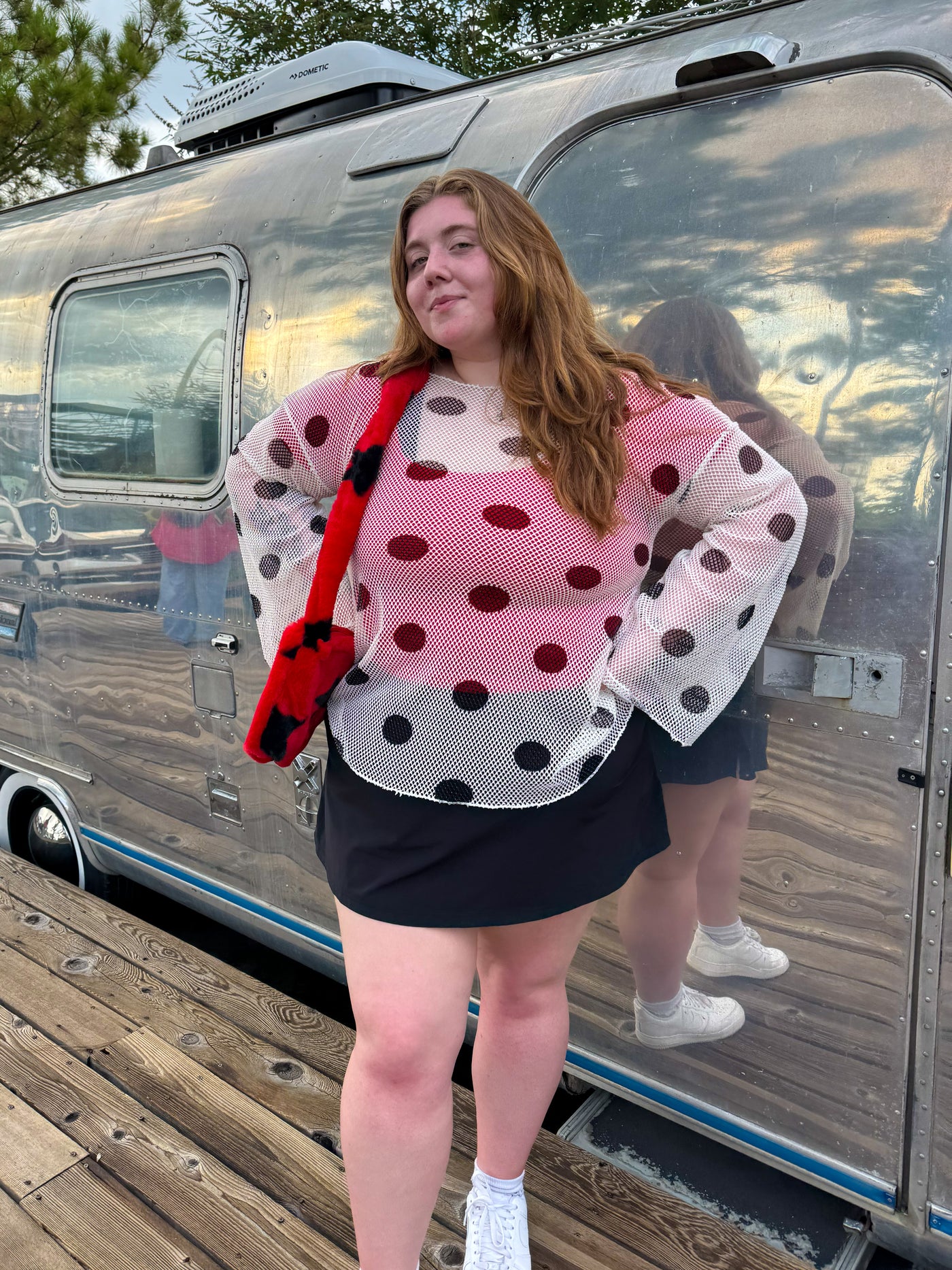 THE GO-TO MESH LAYERING TOP OF THE YEAR!!!! Feel free to style this top with every color in the rainbow- either under the top or with some cute colorful bottoms! The polka dots make it fun to play around with patterns, and let's the pop-of-color tank top of your choice peek out! We love styling this top over tank tops, baby tees, long sleeves- and we can't wait to style it with more!