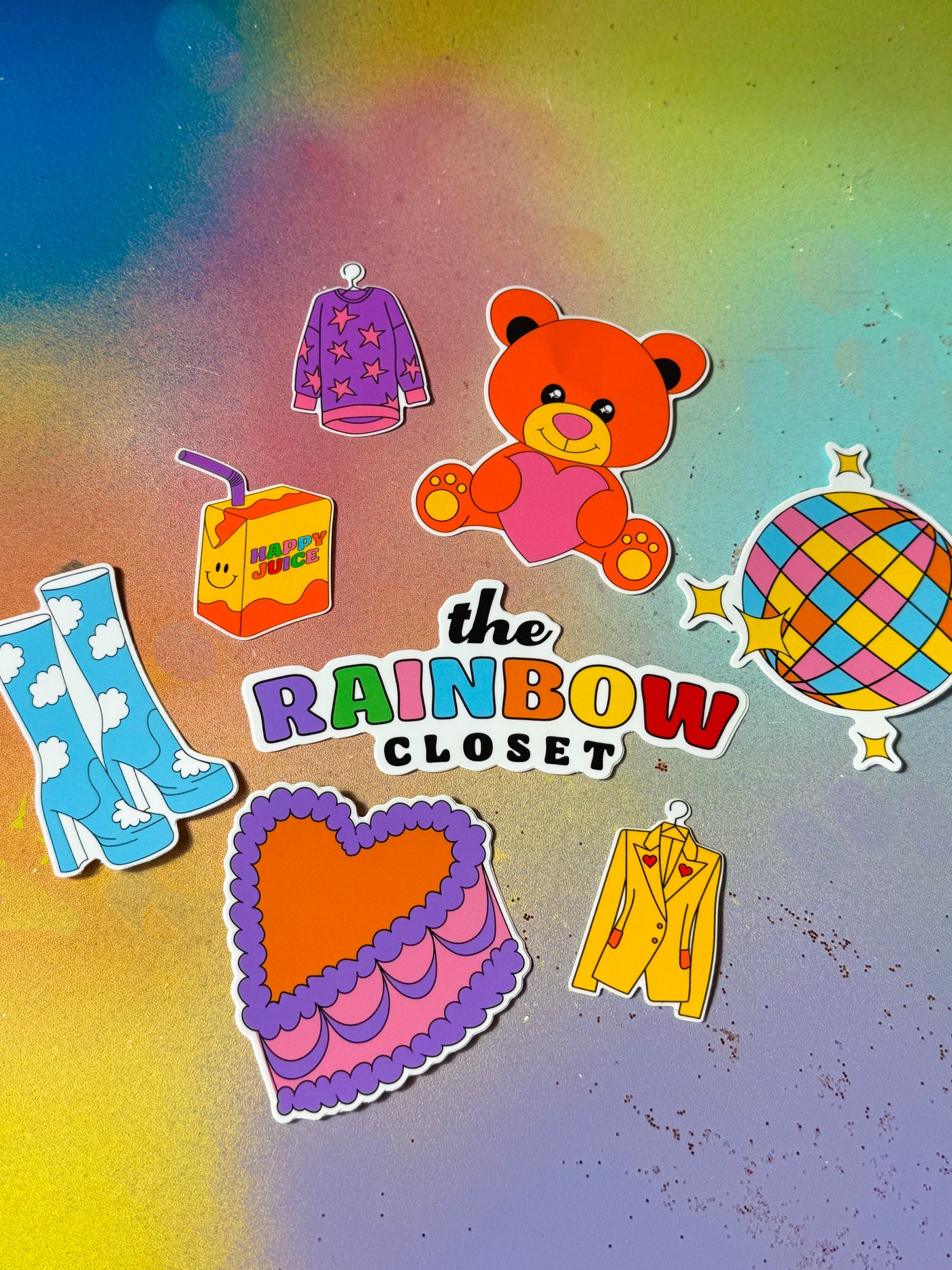 This adorable sticker is a Rainbow Closet original. It features super bold colors. You can stick it on your laptop, water bottle, or notebook to bring some extra fun to your items!