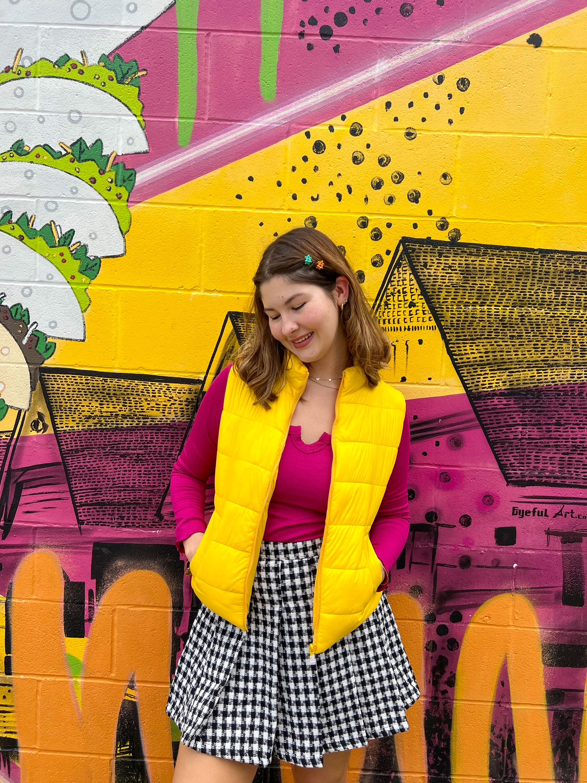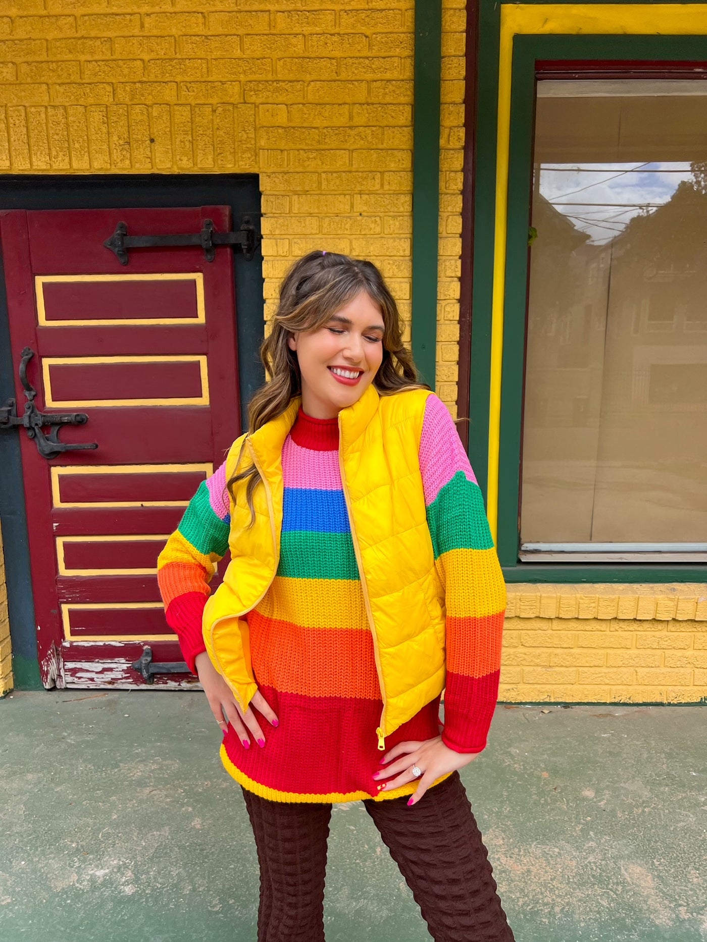 A puffer vest as bright as your personality! The Sunshine Puffer Vest is the perfect mix of fun and practical with its bright yellow color and effortless layering capabilities. It is lightweight enough to be worn through the warmer fall days but can be layered with heavier sweaters to keep you warm (and colorful) for winter. We paired ours with the Cranberry Longsleeve and the Crayon Box Rainbow Sweater.