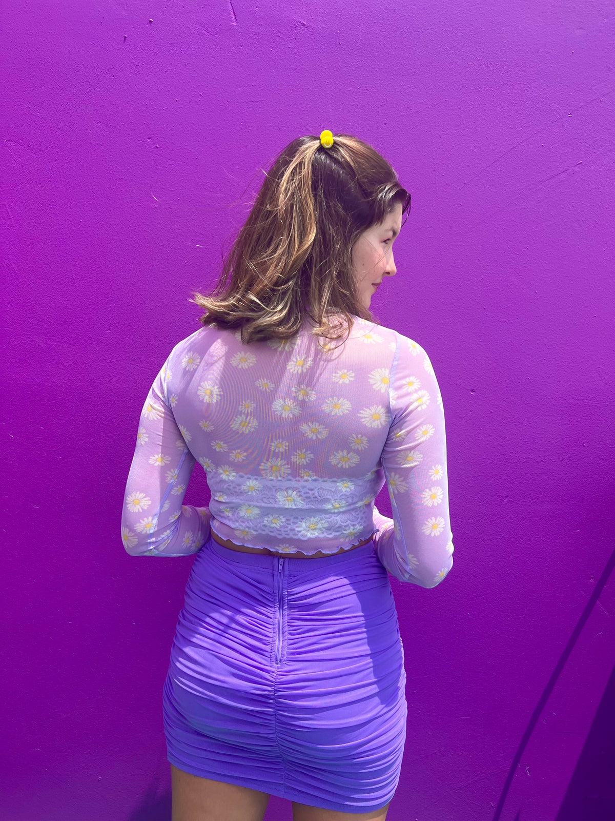 Go pick some Fresh Violets in this trendy draped skirt. Its perfect for adding a little flair to any outfit. The fabric has some stretch and is fully lined. Seen paired with the lemons and limes tank.