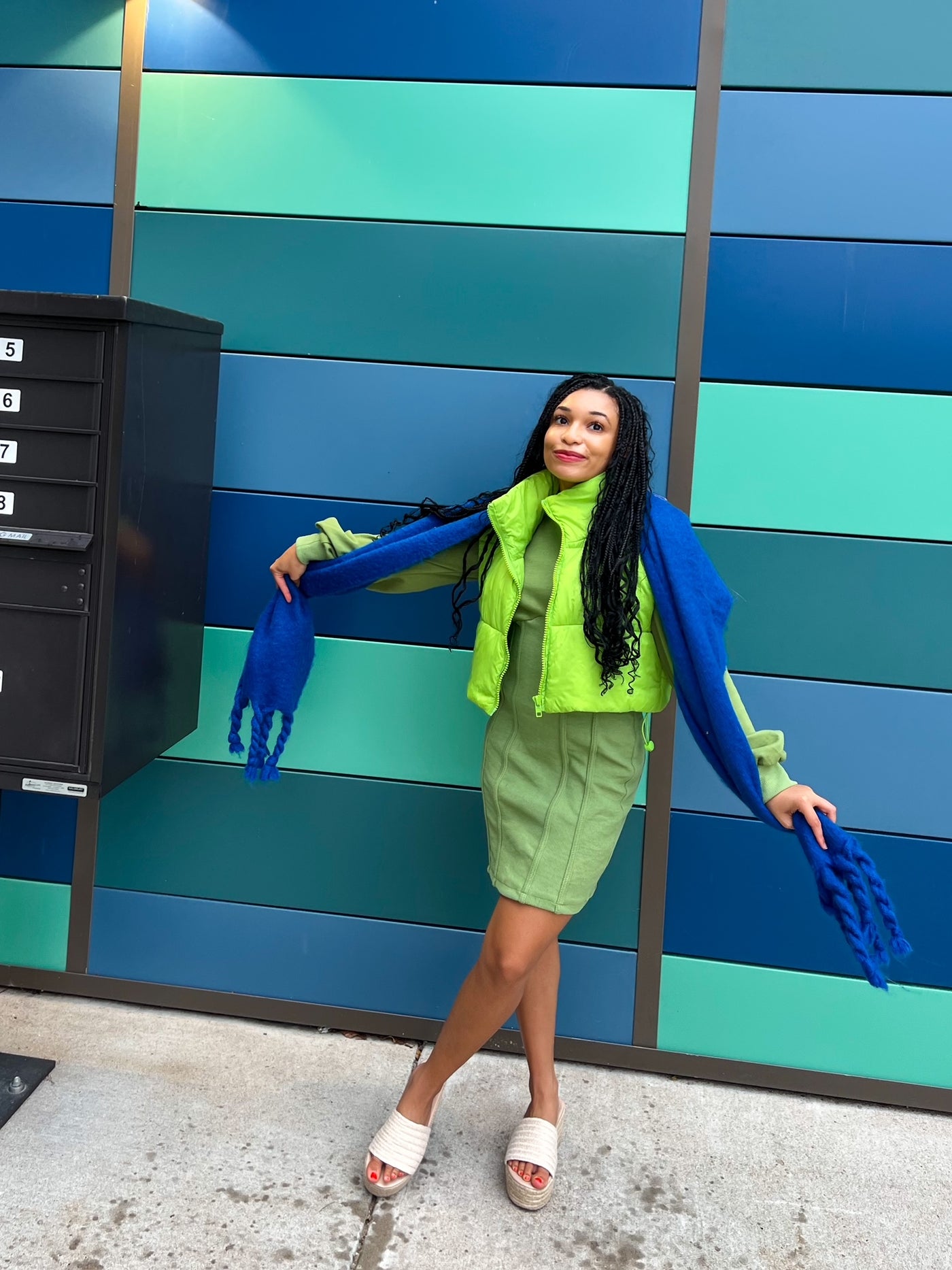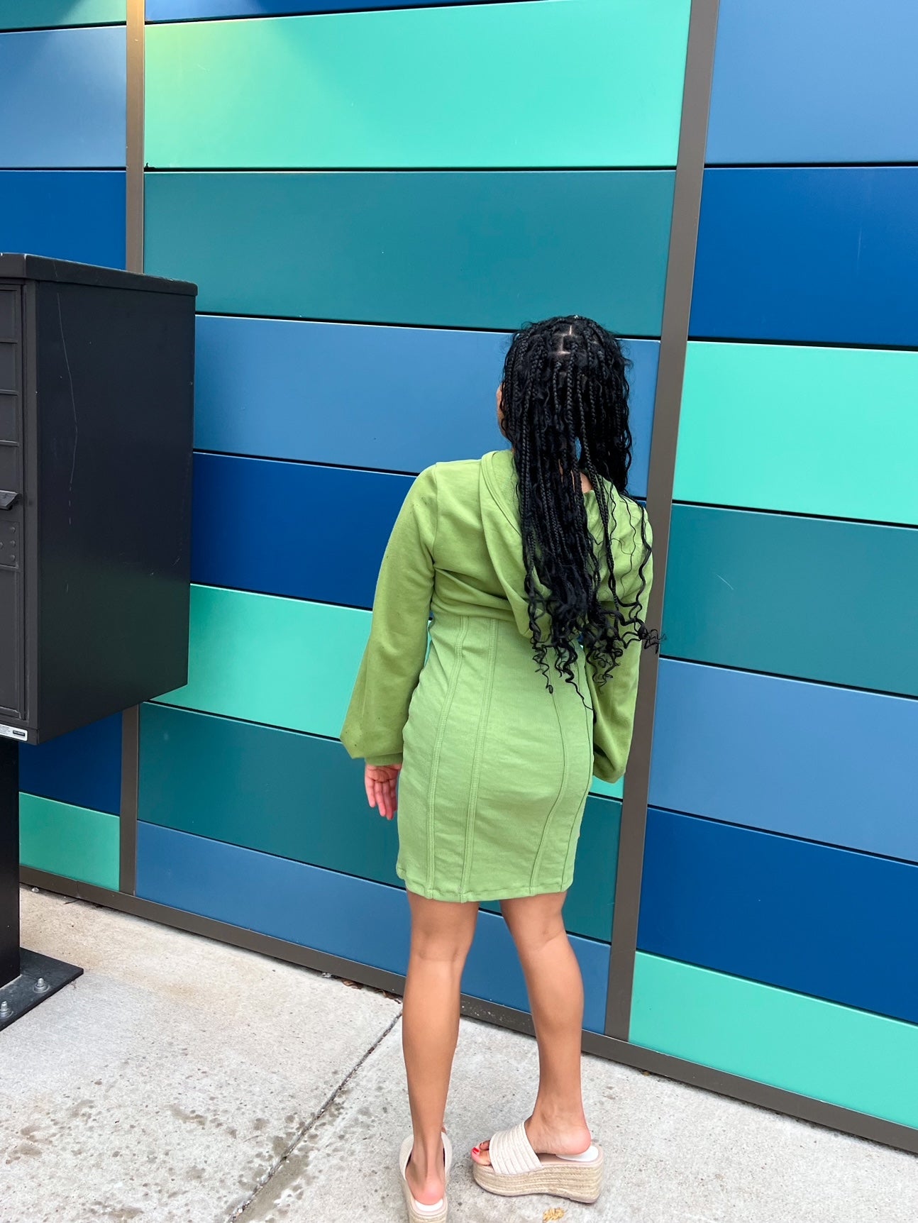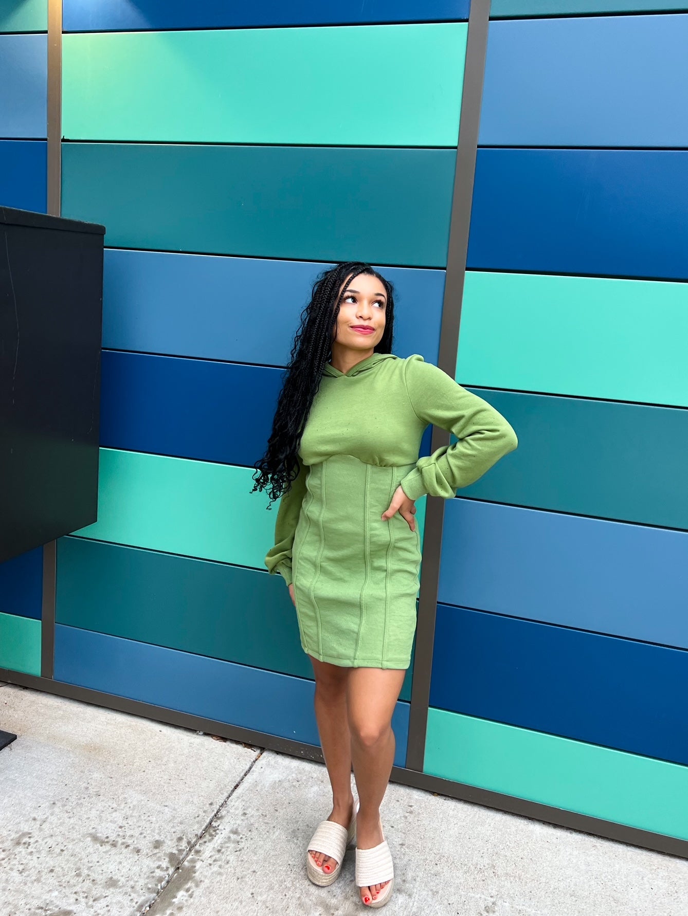 Stay comfortable on the go with our sweatshirt mini dress. This dress features a stretchy bodice and a hoodie material up top. Seen paired with the Treat Yourself gogo boots.