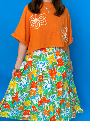 Feeling like a sunbeam everytime we wear this top!! This tangerine knit top is the perfect lightweight essential- and it is SO fun to style! Pair it with shorts, maxi skirts, jeans, fun pants- you name it!! This flower detail on this top make us feel like we are in Bikini Bottom!! Style with every color in the rainbow- but we love it with greens, pinks, and blues the most!!