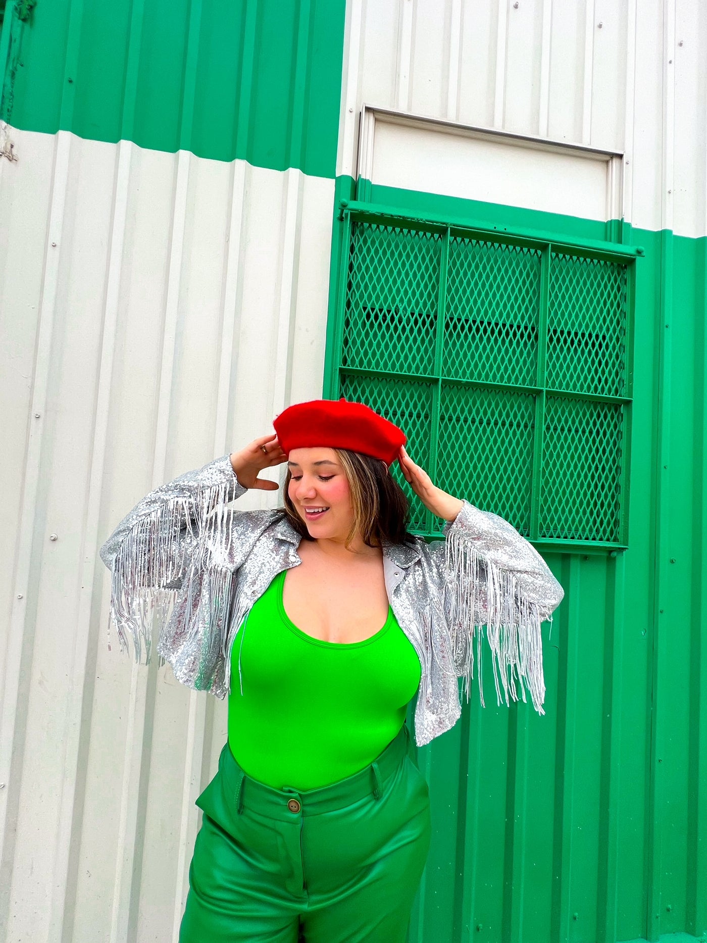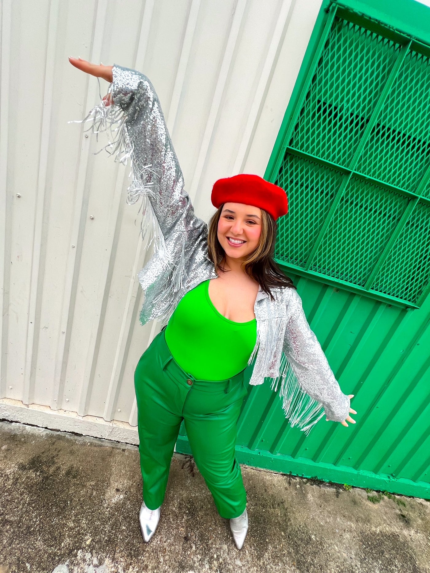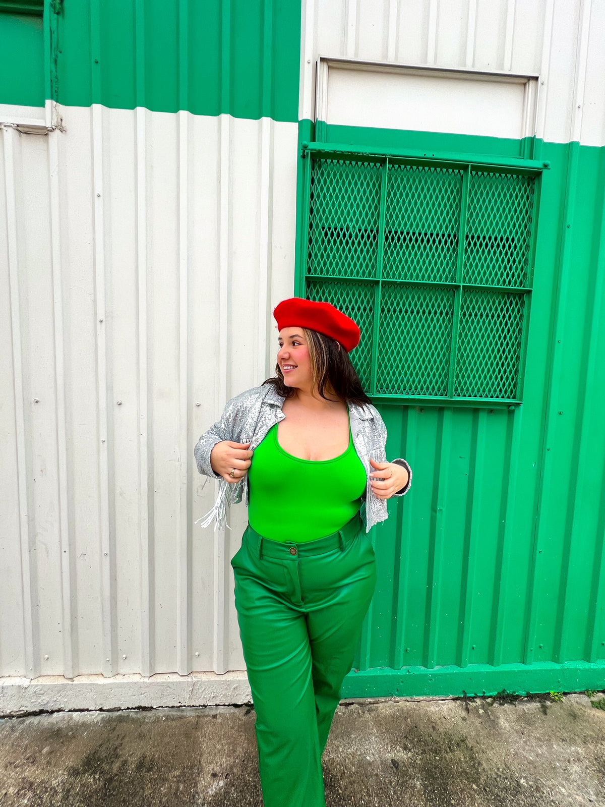 The Take a Moment Bodysuit in vibrant green is a must-have layering item. This bodysuit is super stretchy and has a racerback style. Seen paired with the Starlight Sequin Flare pants.