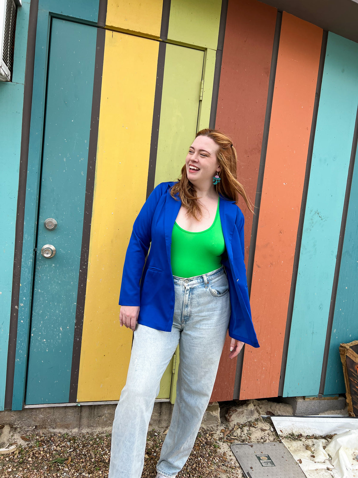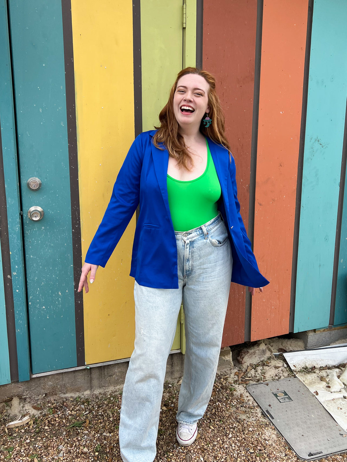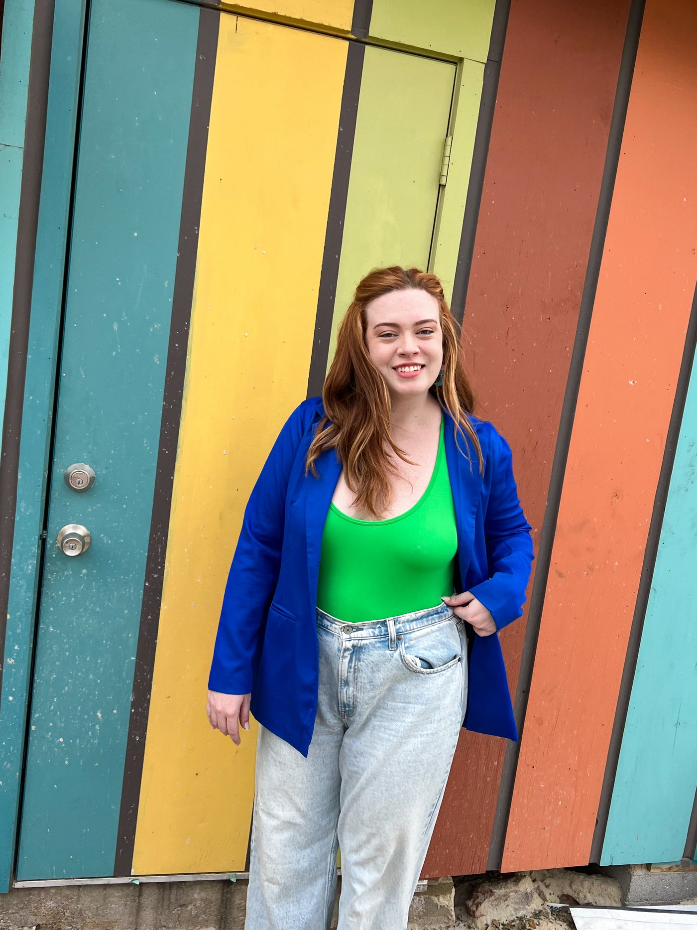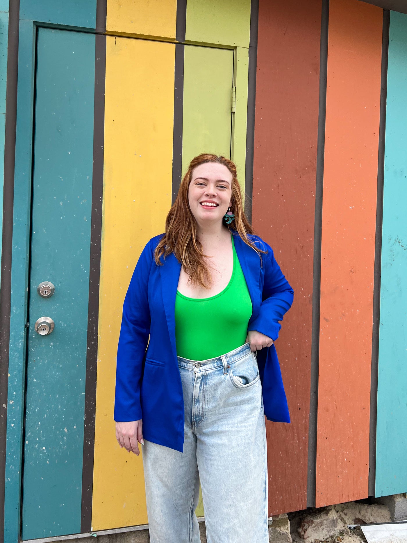 The Take a Moment Bodysuit in vibrant green is a must-have layering item. This bodysuit is super stretchy and has a racerback style. Seen paired with the Starlight Sequin Flare pants.